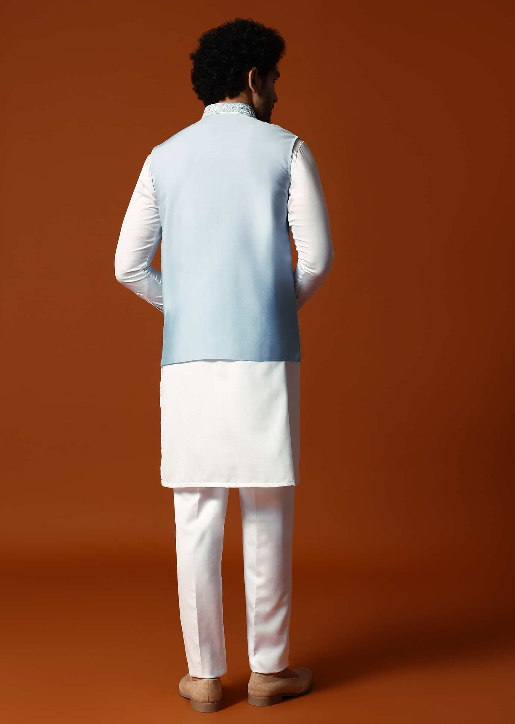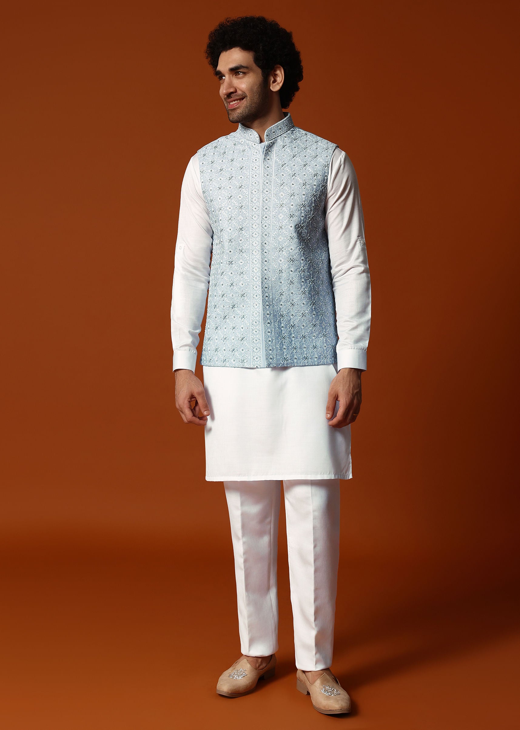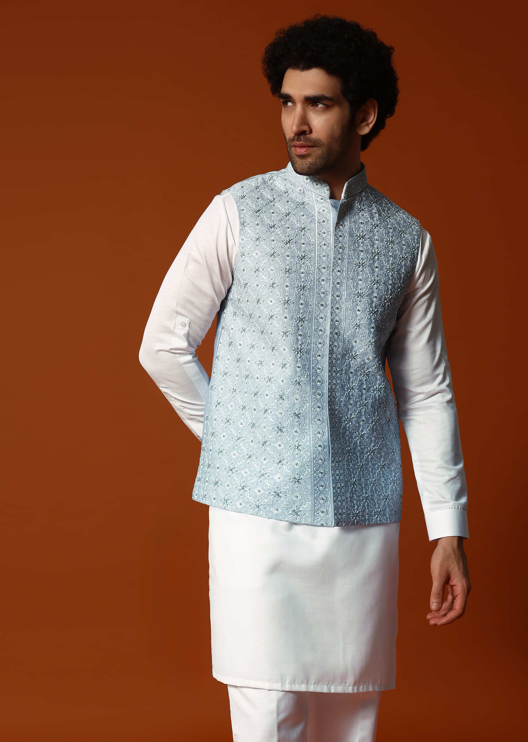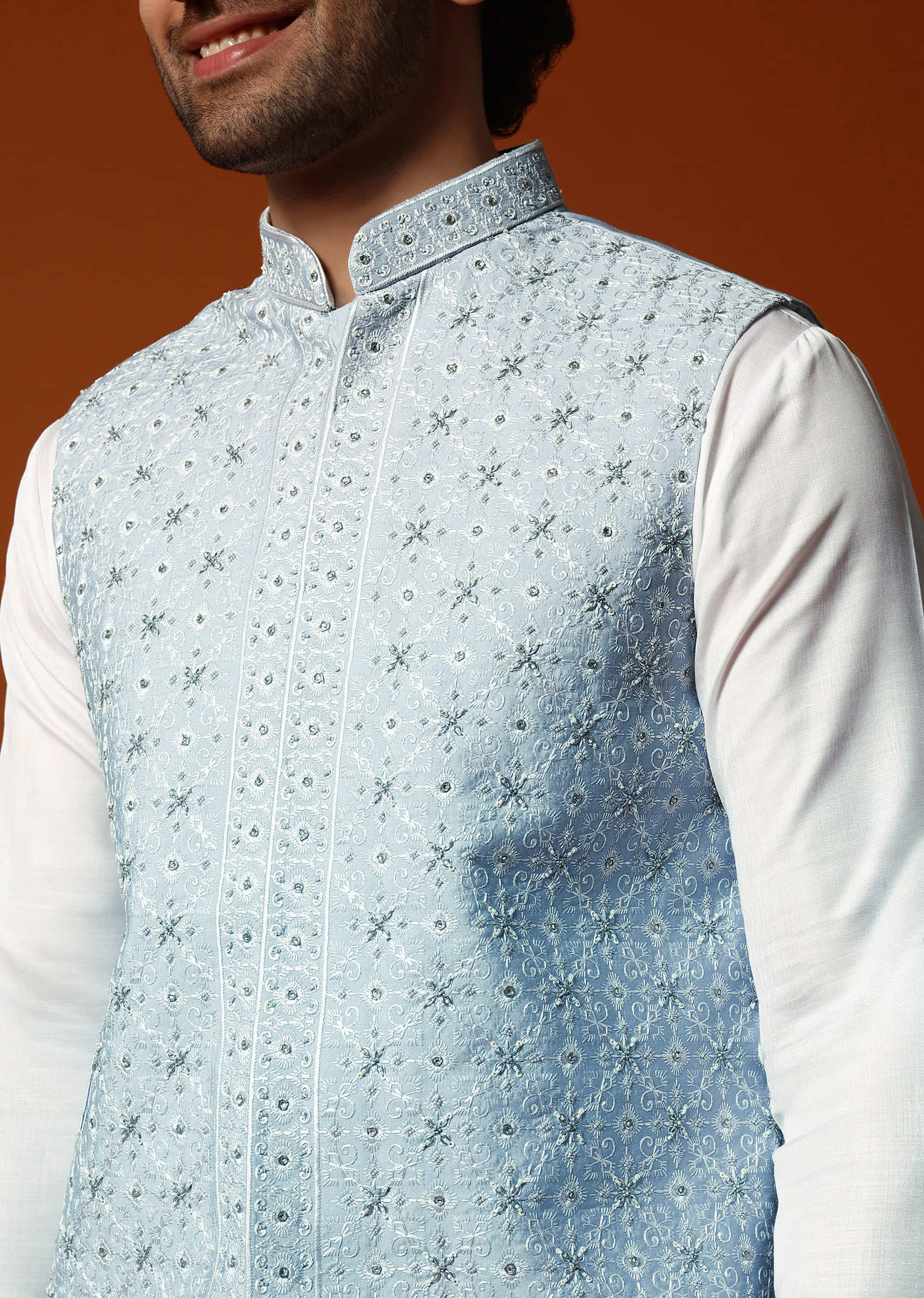 Sky Blue Silk Kurta Jacket Set In Resham Work For Men