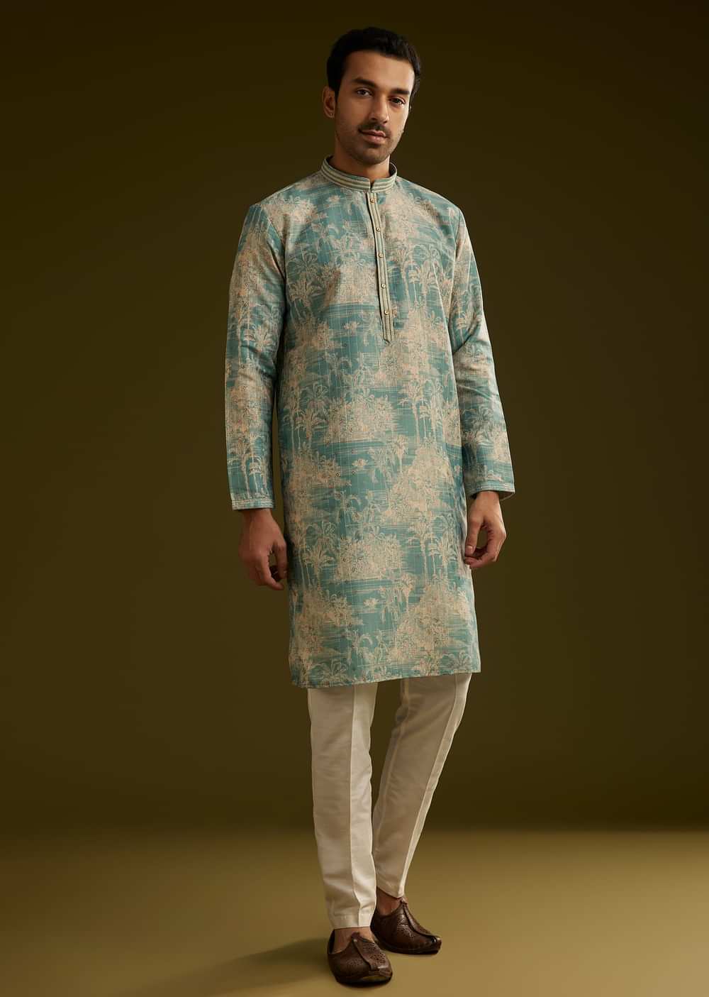 A refreshing sky blue silk kurta set with classic tree motif prints. The mandarin collar and full sleeves add a touch of modern grace to this traditional outfit..Awarded As The Most Trusted Brand We'Re Delivering Styles You Love Just As Promised.