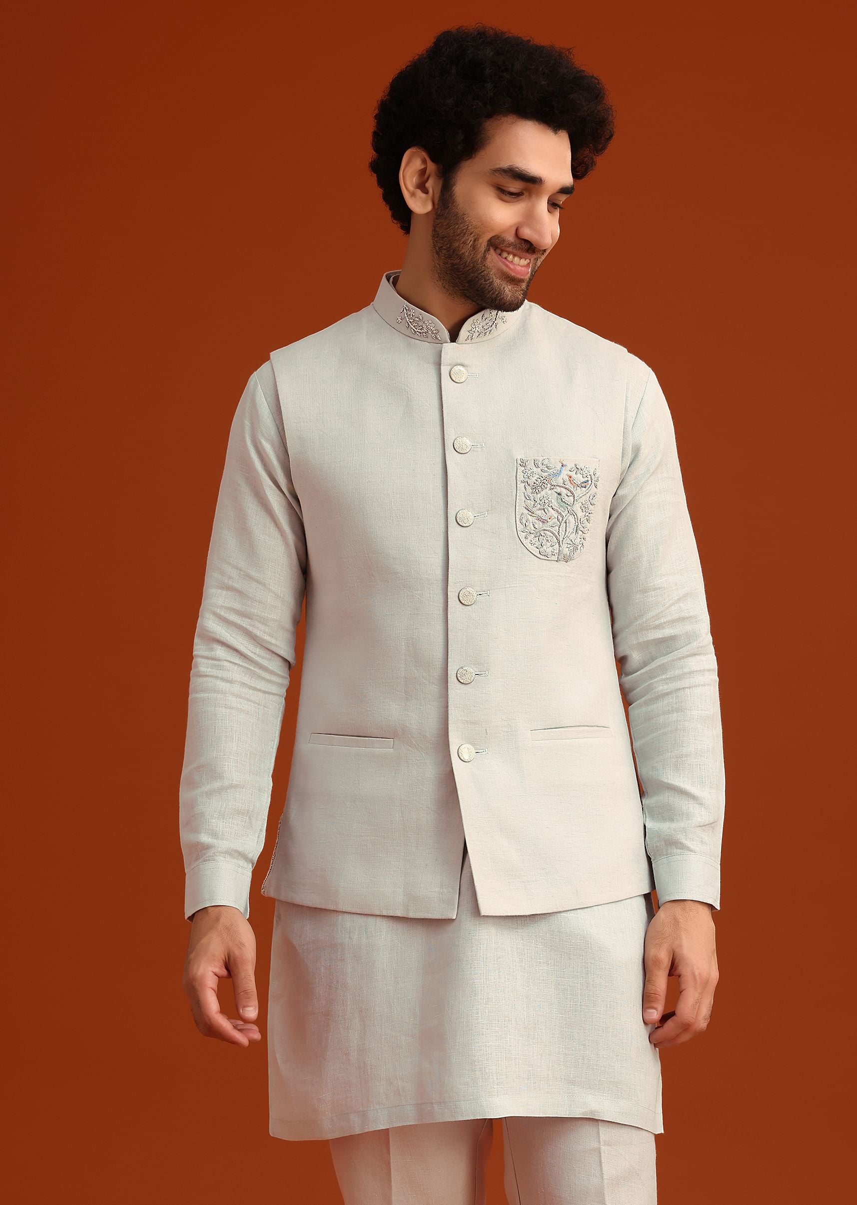 - It is delicately adorned with intricate zardosi work on the collar and the pocket.
