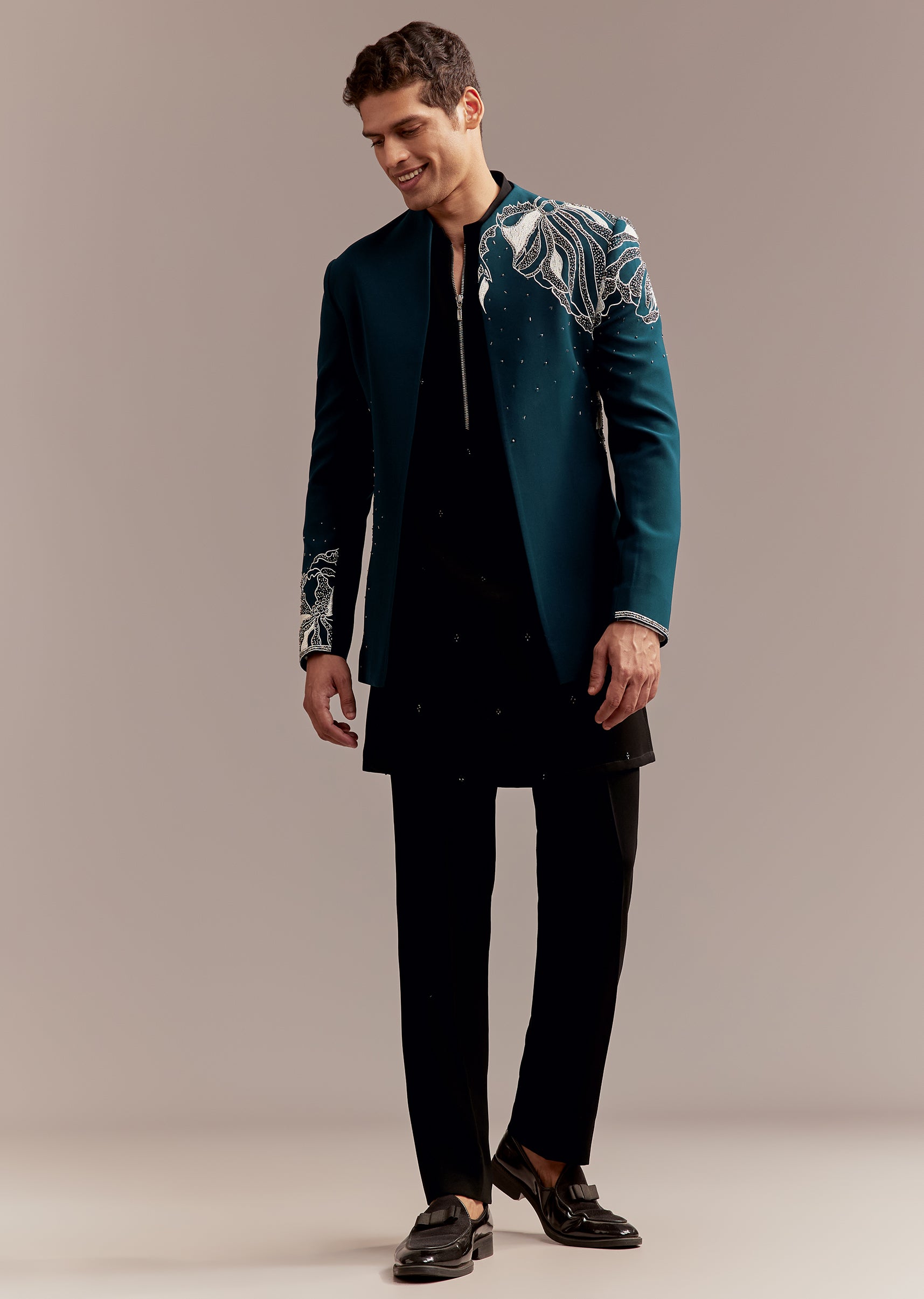Bold and contemporary, this teal blue indo-western set features heavy embroidery and a modern silhouette. Designed for statement dressing, it pairs seamlessly with the embroidered saree for evening events.