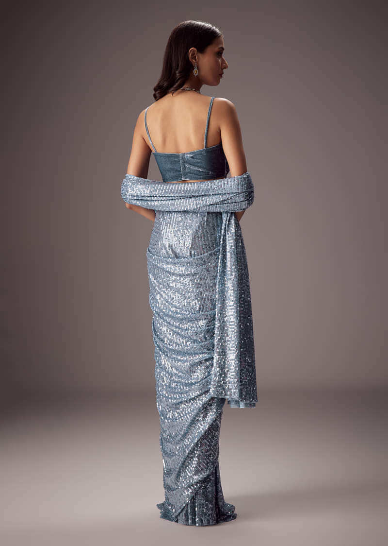 Steel Blue Sequin Saree Paired With A Plush Velvet blouse