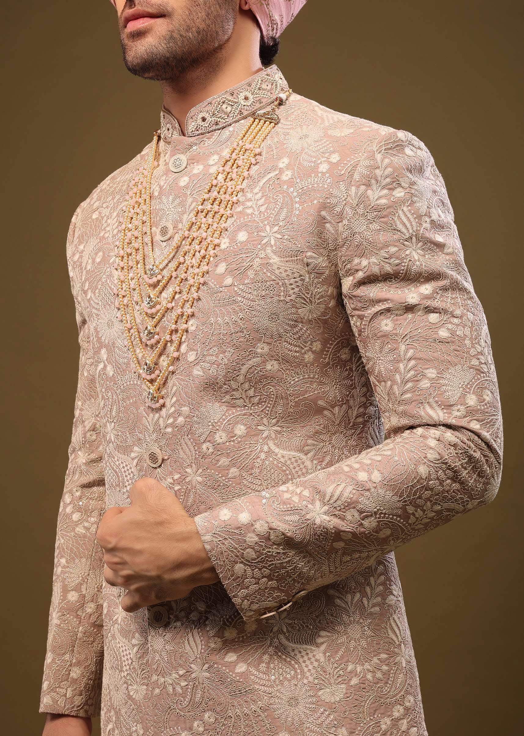 - An enticing stucco beige sherwani set fabricated in silk crafted in a hand-embroidered zari and sequins work in a beautiful floral design.