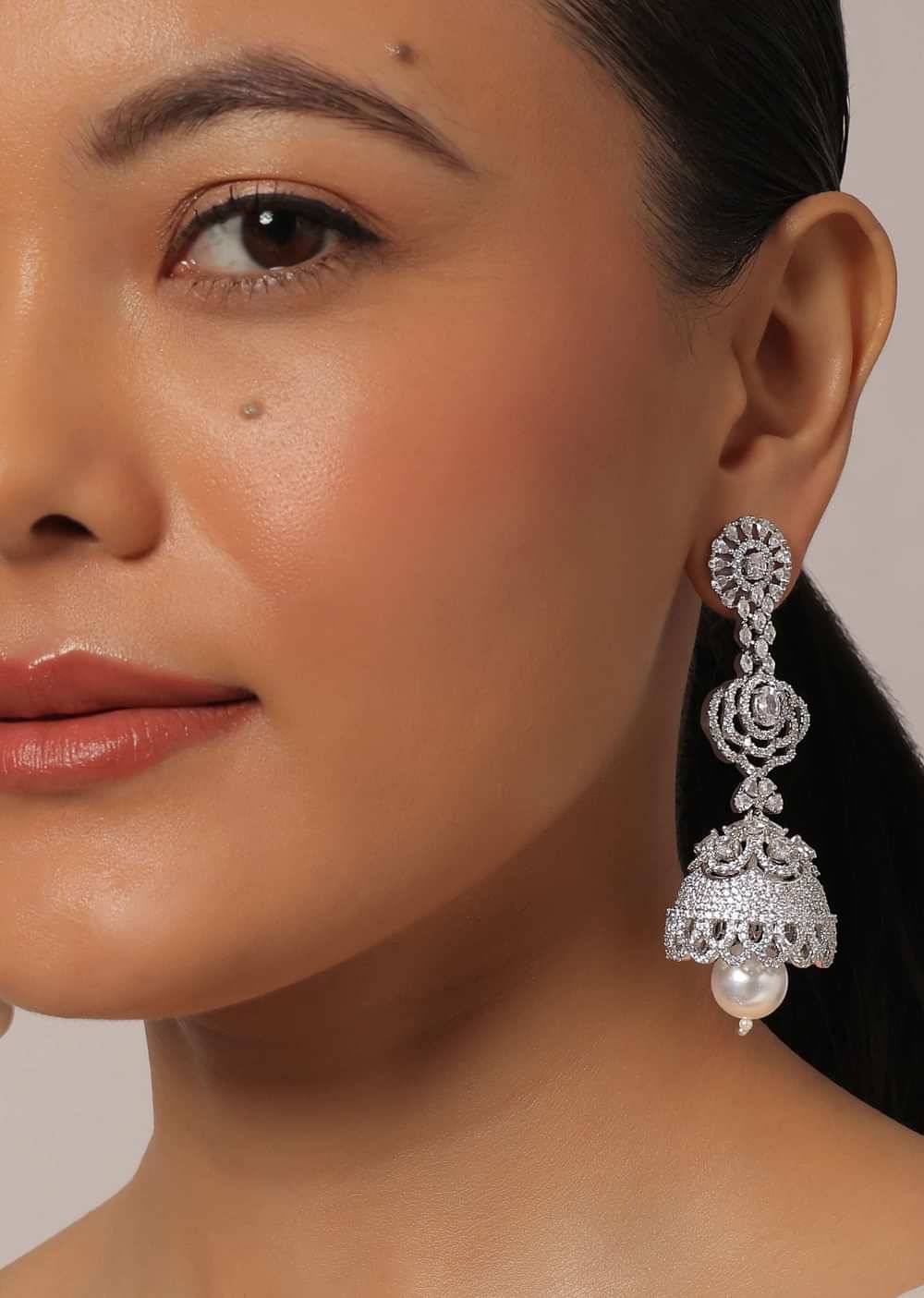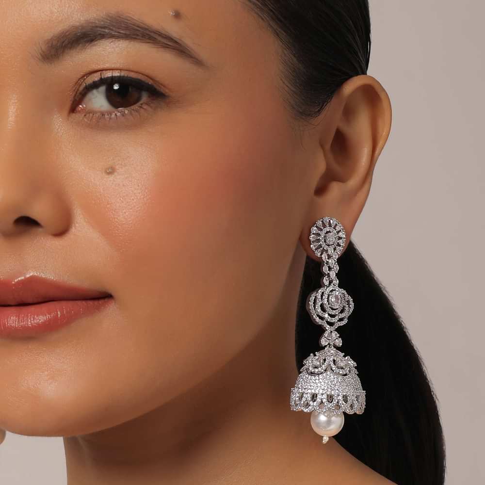 - The gracefully dangling jhumka is adorned with a lustrous pearl.