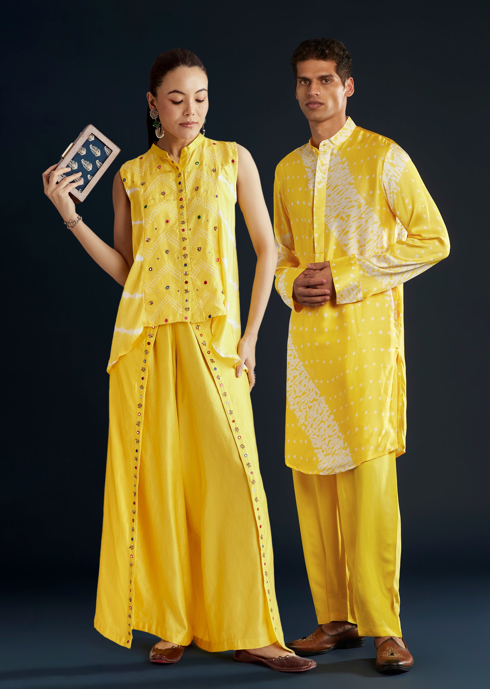 Sunlit Festive Couple Set – Yellow Satin Indo-Western Set For Her And Yellow Bandhani Shibori Kurta Set For Him