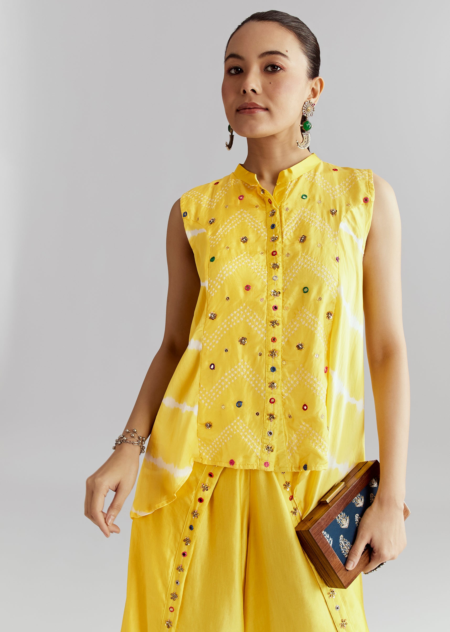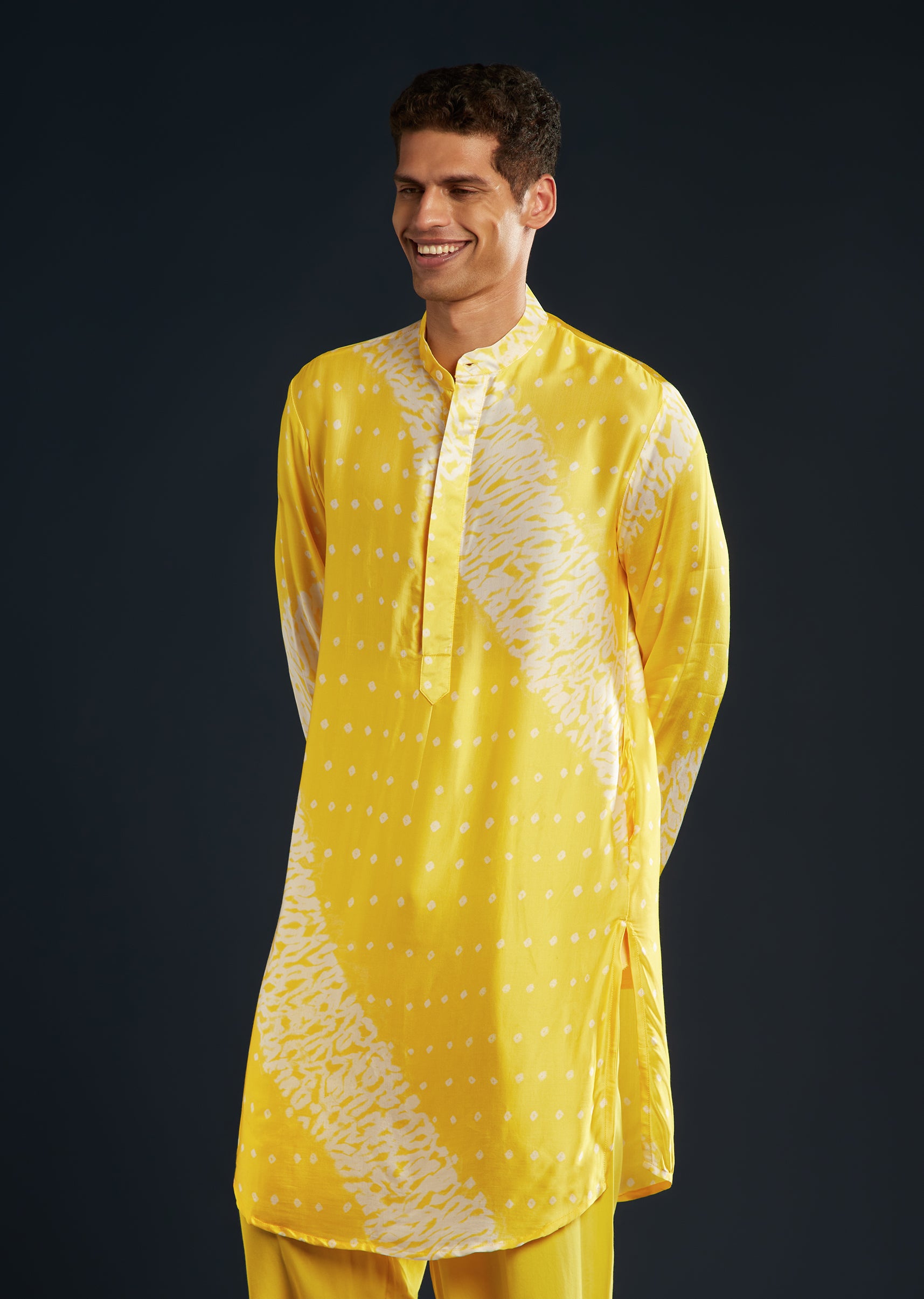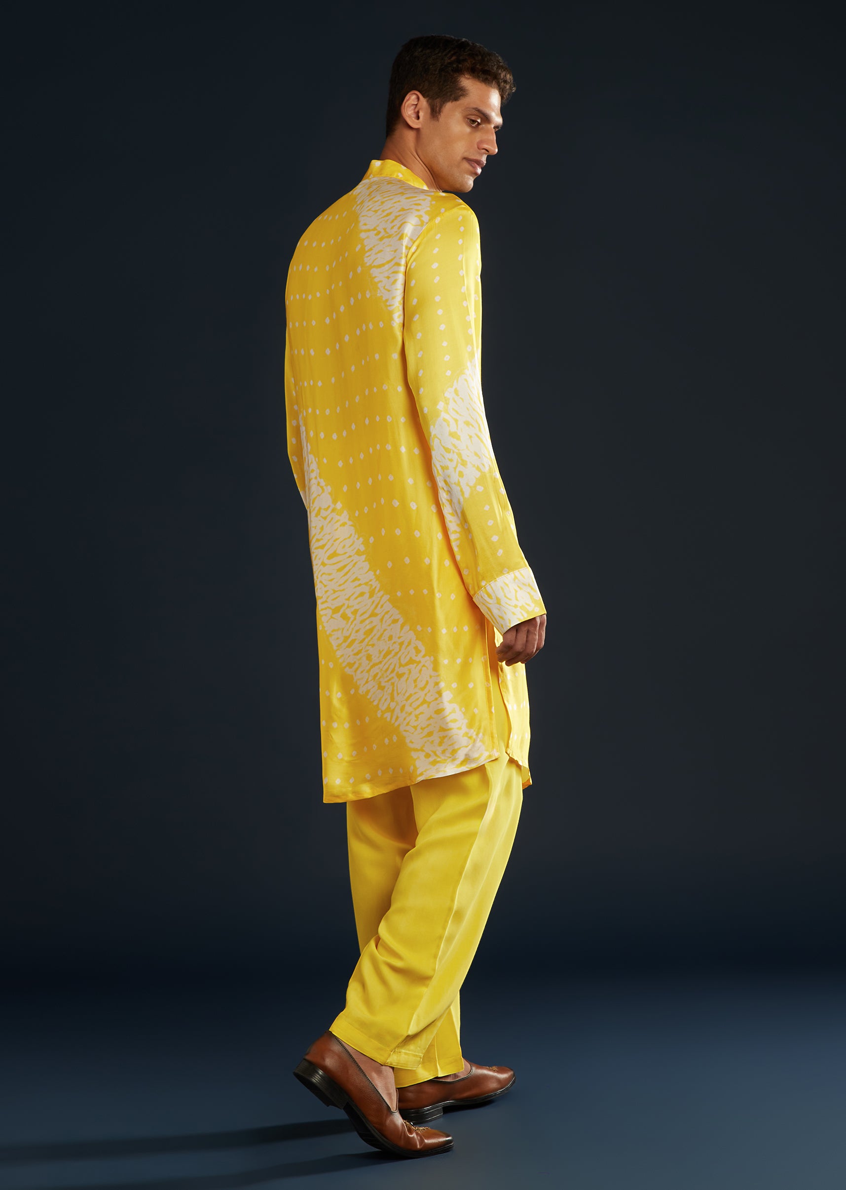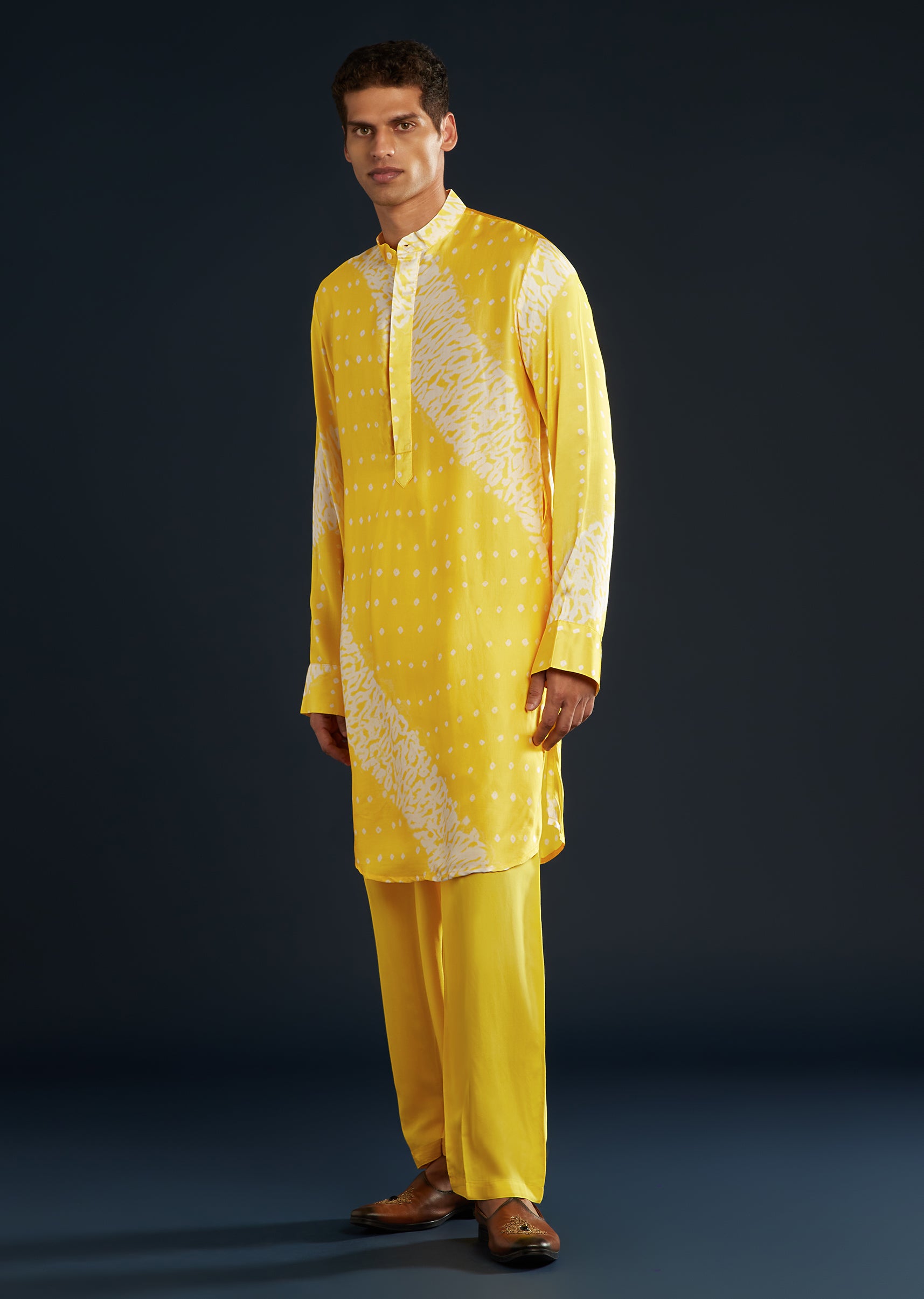 Bright and traditional, this yellow bandhani and shibori print kurta set pairs beautifully for lively festive events.