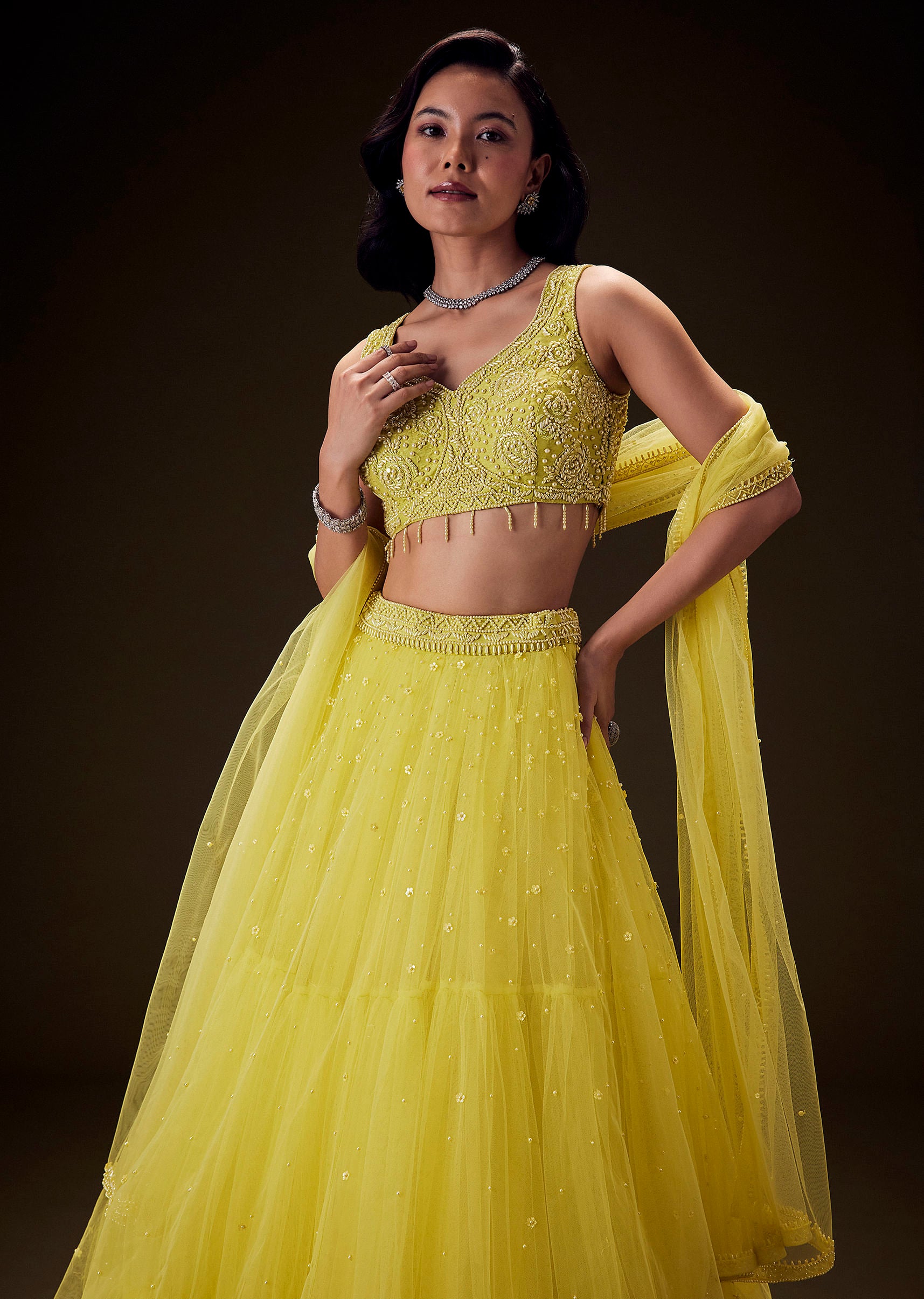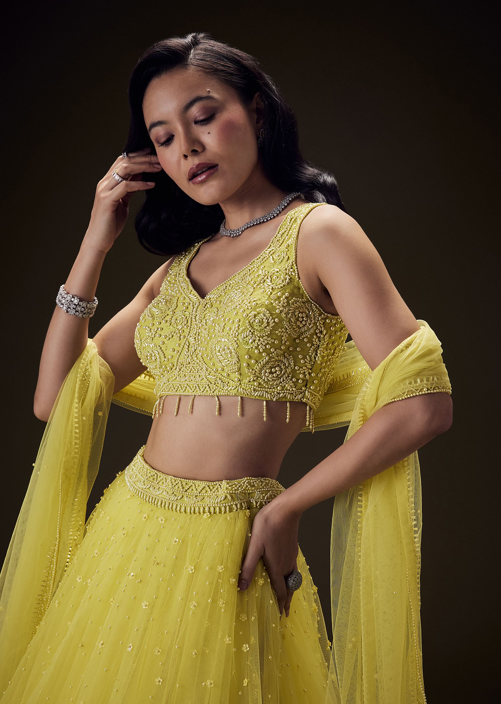 Sunshine Yellow Net Hand Embroided Pearl Work Lehenga Set