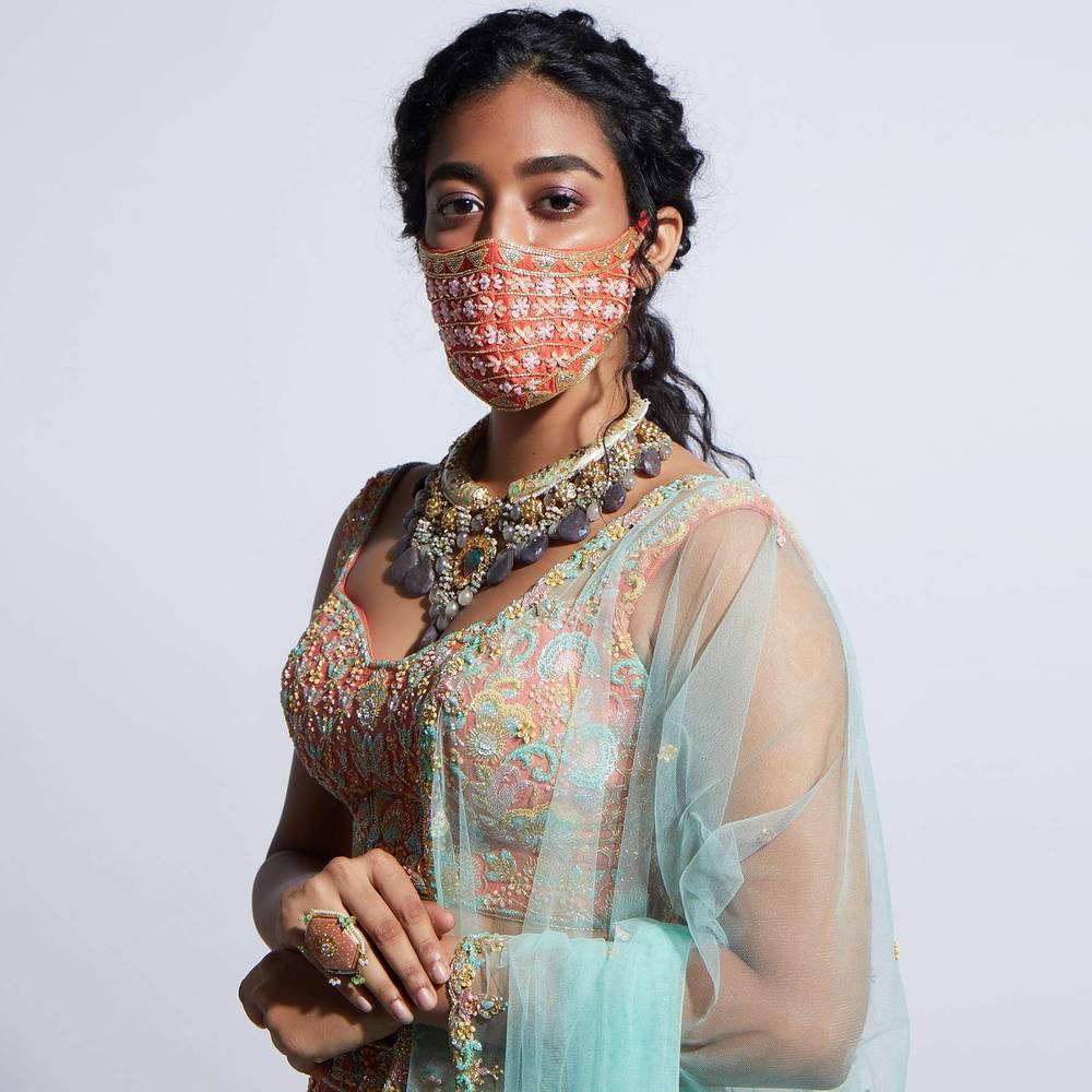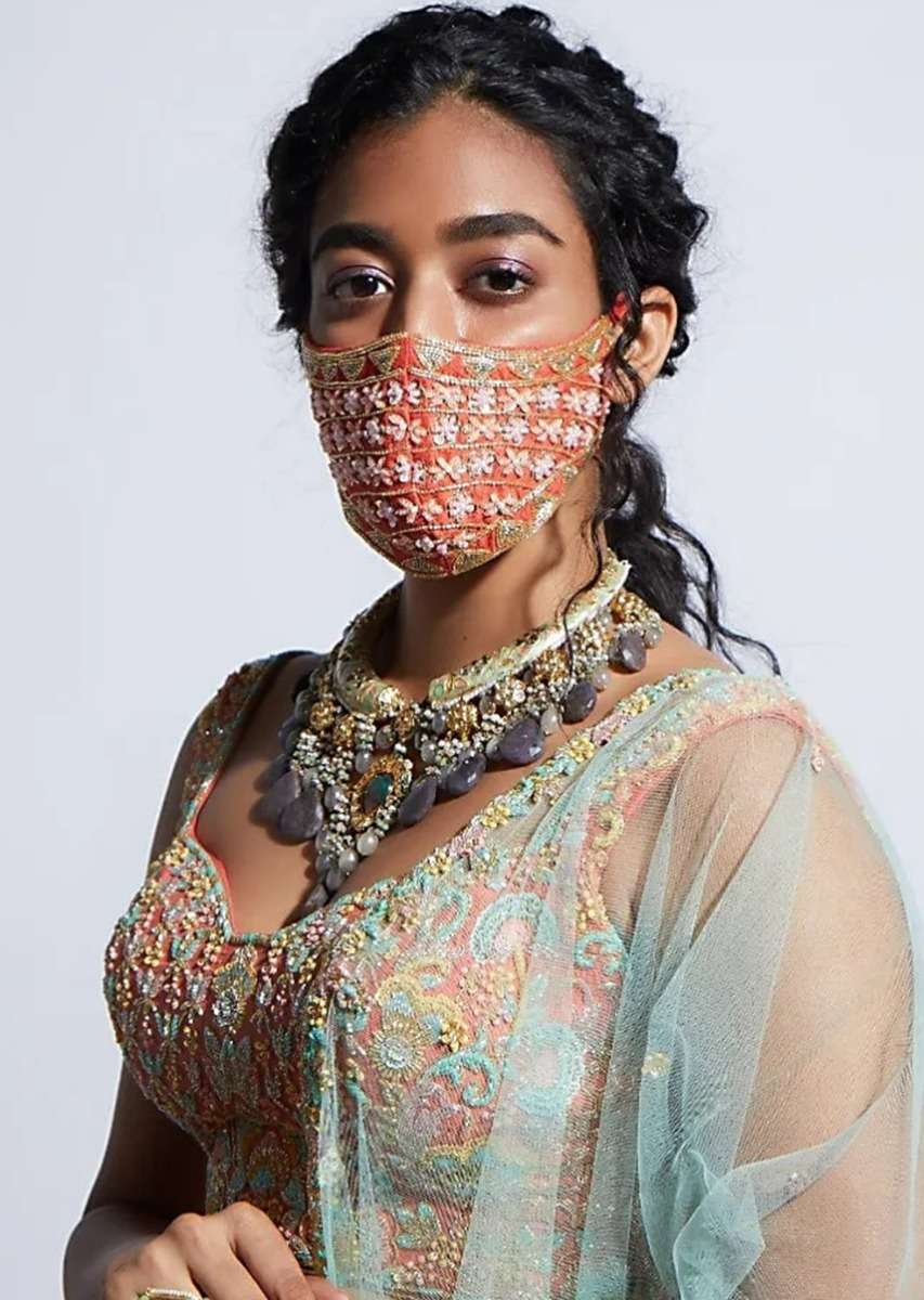 Tangerine Orange Face Mask With Sequins And Cut Dana Embroidered Buttis Online - Kalki Fashion