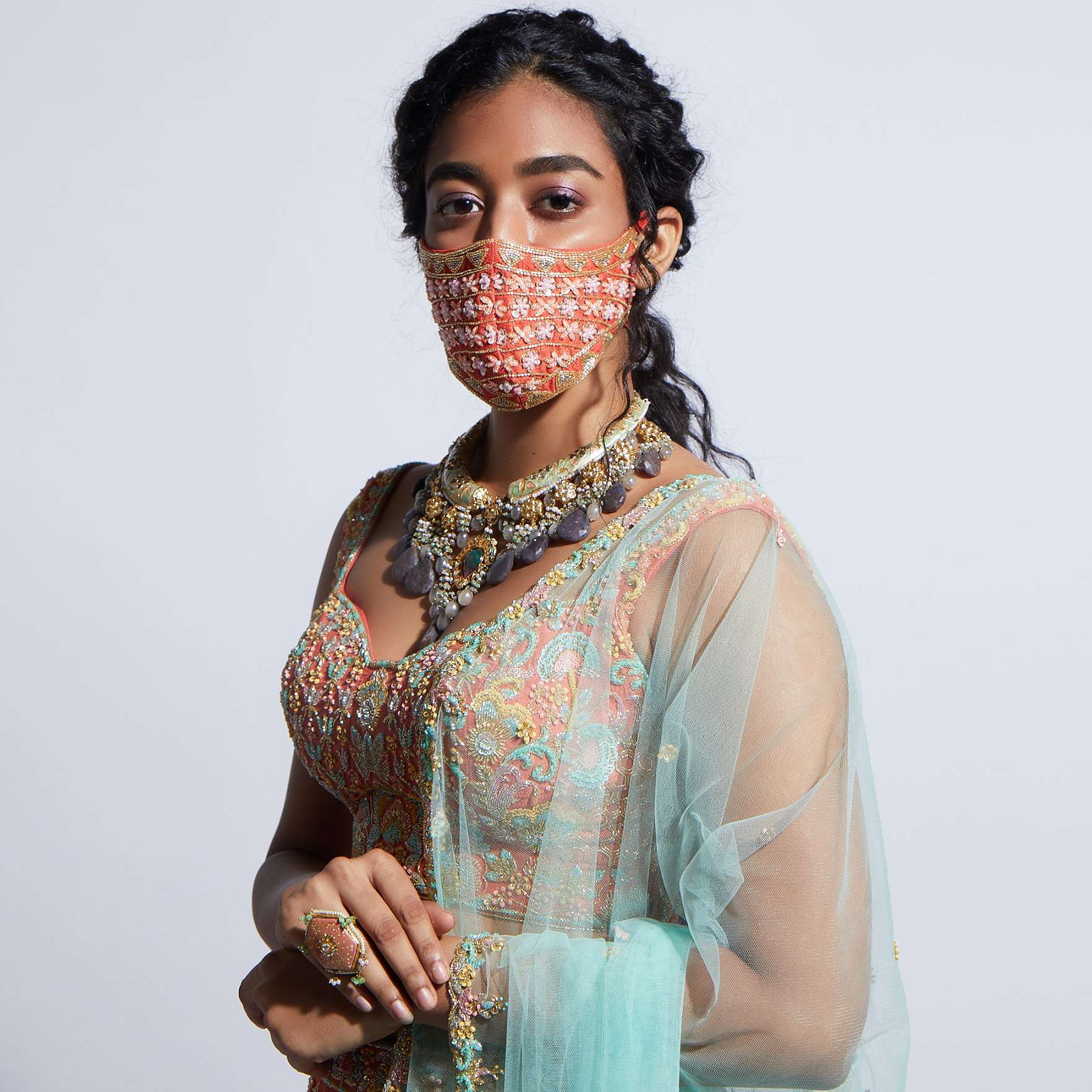 - Tangerine Orange Face Mask With Sequins And Cut Dana Embroidered Buttis .