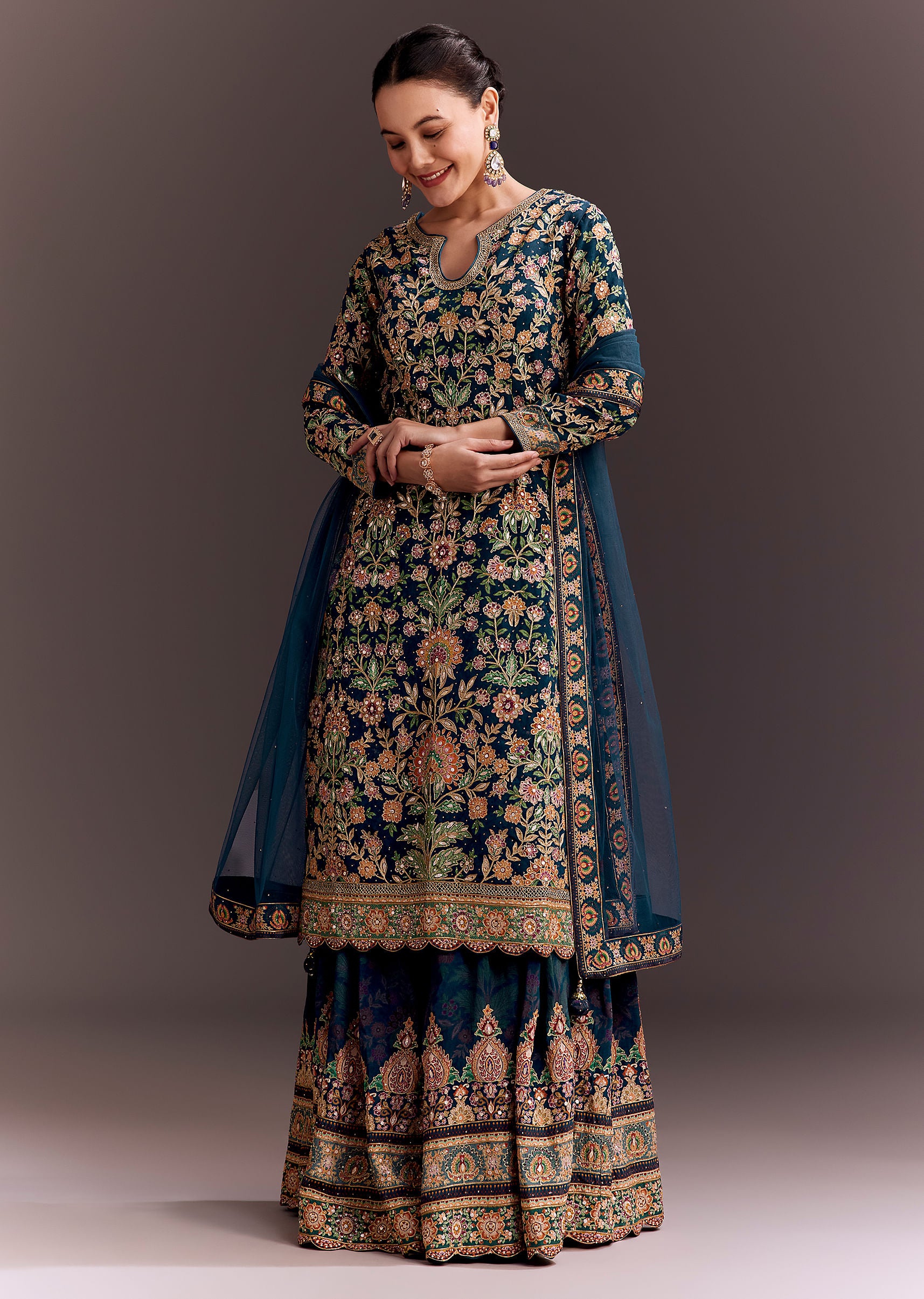 Ensure the kurta fits snugly at the shoulders and bust for a neat appearance, and check the palazzo length to graze the floor perfectly when worn with heels.