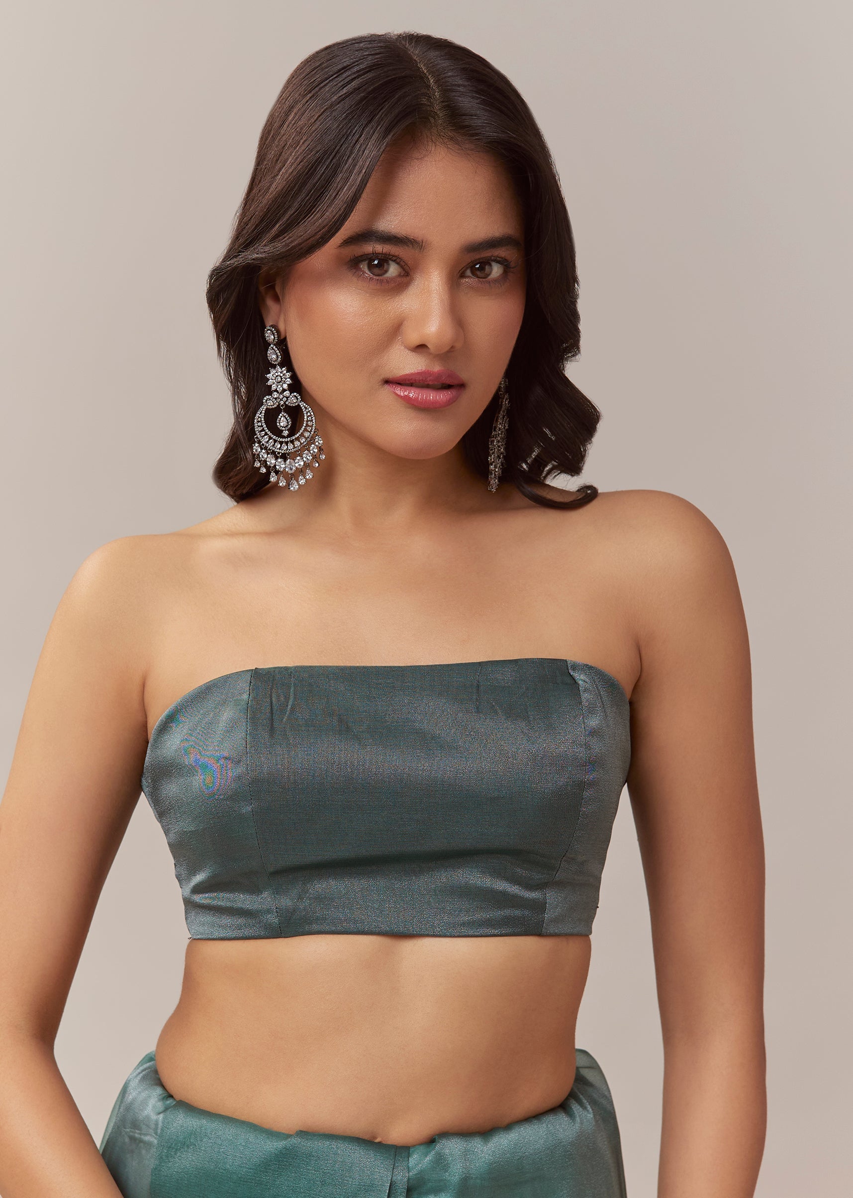 Pair it with emerald toned studs and metallic heels to enhance the rich teal shade and the shimmer of the cutwork border.