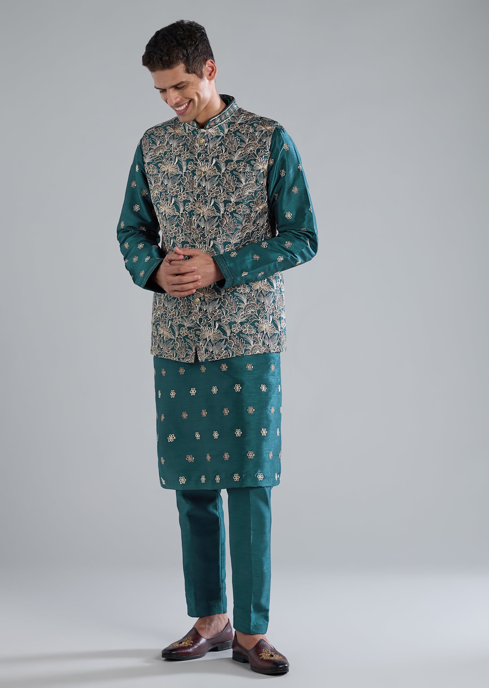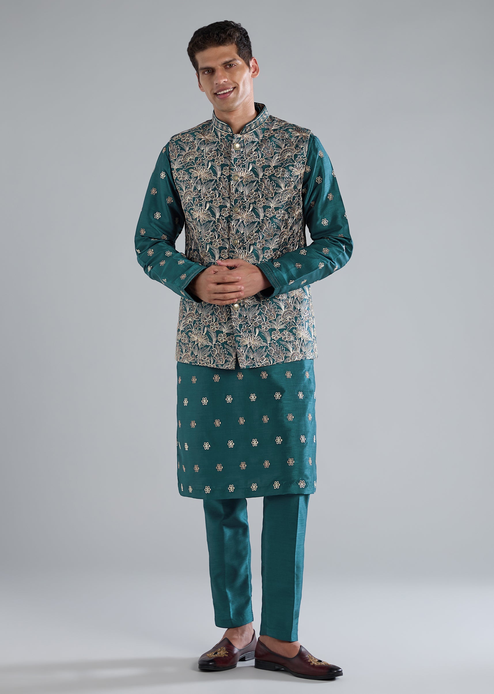 Vibrant and contemporary, this teal blue kurta jacket set stands out with its modern printed design and delicate resham detailing. Crafted in smooth silk for a polished sheen, the jacket sits over a contrasting kurta to give depth and dimension to the outfit. Full sleeves and a mandarin collar offer a refined silhouette, while the kurta and pants keep the look comfortable and celebration-ready. Perfect for mehendi, daytime festivities, or destination wedding functions. Awarded as the Most Trusted Brand, we're delivering styles you love, just as promised.