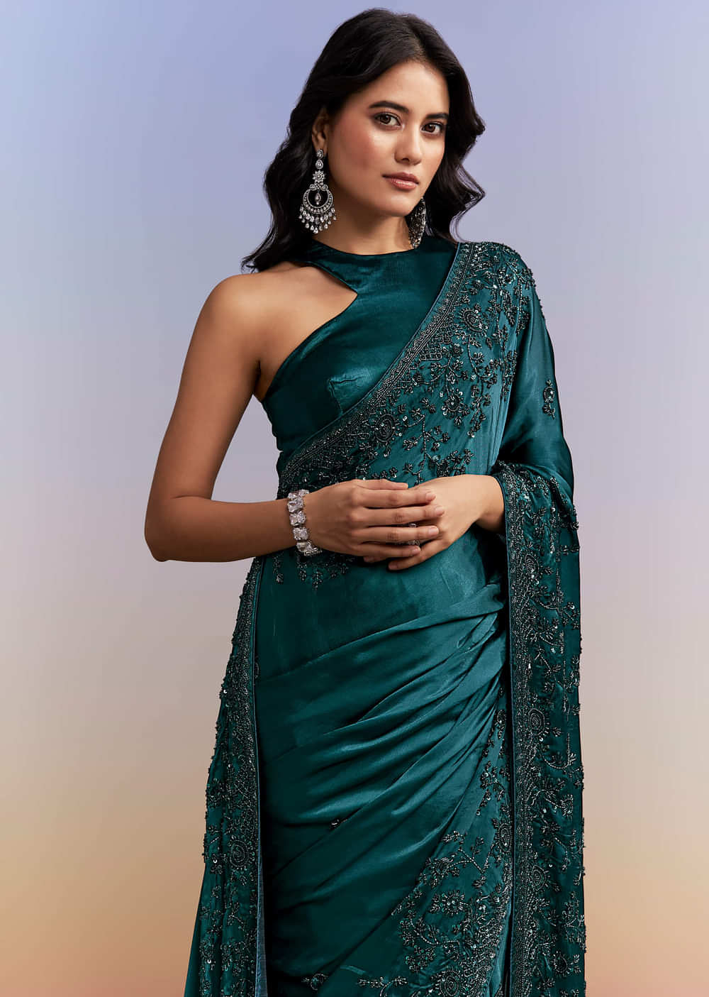 Teal Blue Satin Chinon Saree With Heavy Hand Embroidery