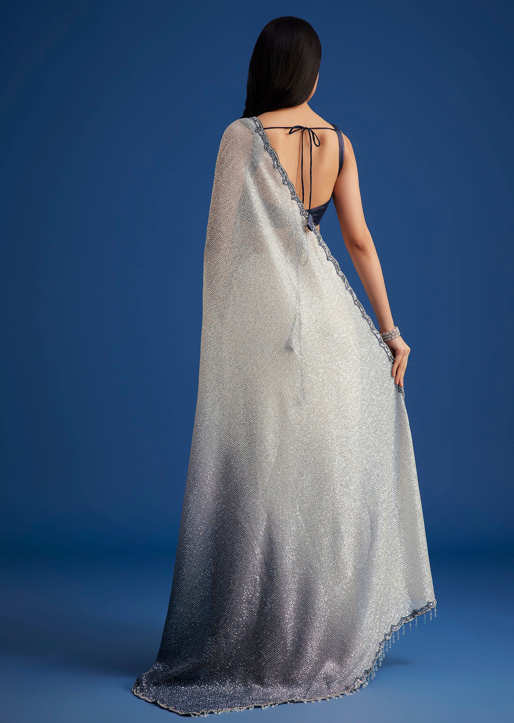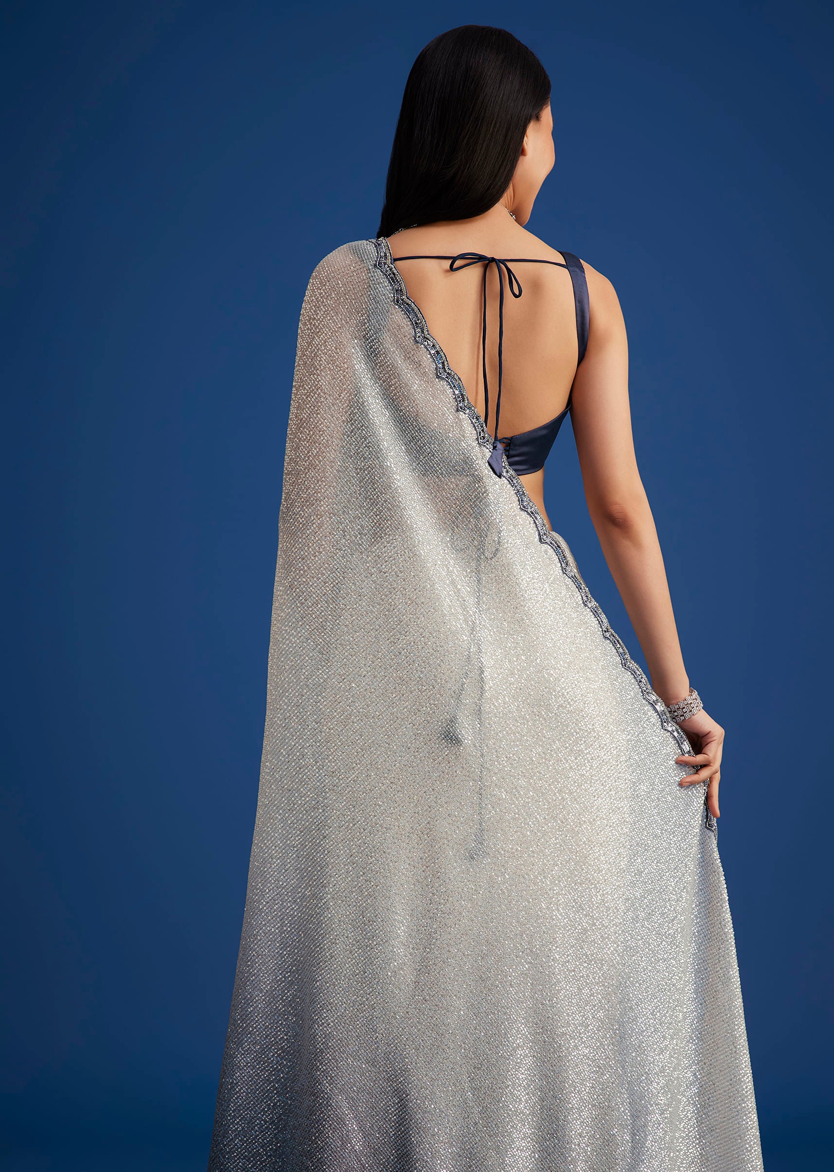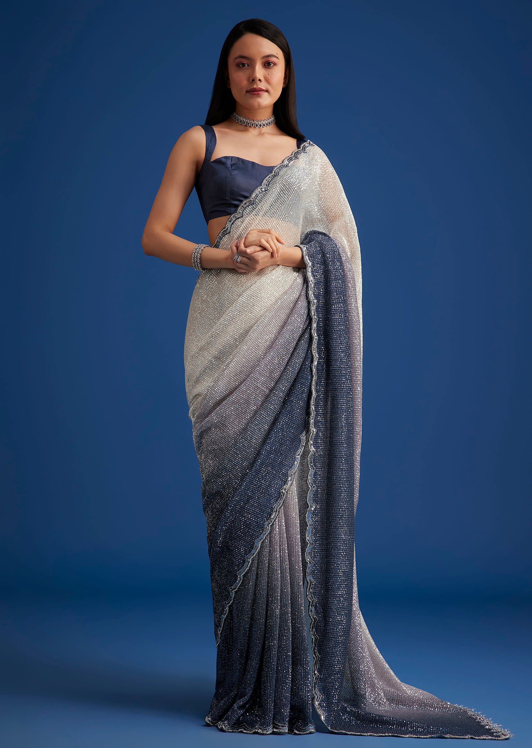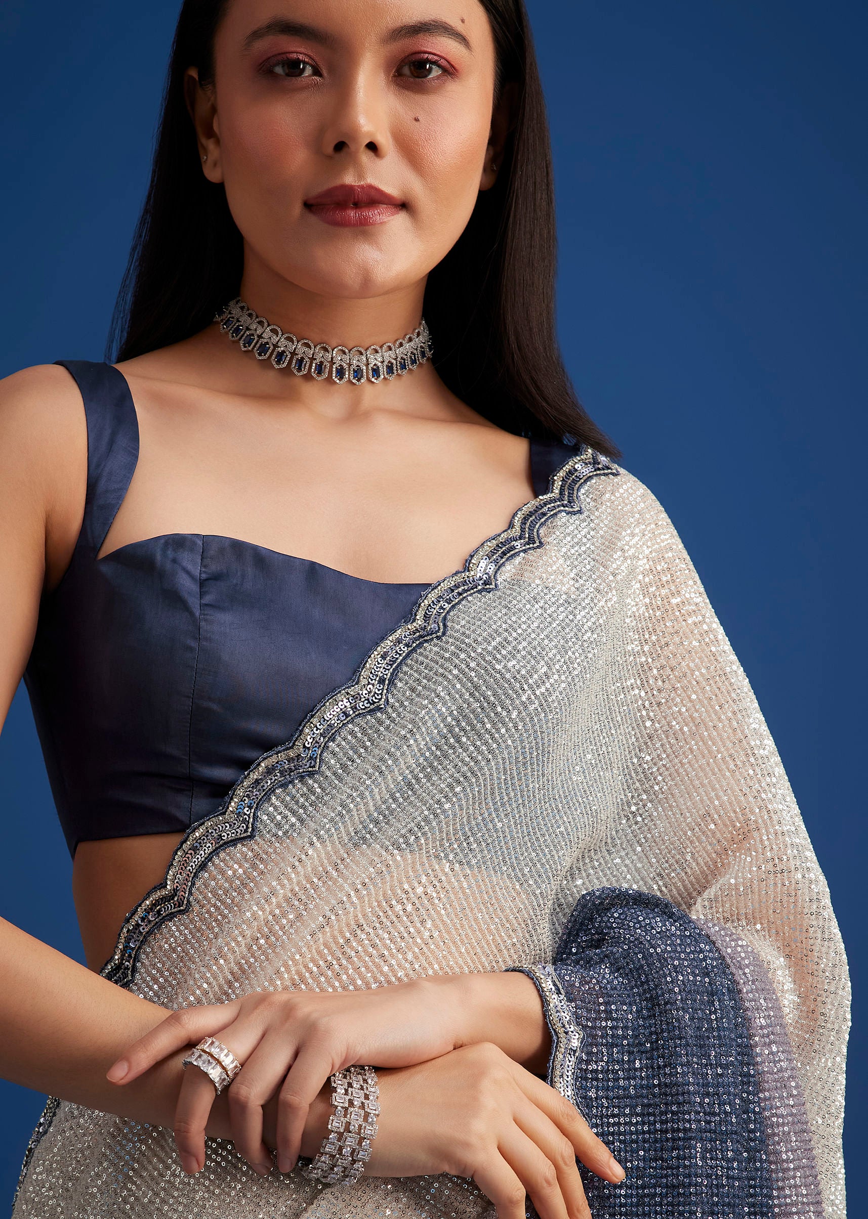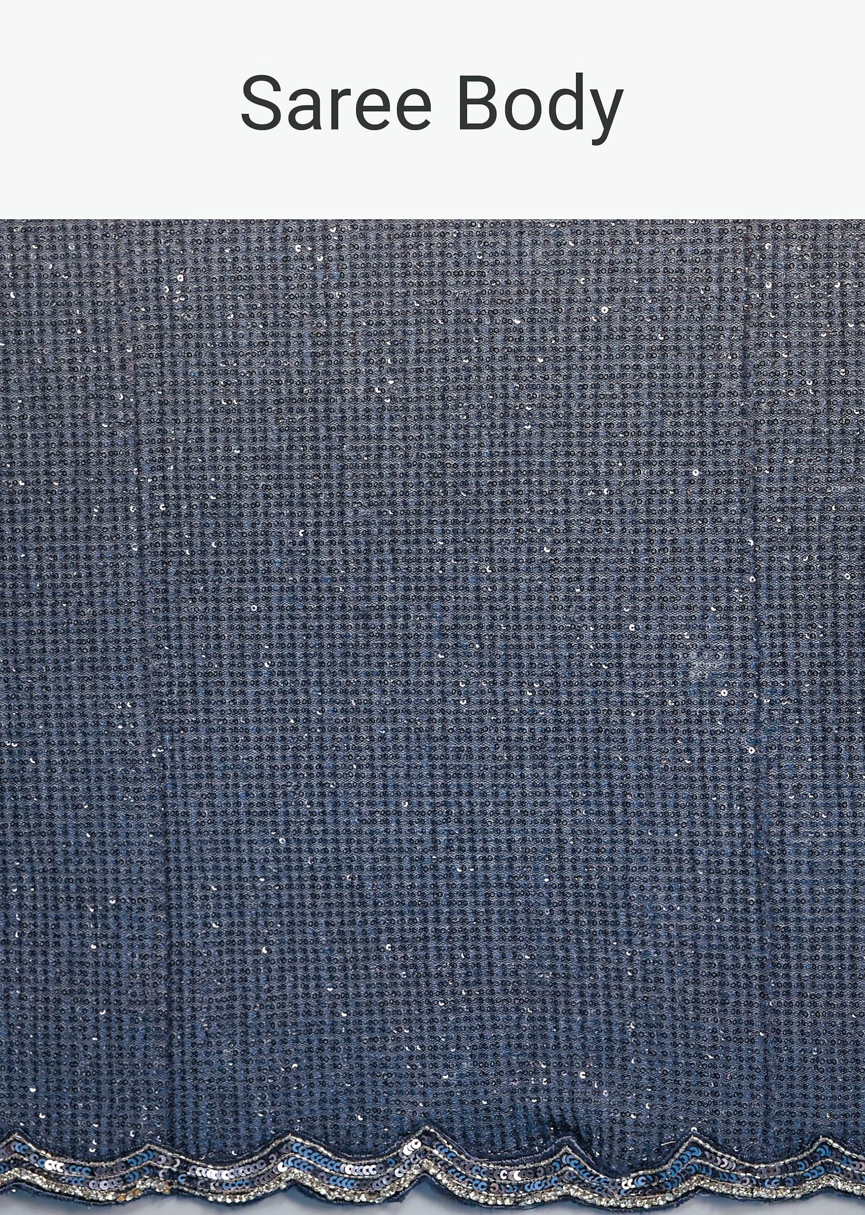 Teal Blue Sequins Saree With Scallop Embroidery Border