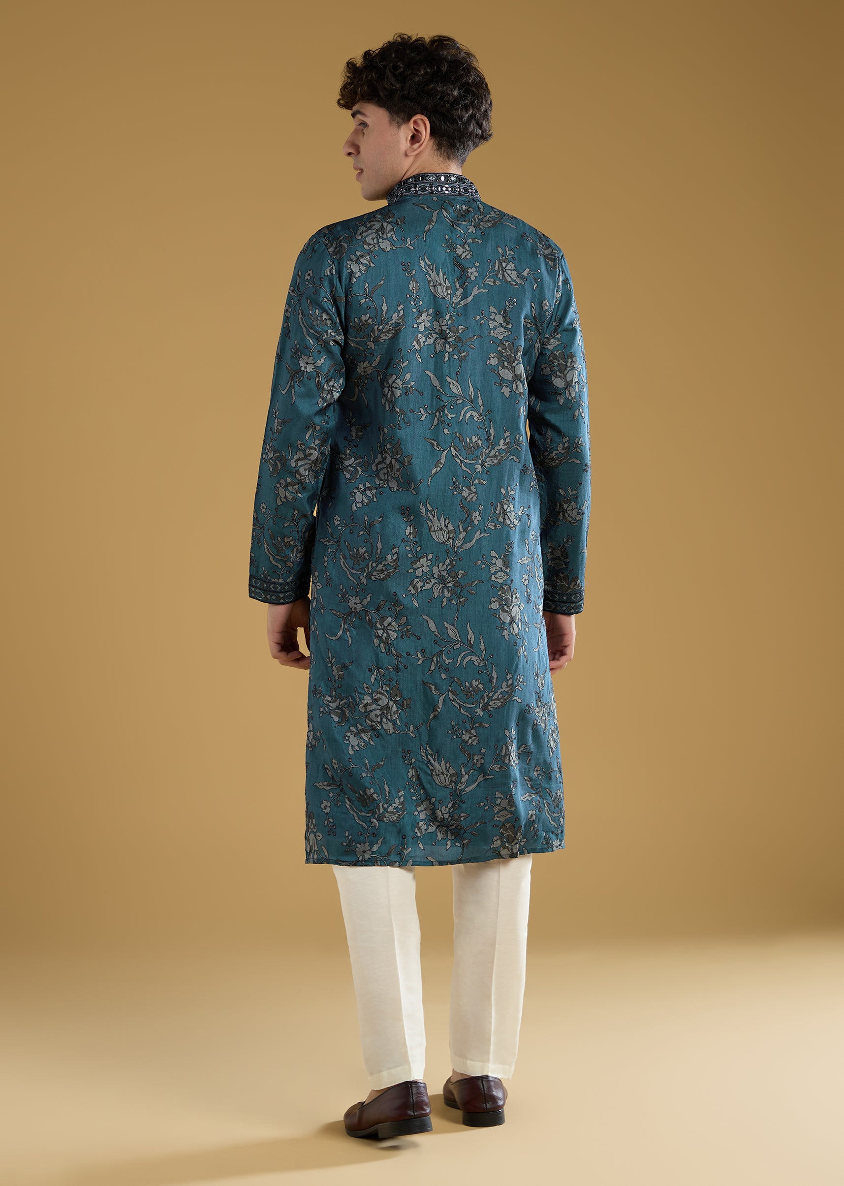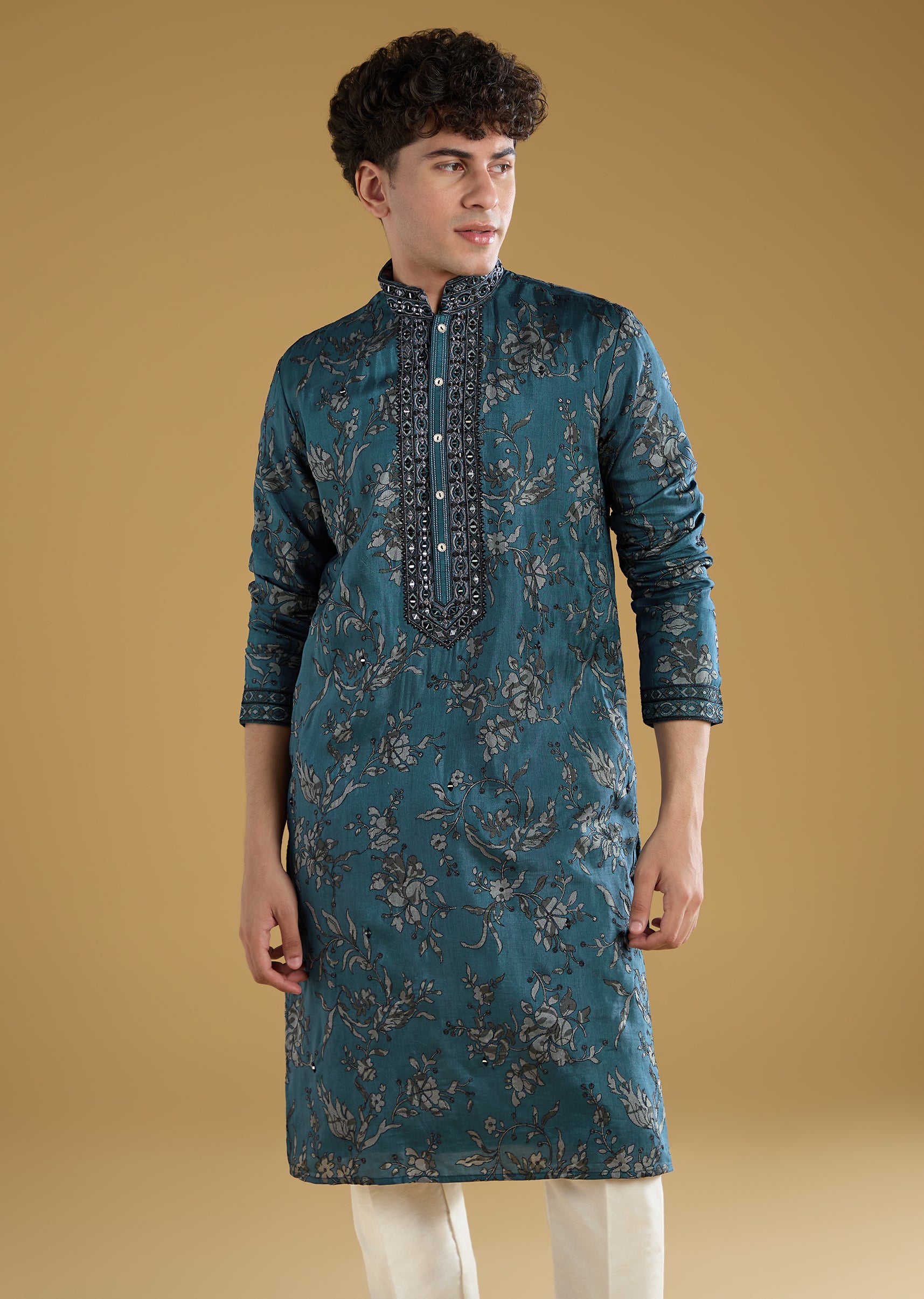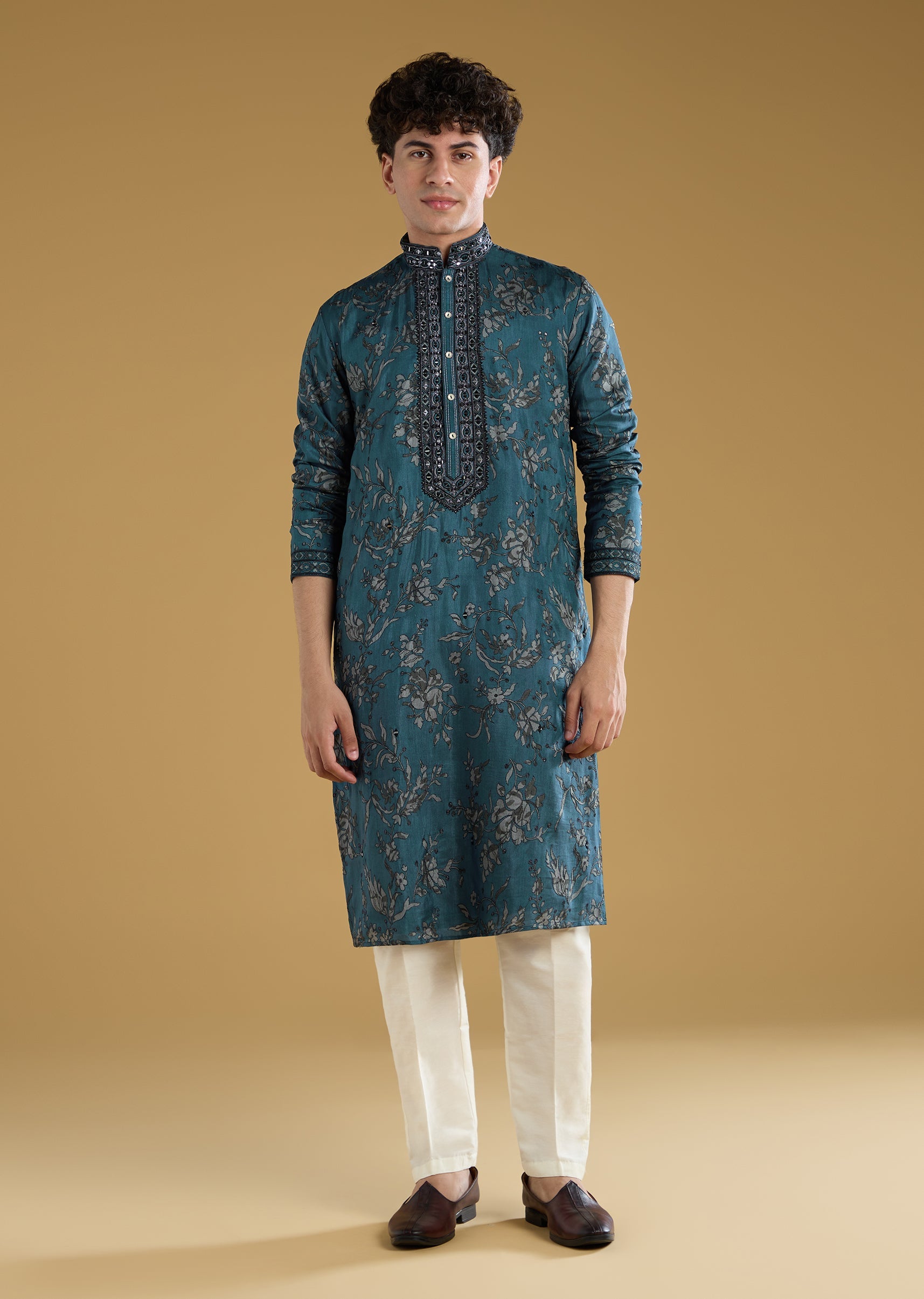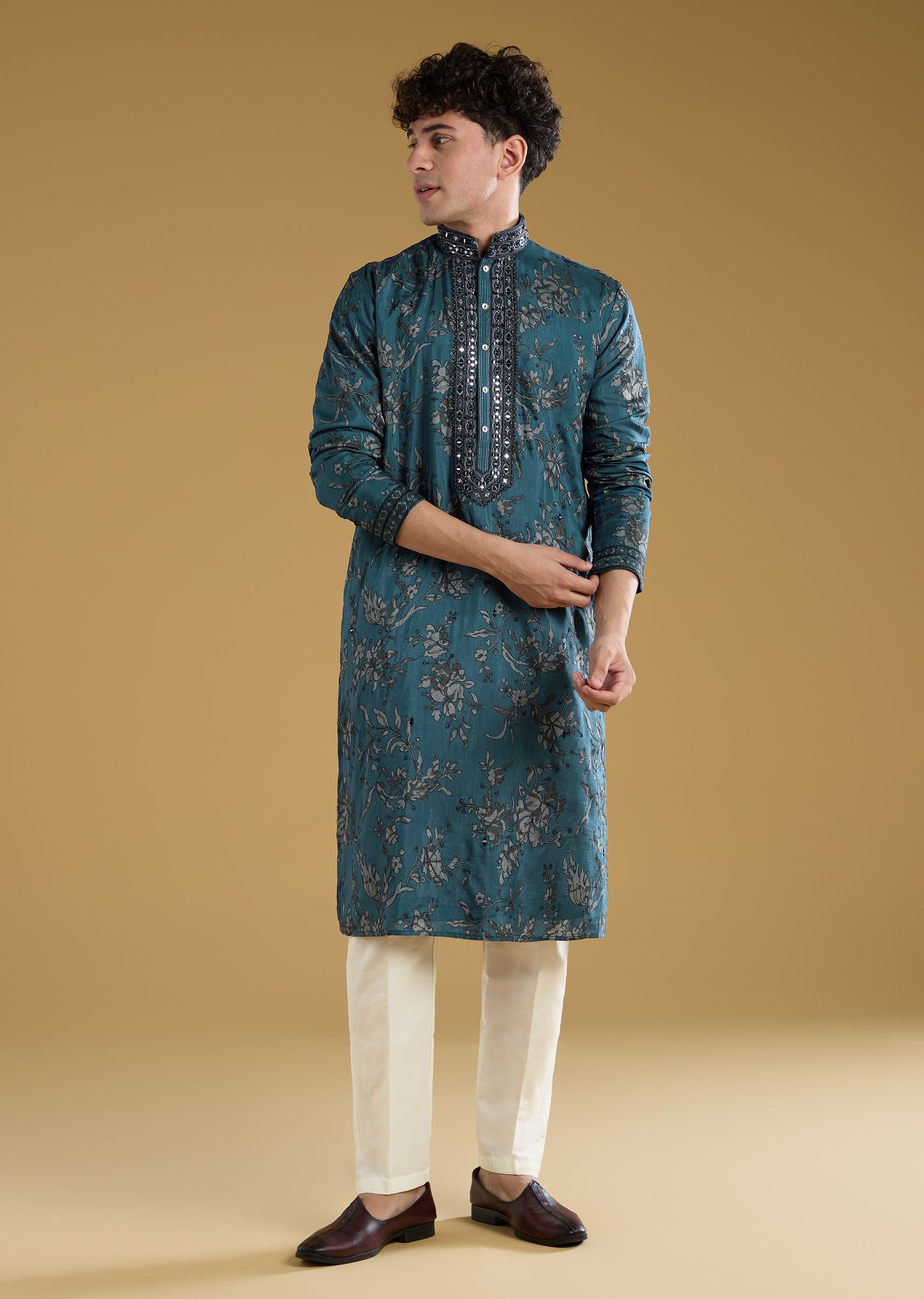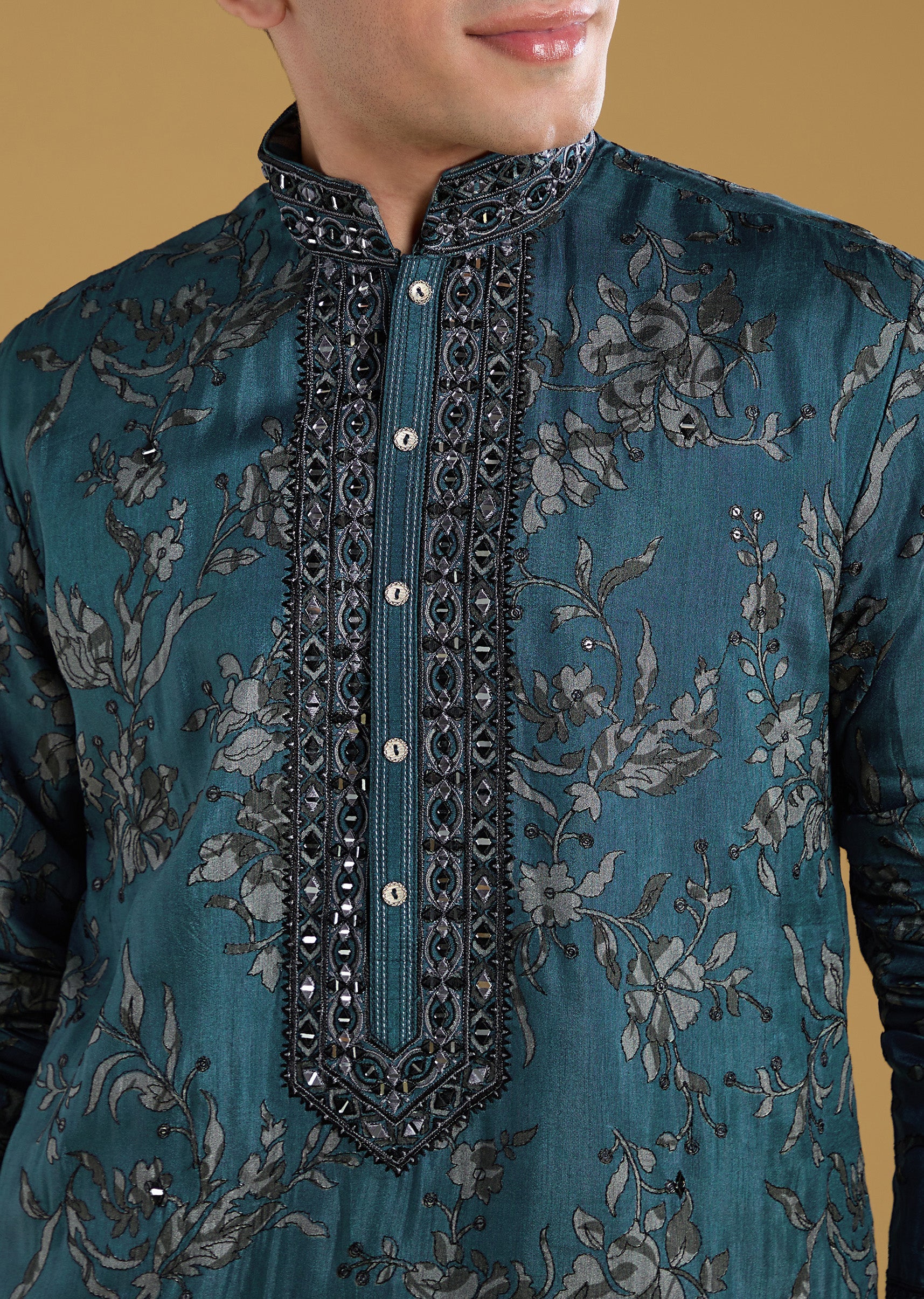 Teal Blue Silk Kurta Set With Thread And Mirror Detail Work