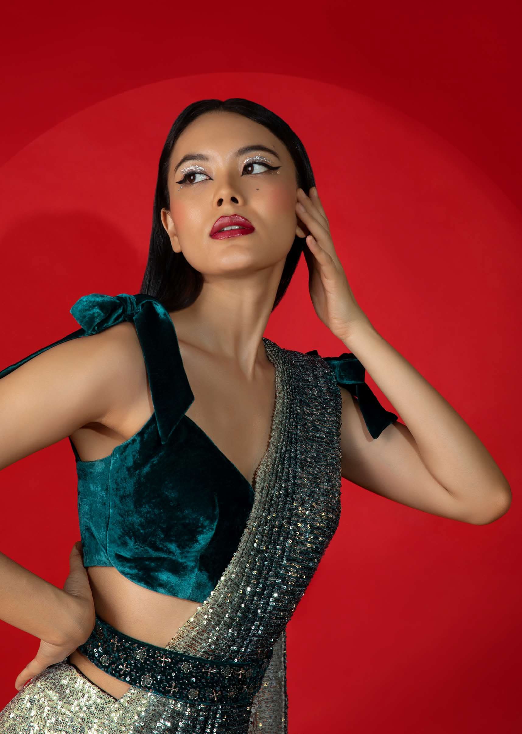 Teal Blue Velvet Blouse With Tie Up Straps On The Shoulder