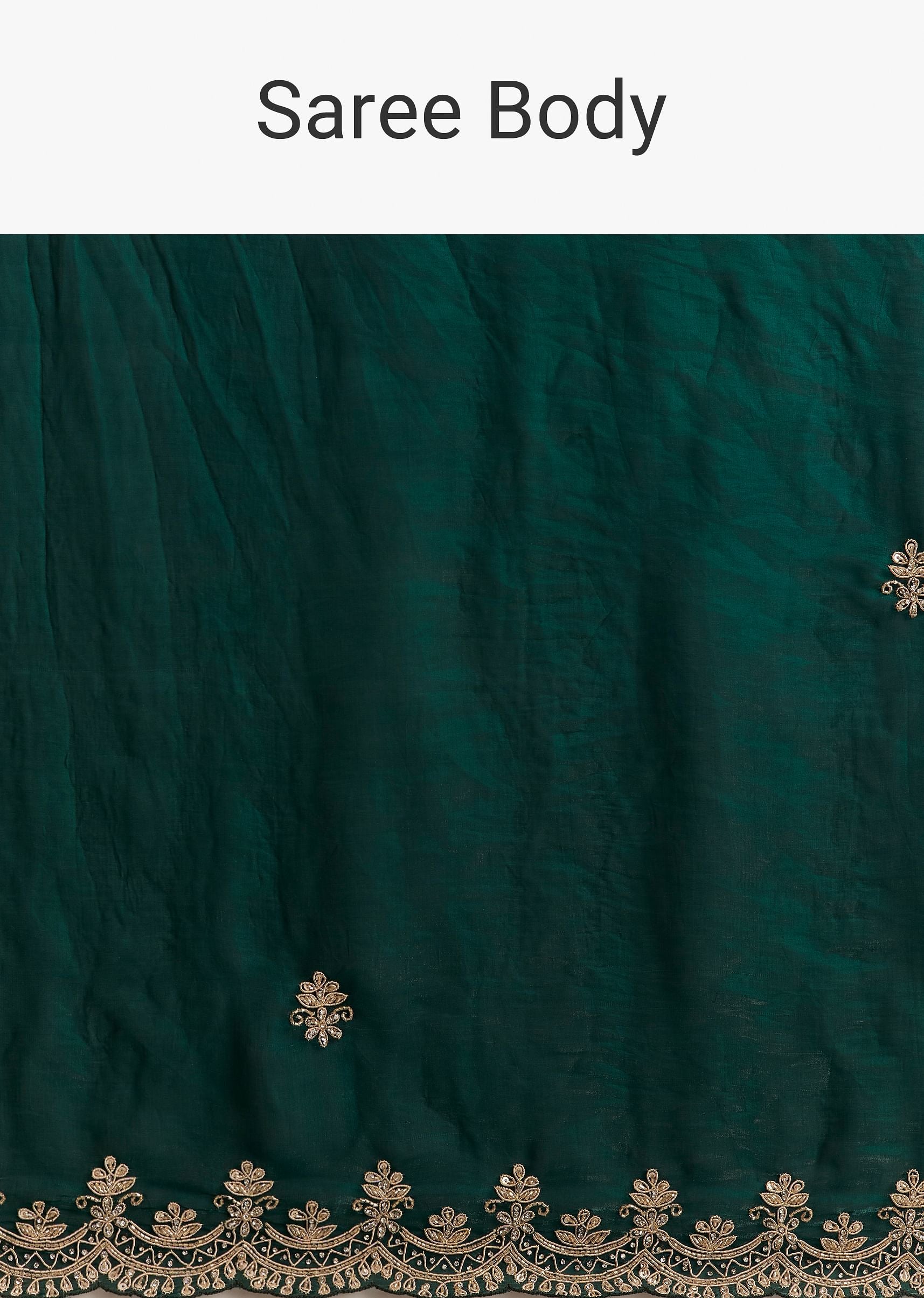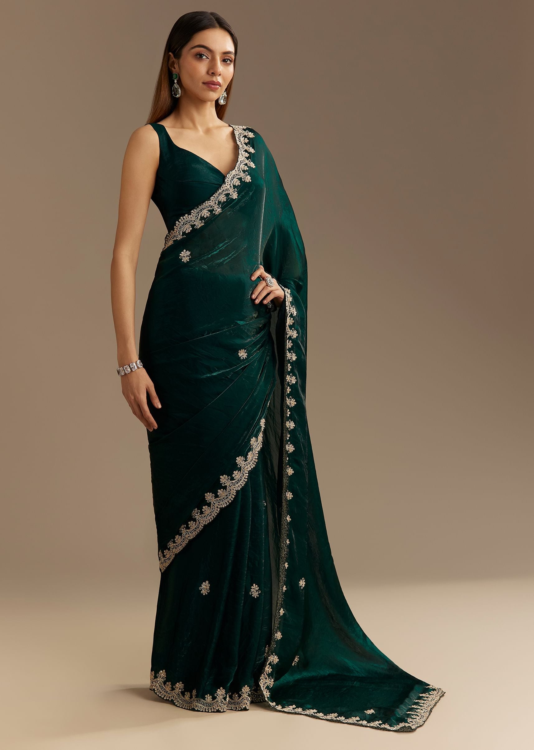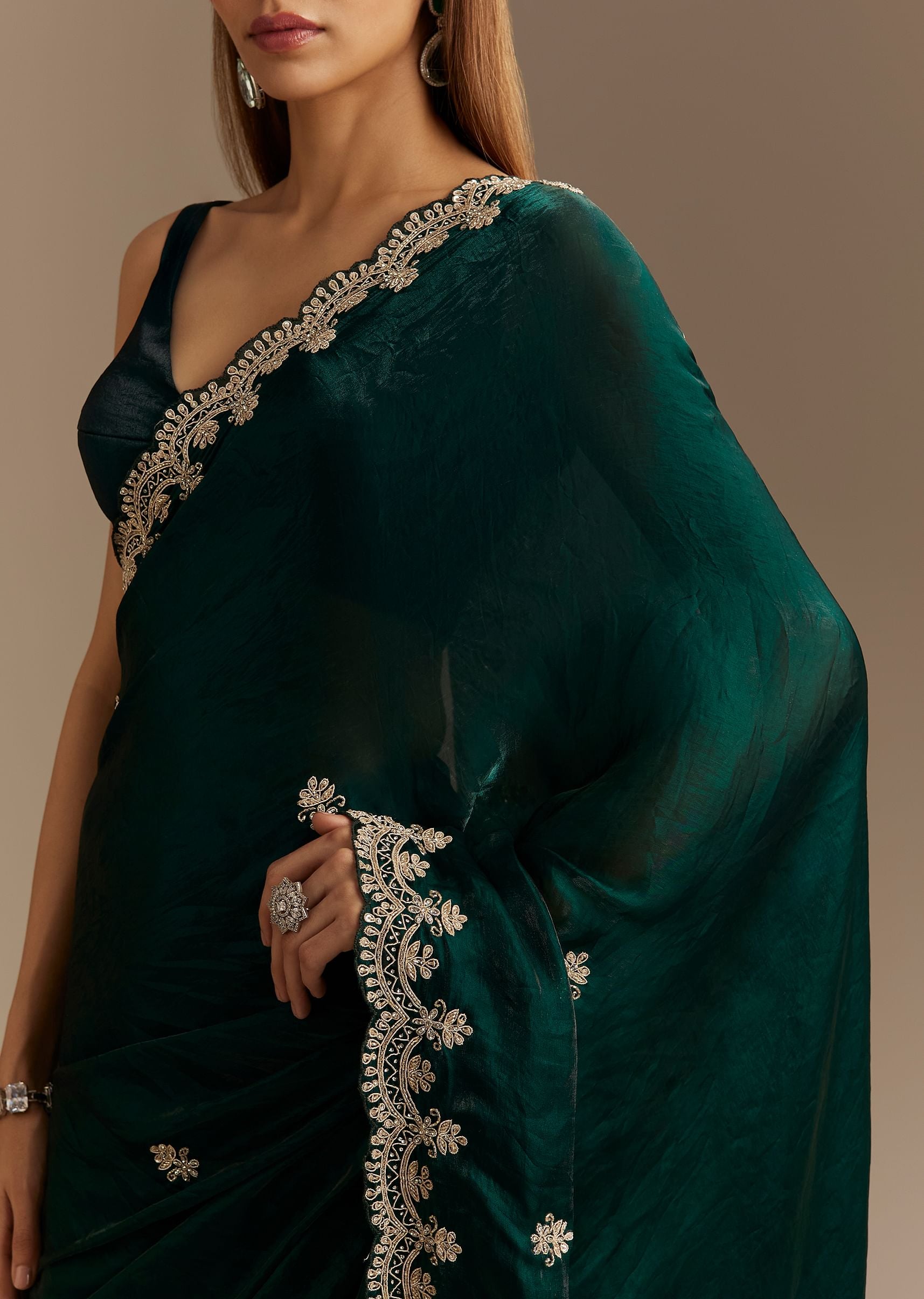 Teal Green Satin Saree With Zardosi Embroidery And Scallop Border