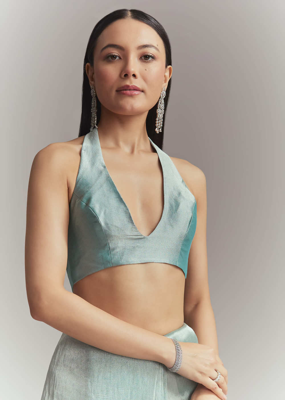Rich shades always feel striking, and this teal green tissue embroidered saree offers a bold appeal. A detailed cutwork border pairs with floral buttis worked in sequins, beads and cutdana... More Product Details