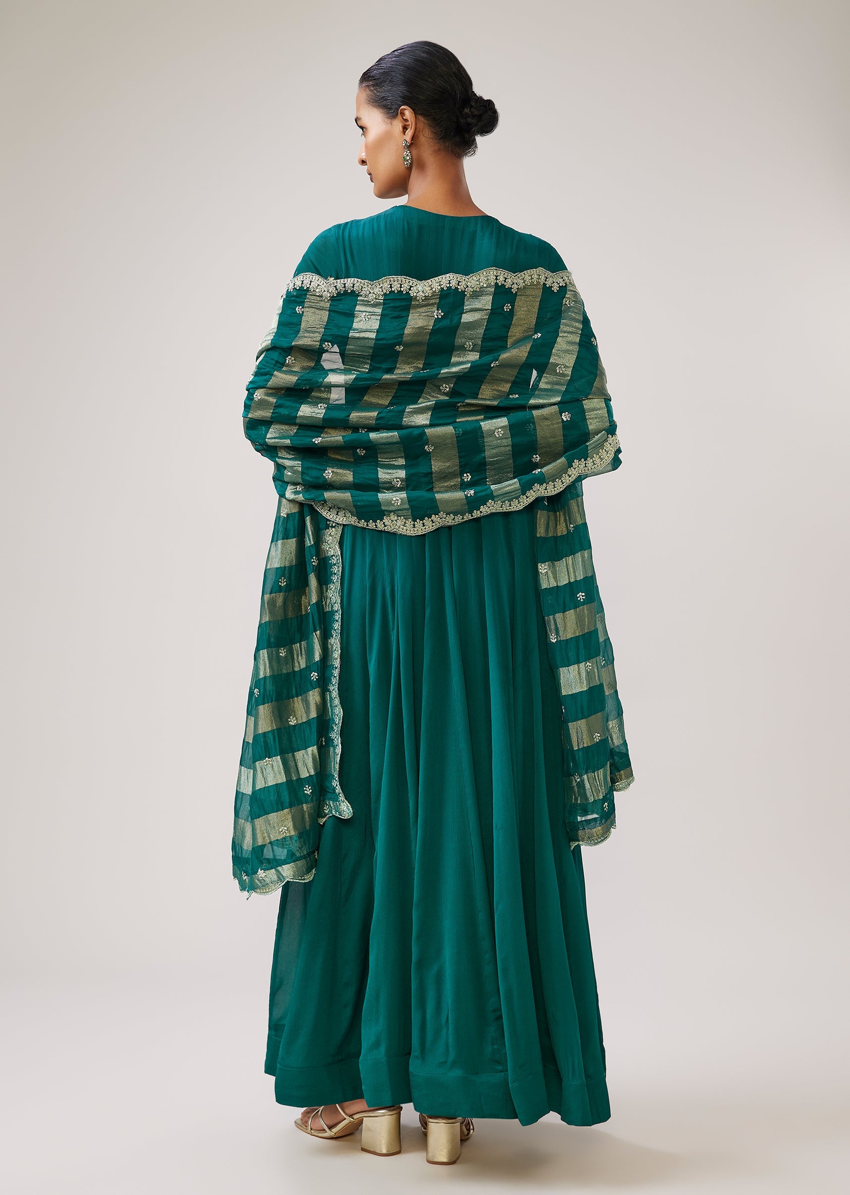 Make a graceful festive statement in this teal green A-line anarkali crafted in flowy chinon and highlighted with intricate zardozi work. Designed with a round neckline and 3/4th sleeves, the... More Product Details
