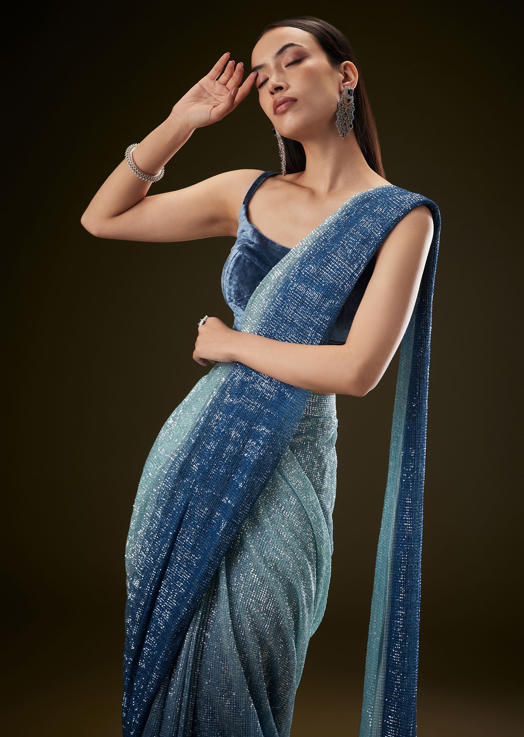 Step Into A Realm Of Elegance With This Mesmerizing Teal Ombre Saree Cascading Gracefully Into Serene Sky Blue Shades. The Shimmering Sequence Work Adds A Celestial Sparkle Making Every Movement A Captivating Sight. Paired With A Plush Velvet Blouse This Readytowear Saree Perfectly Balances Modern Sophistication With Traditional Grace. Ideal For Evening Soirees And Grand Celebrations It Envelops You In A Cascade Of Enchanting Colors And Shimmering Allure.Collar Work May Change Awarded As The Most Trusted Brand We'Re Delivering Styles You Love Just As Promised.