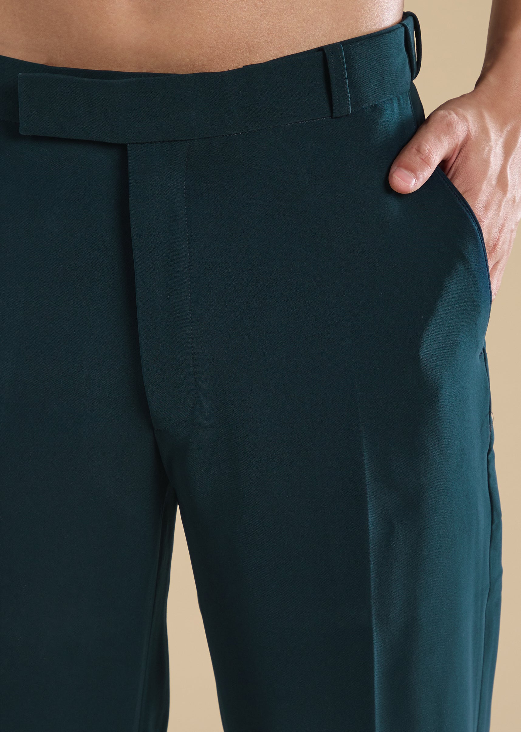 Crafted in suiting fabric, this teal tuxedo set features subtle metallic detailing for a modern edge. Designed with a mandarin collar and full sleeves, it comes paired with a coordinated... More Product Details