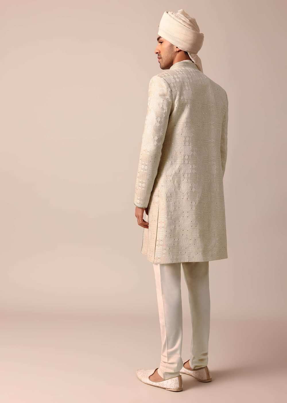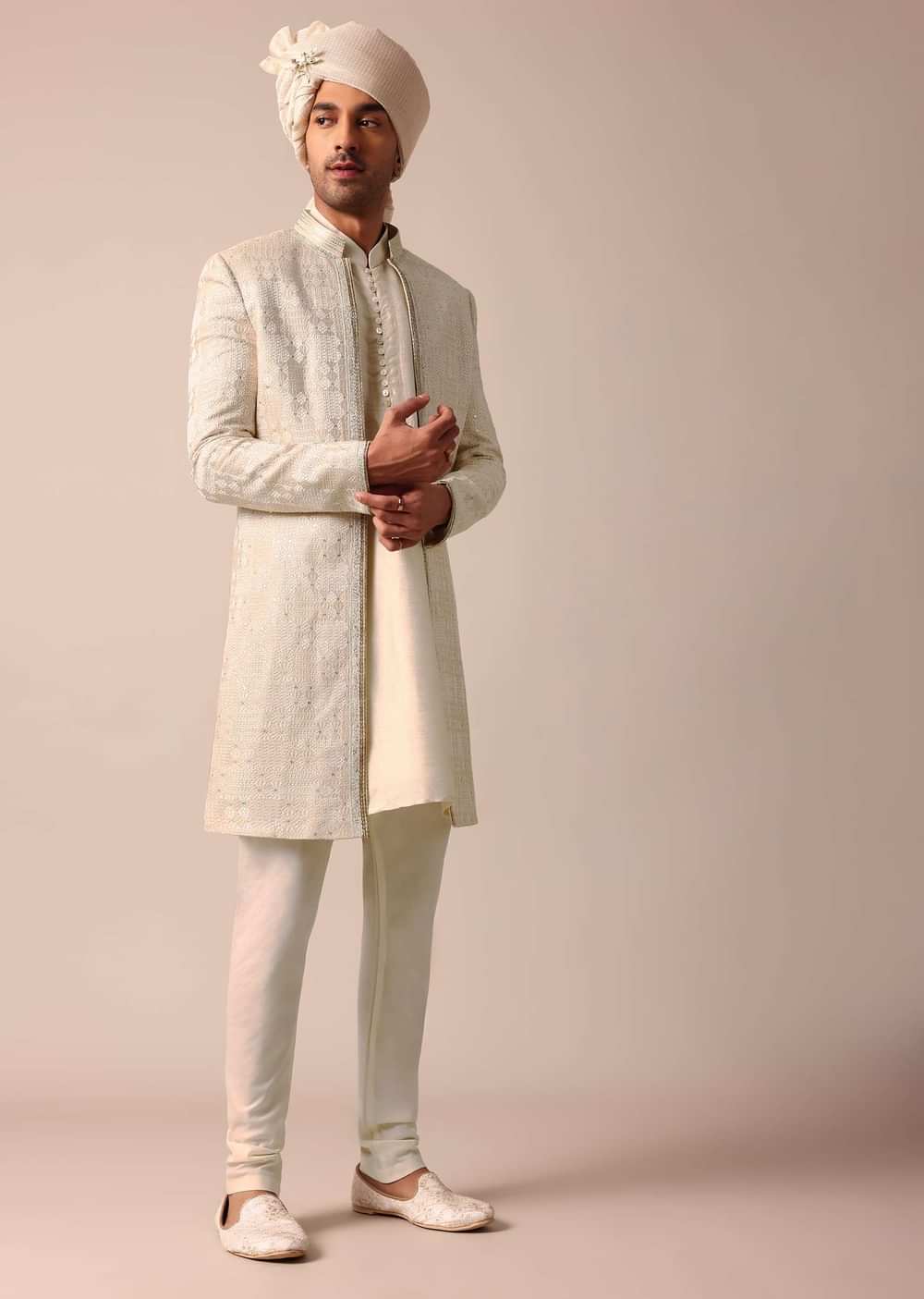 - Embrace sophistication at Sangeets with our Timeless Beige Silk Sherwani Set.