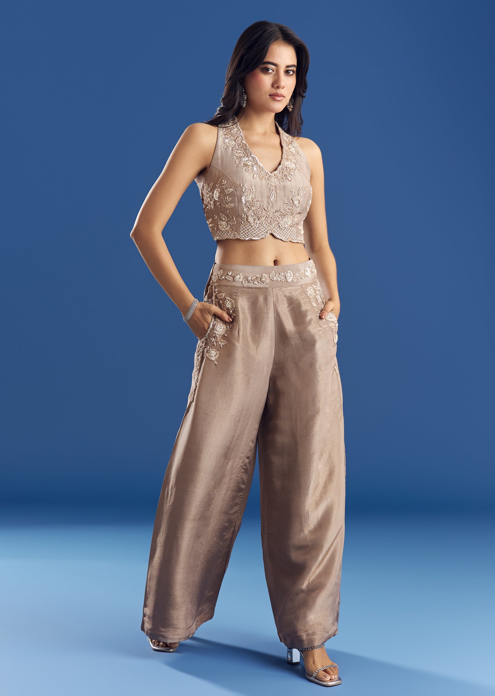 A shimmering tissue fabric crop top embroidered with sequins, moti, and cut dana paired with a side-pocketed palazzo decked in matching embellishments.Standard length for Palazzo is 42" Awarded as the... More Product Details