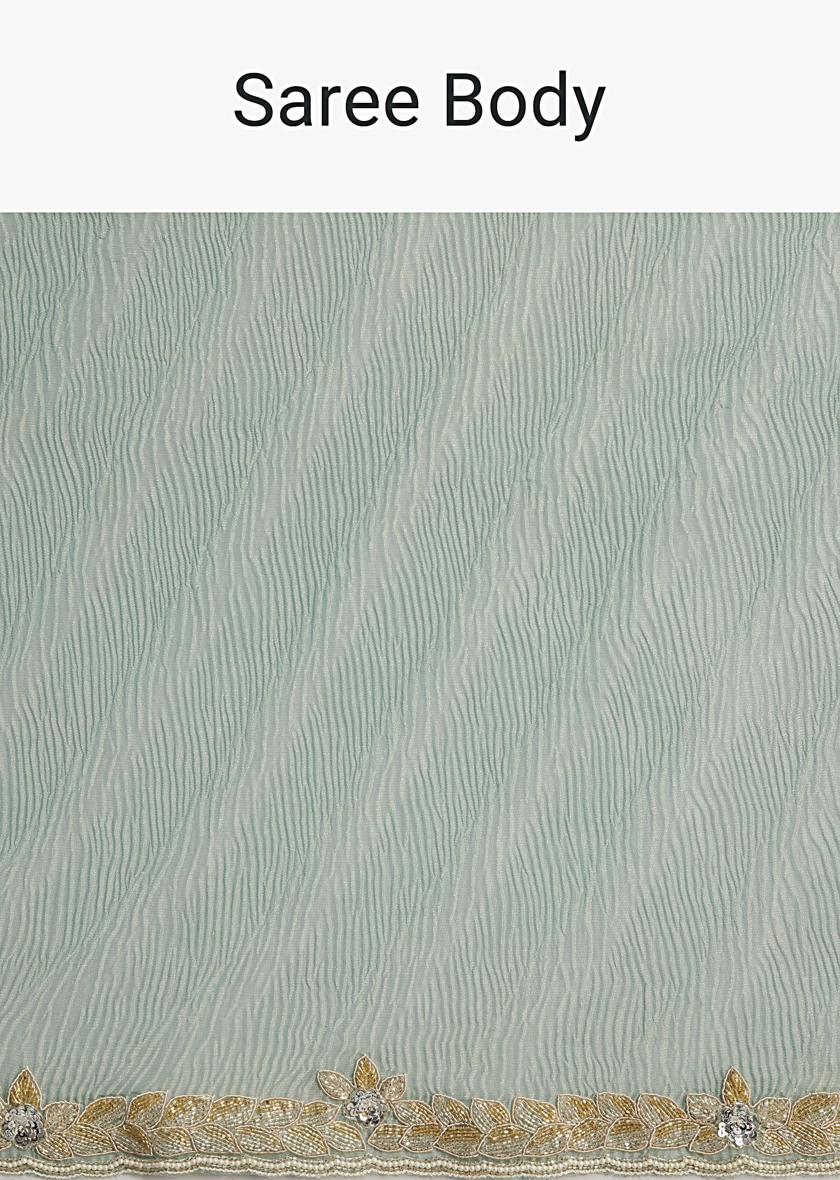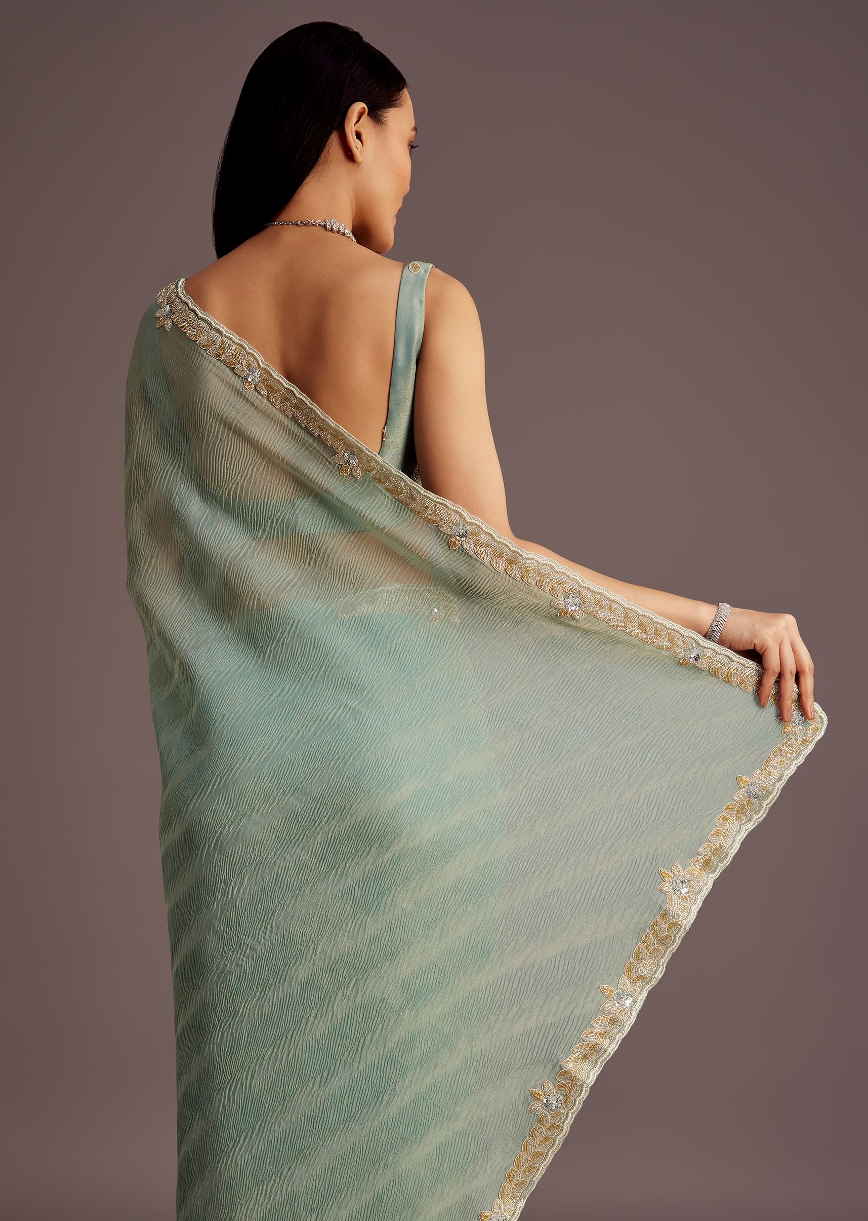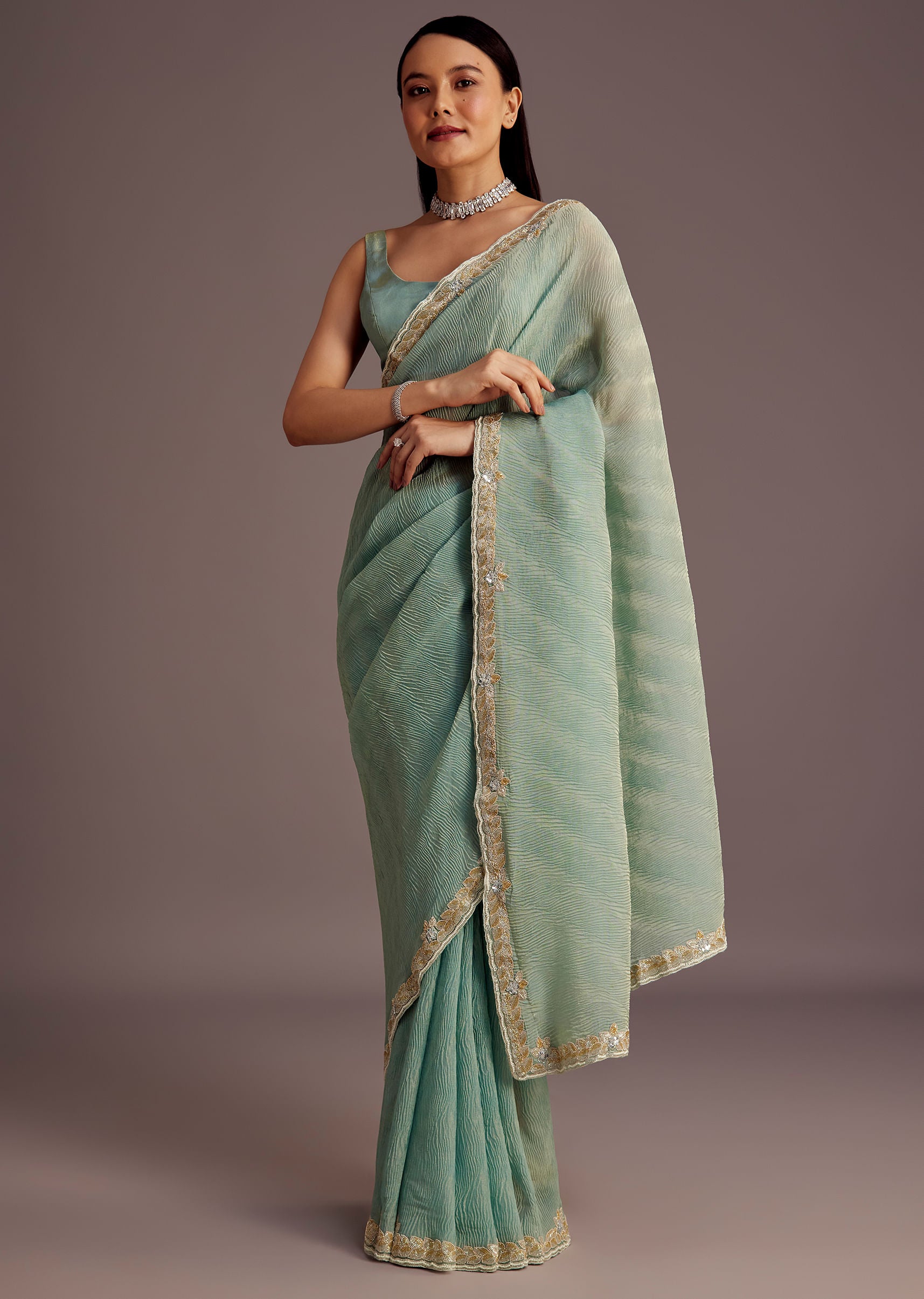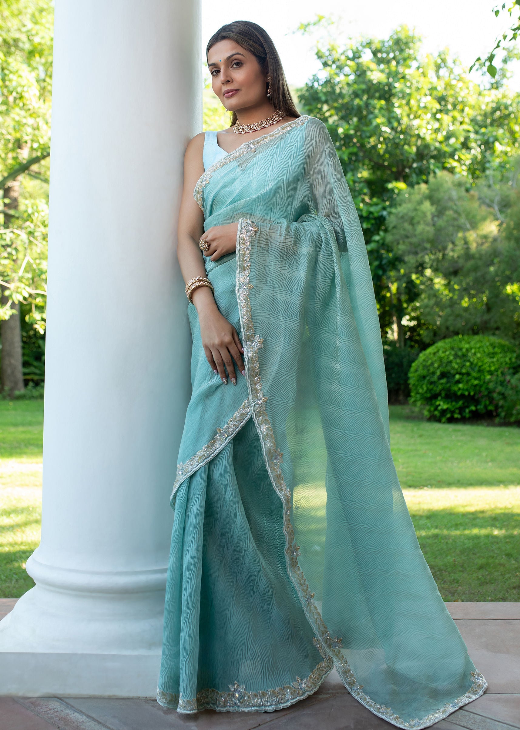 Turquoise Blue Crush Tissue Cutdana Work Saree With Embroidered Border