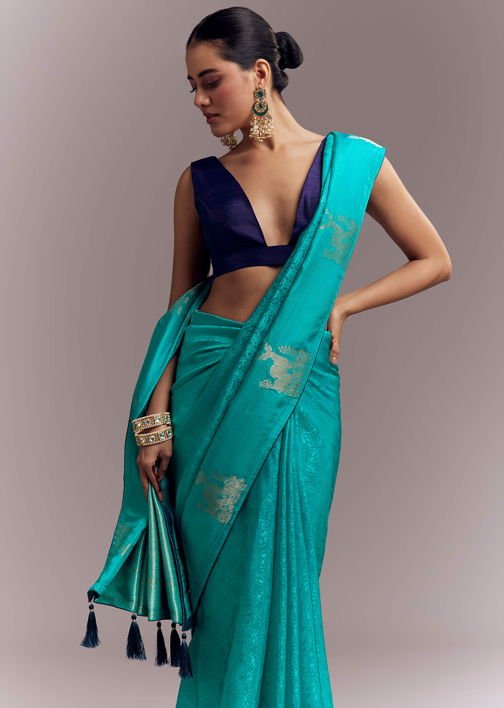 Turquoise Blue Jacquard Silk Saree With Brocade Work And Embroidery