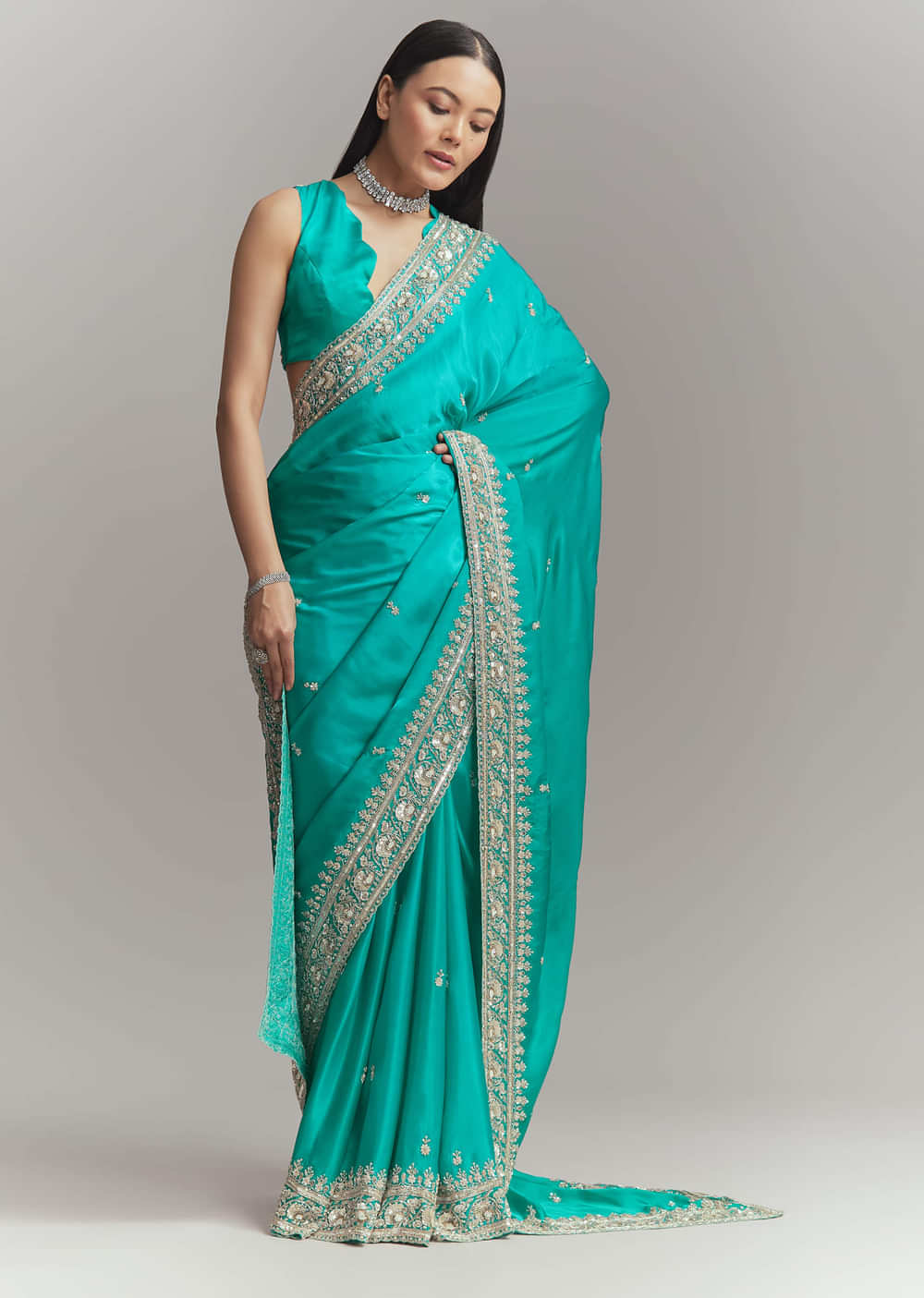Turquoise Blue Satin Embroidered Saree With Heavy Hand Embroidery