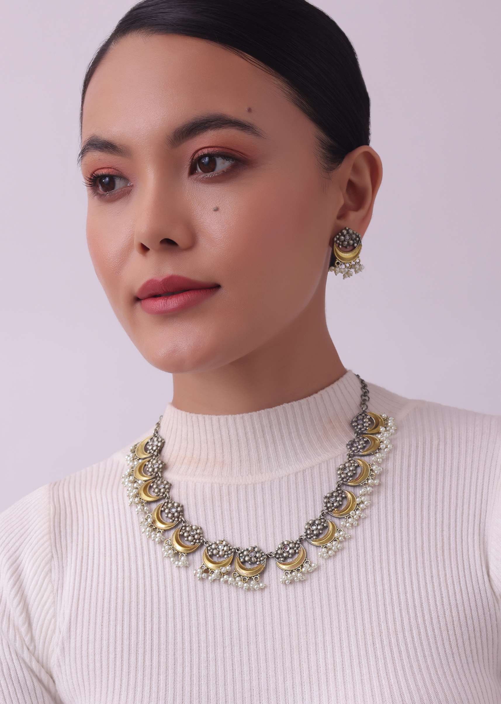 - Make a style statement with our two-tone finish oxidized short necklace and earring set in a captivating fusion style.