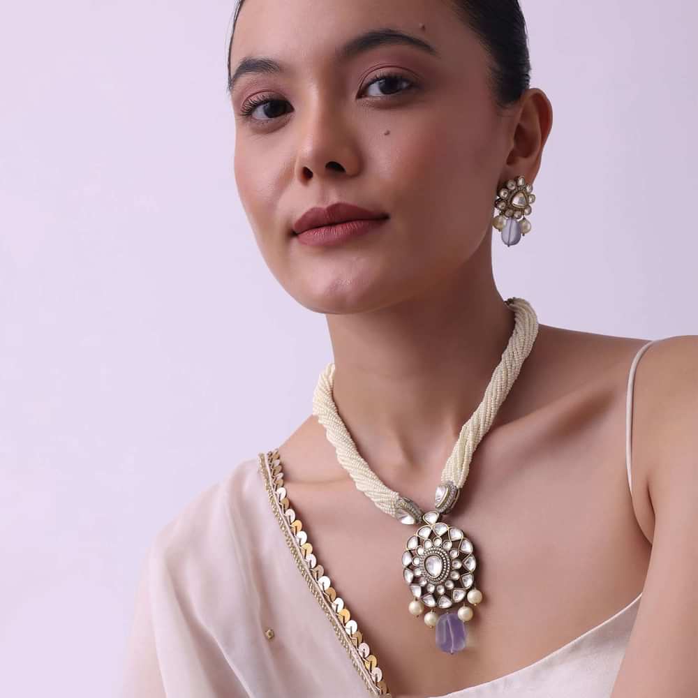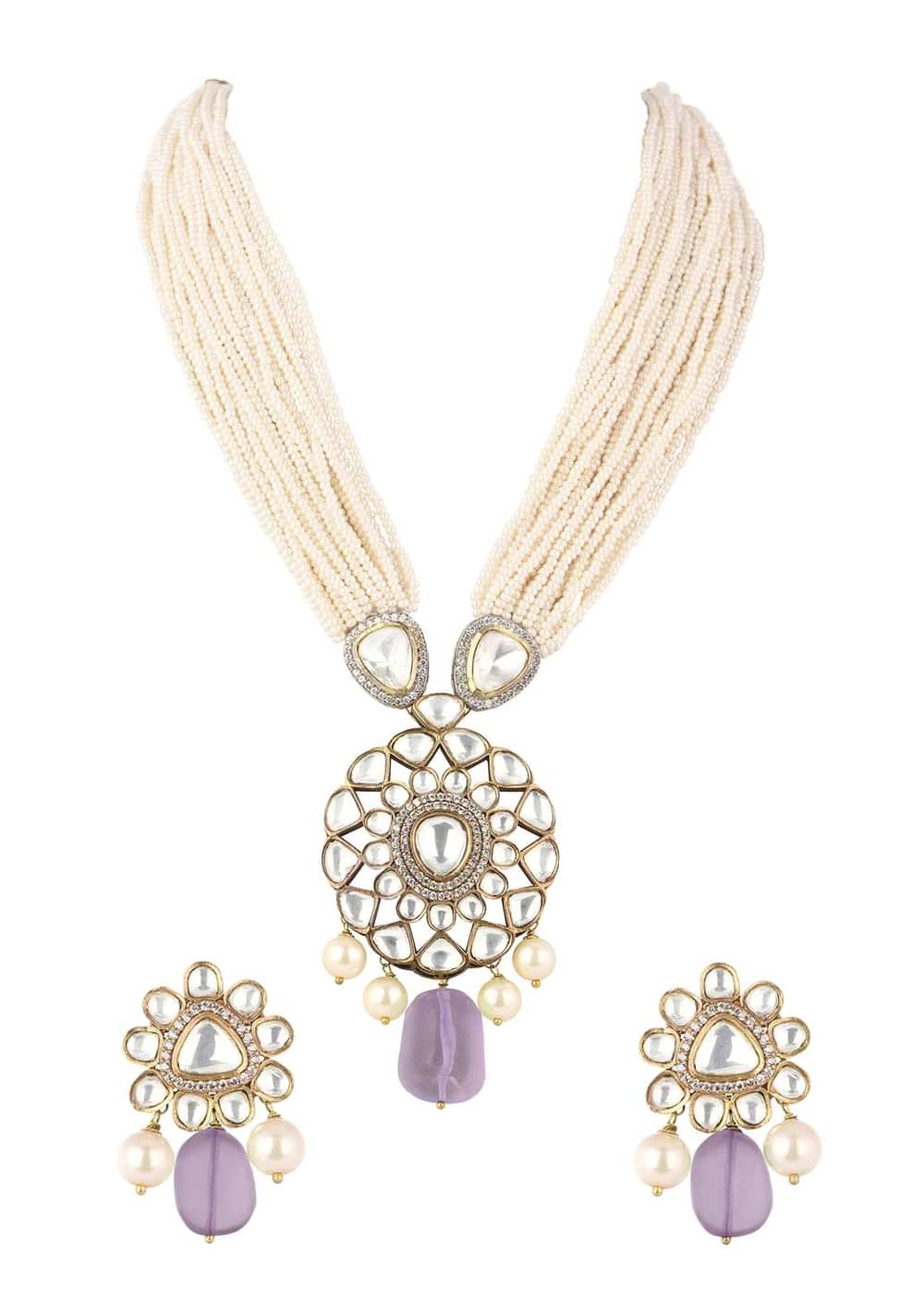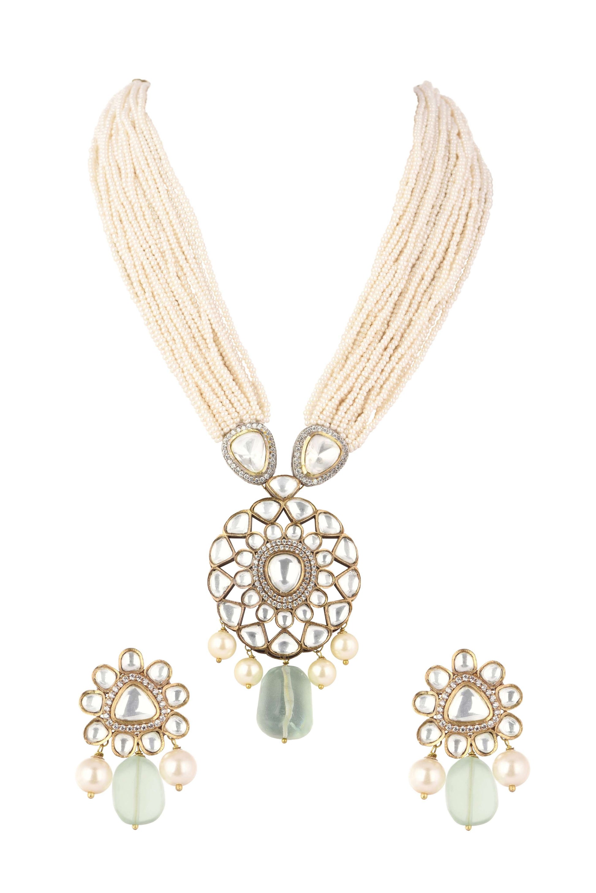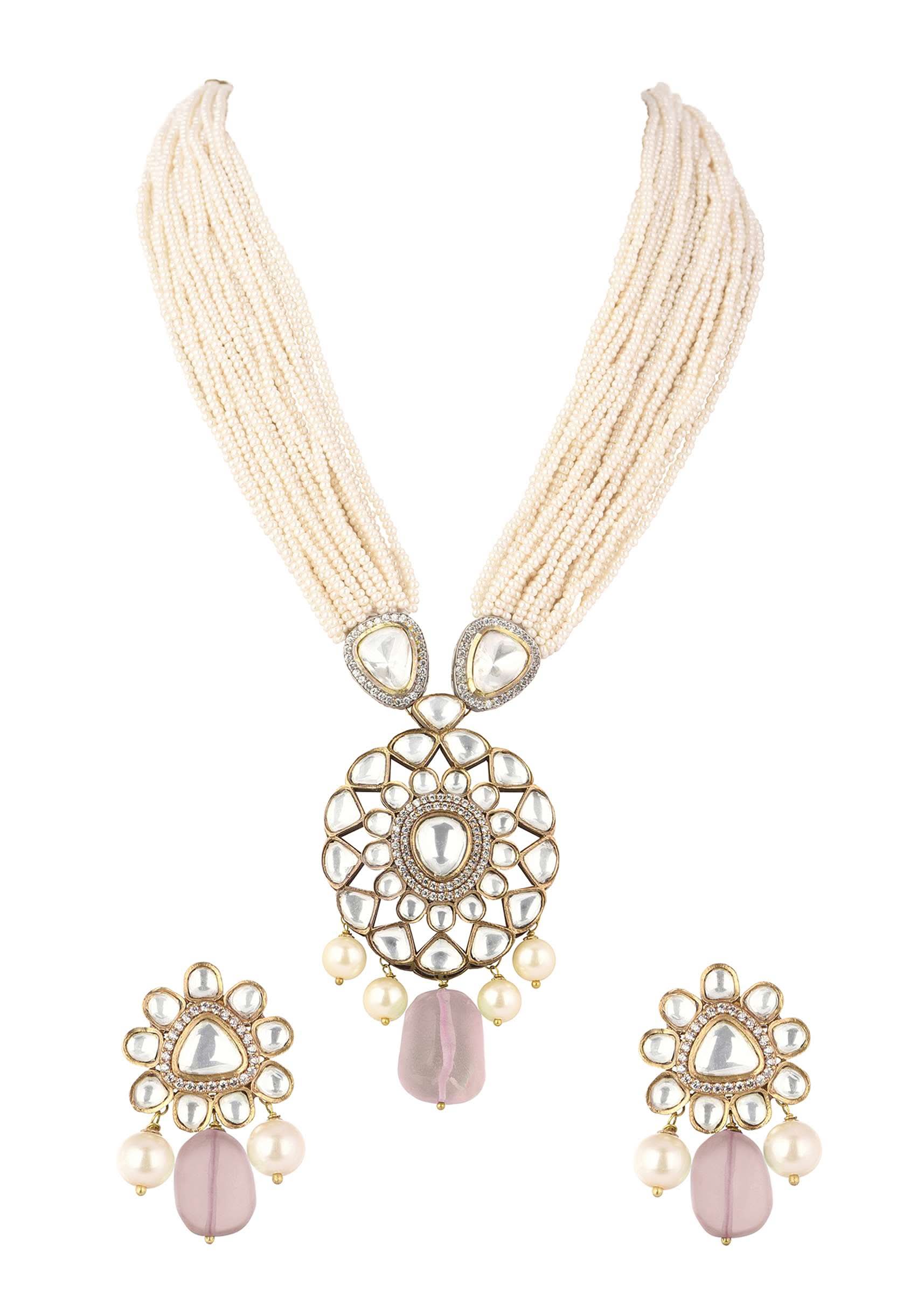 - This set combines the timeless allure of kundan craftsmanship with the brilliance of synthetic stones and delicate pearl drops.