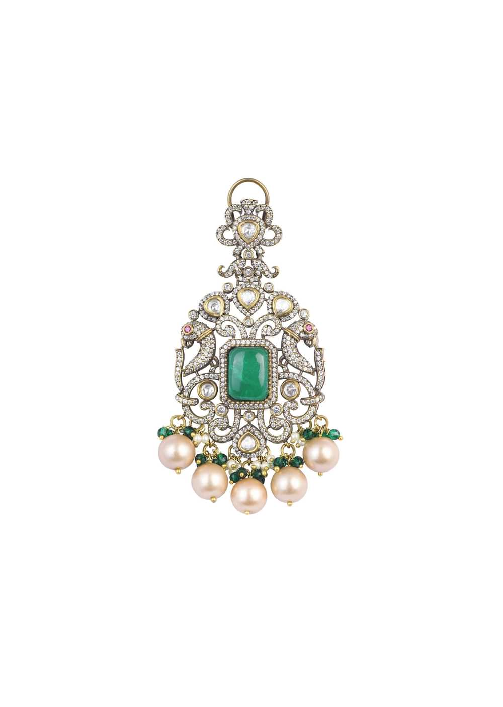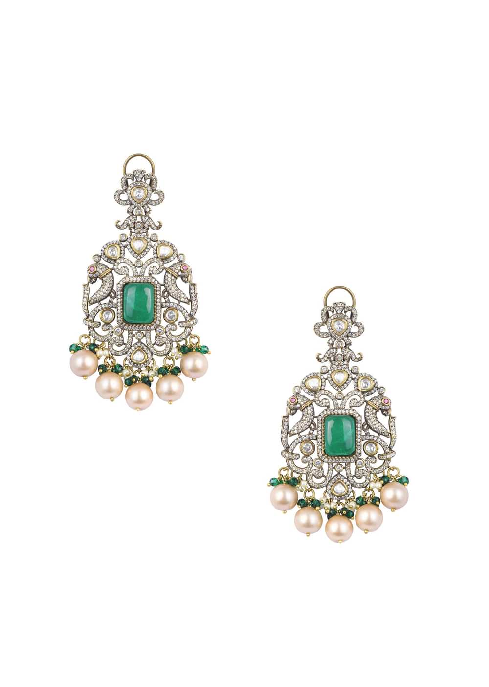 - Showcasing our captivating statement dangler earrings adorned with green polki studs and glistening cluster bead drops.