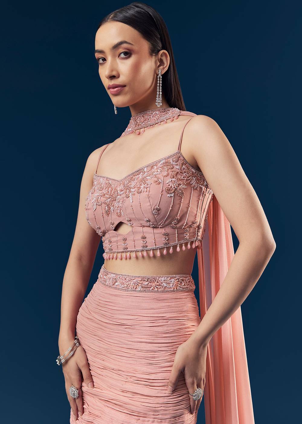 A romantic celebration pick in soft blush pink, this georgette fish-cut lehenga drapes beautifully with a flattering silhouette and delicate movement. The sleeveless embroidered blouse adds elegant texture, while the choker dupatta frames the neckline for a refined festive finish. Ideal for sangeet evenings, reception functions, and wedding guest moments where feminine charm meets modern design.