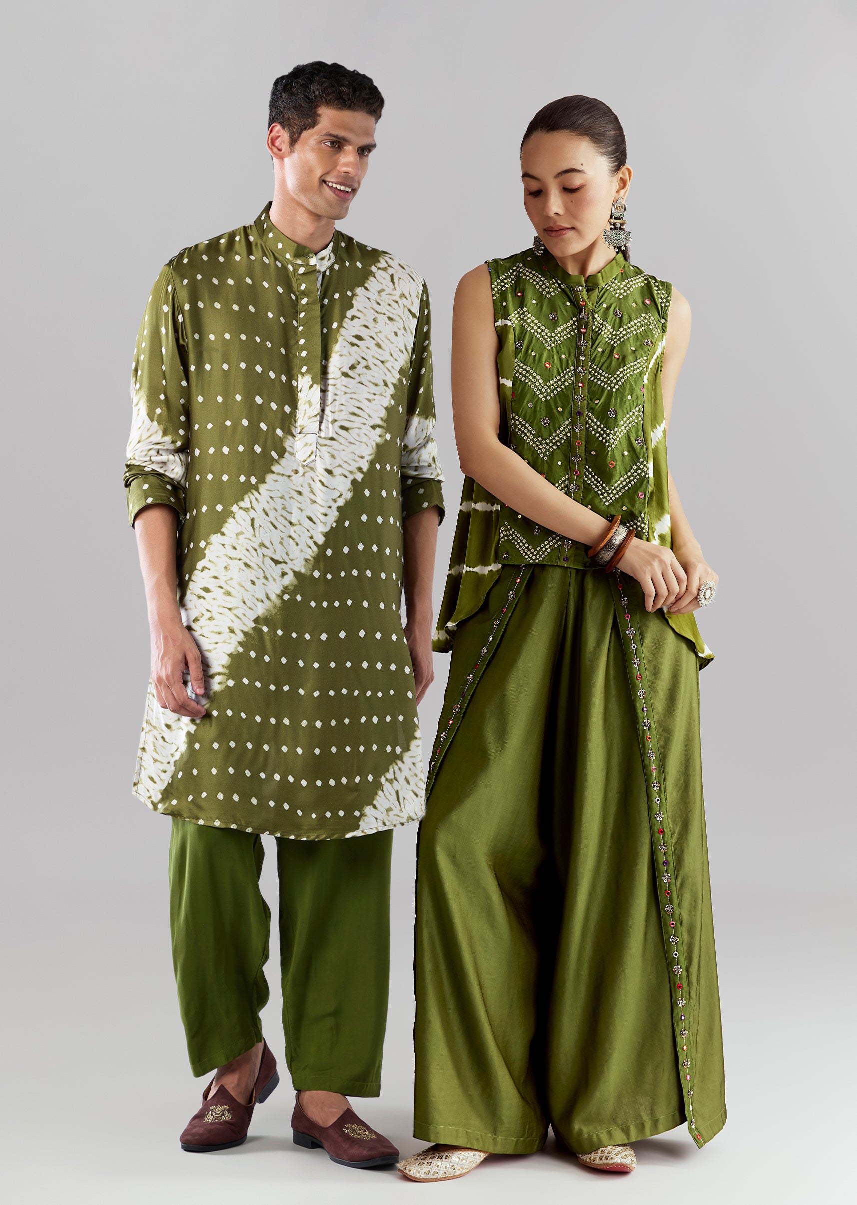 Vibrant Green Indo-Western Couple Set – Green Satin Indo-Western Set For Her And Green Bandhani Kurta Set For Him