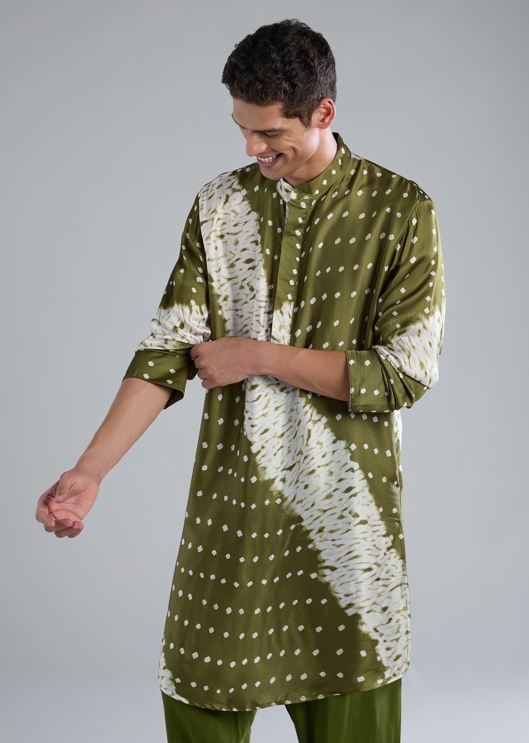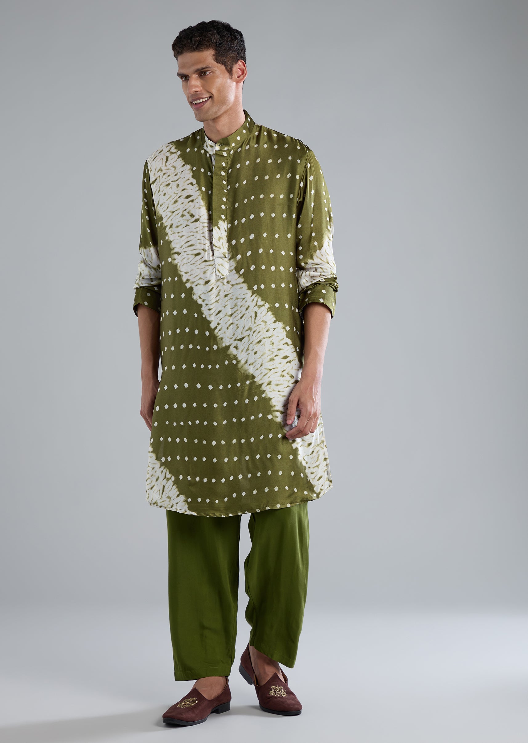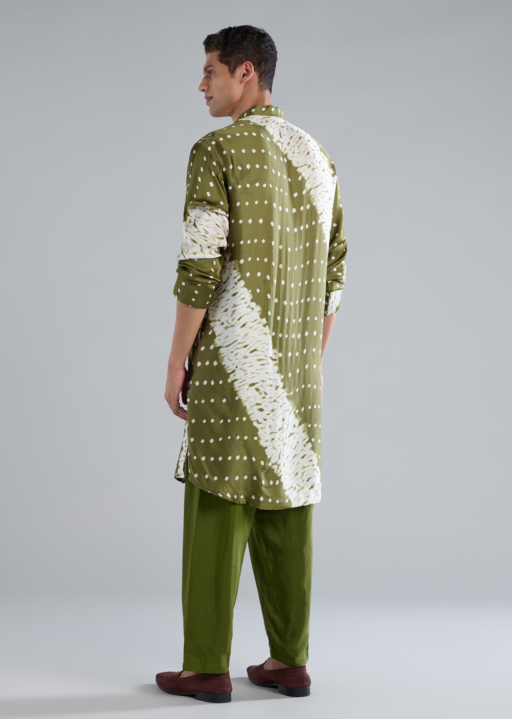Cultural and vibrant, this green kurta set with handmade bandhani and shibori prints adds traditional charm.