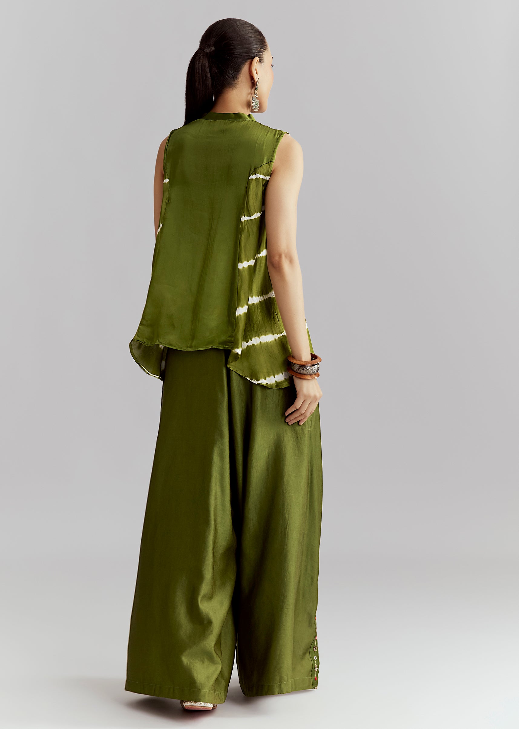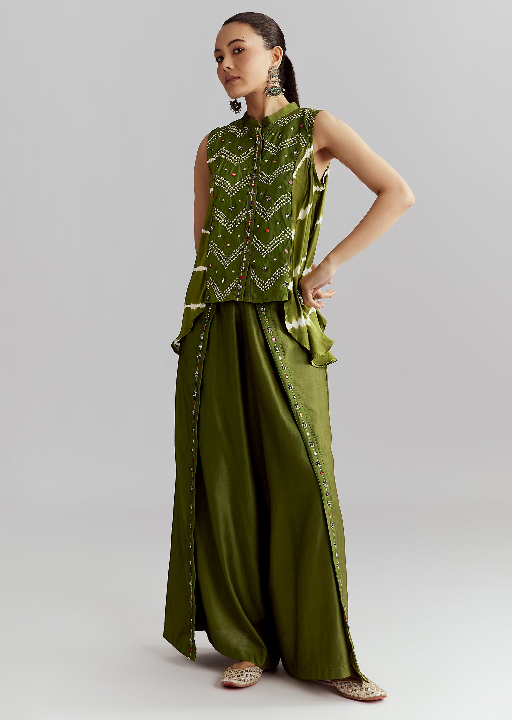 Contemporary and festive, this green satin indo-western set with bandhani and leheriya print is perfect for sangeet and haldi functions.