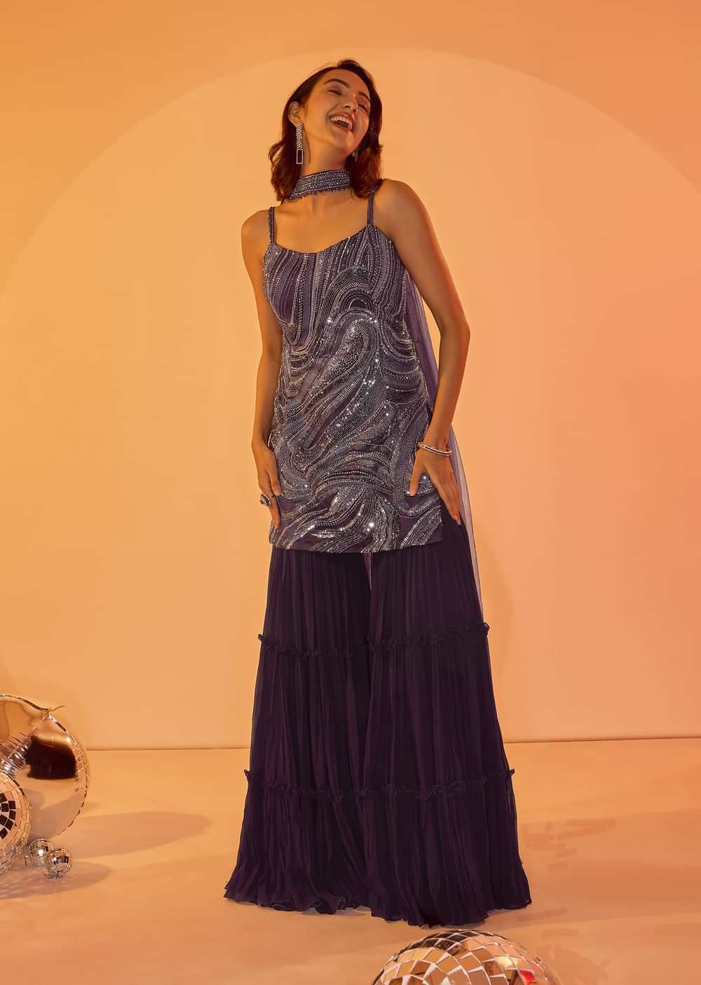 Step Into A Dreamscape Of Elegance With This Violet Kurti And Ruching Sharara Set A Masterpiece Of Fluid Artistry. Delicate Waves Of Embroidery Cascade Across The Net Kurti Shimmering Under... More Product Details