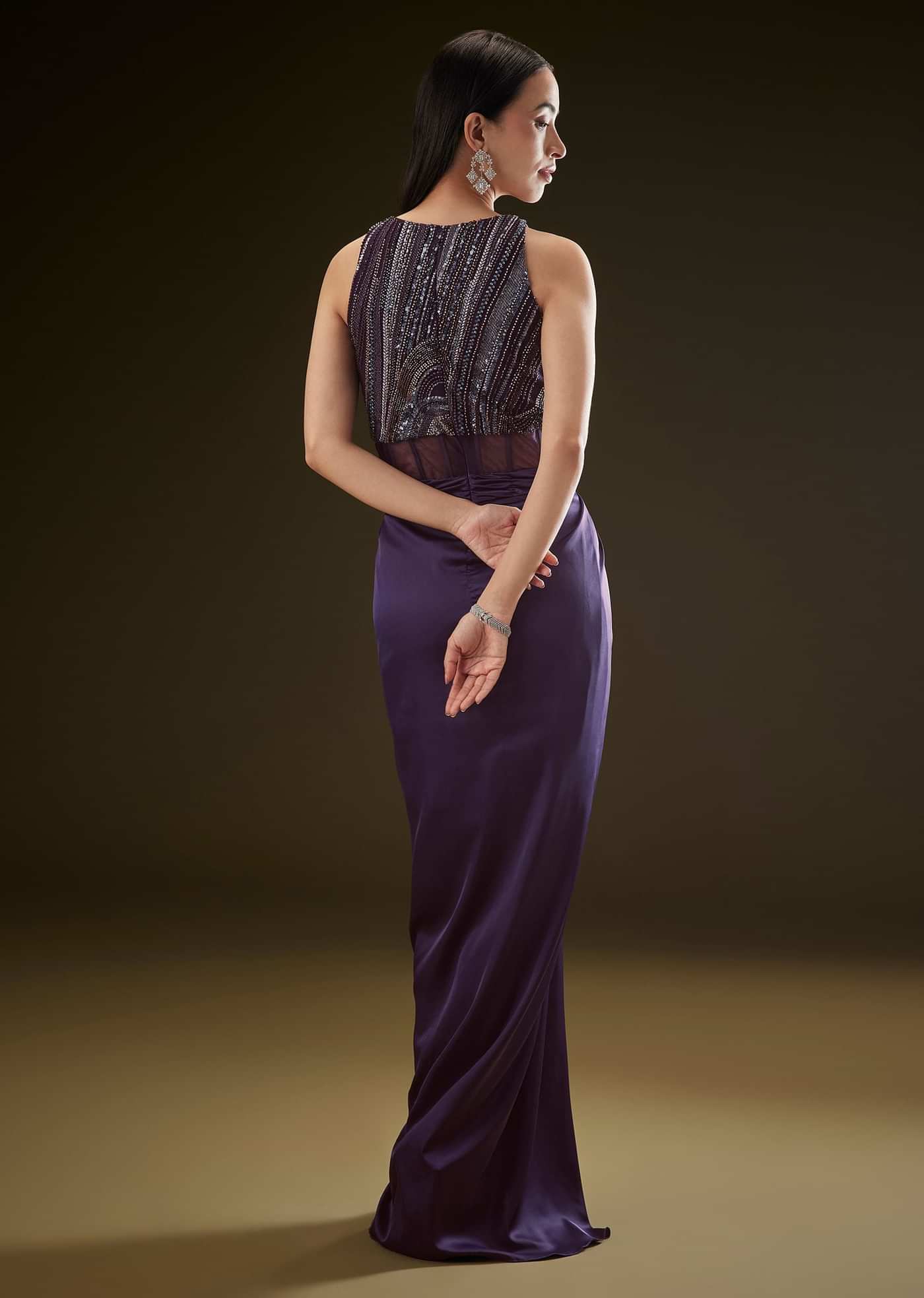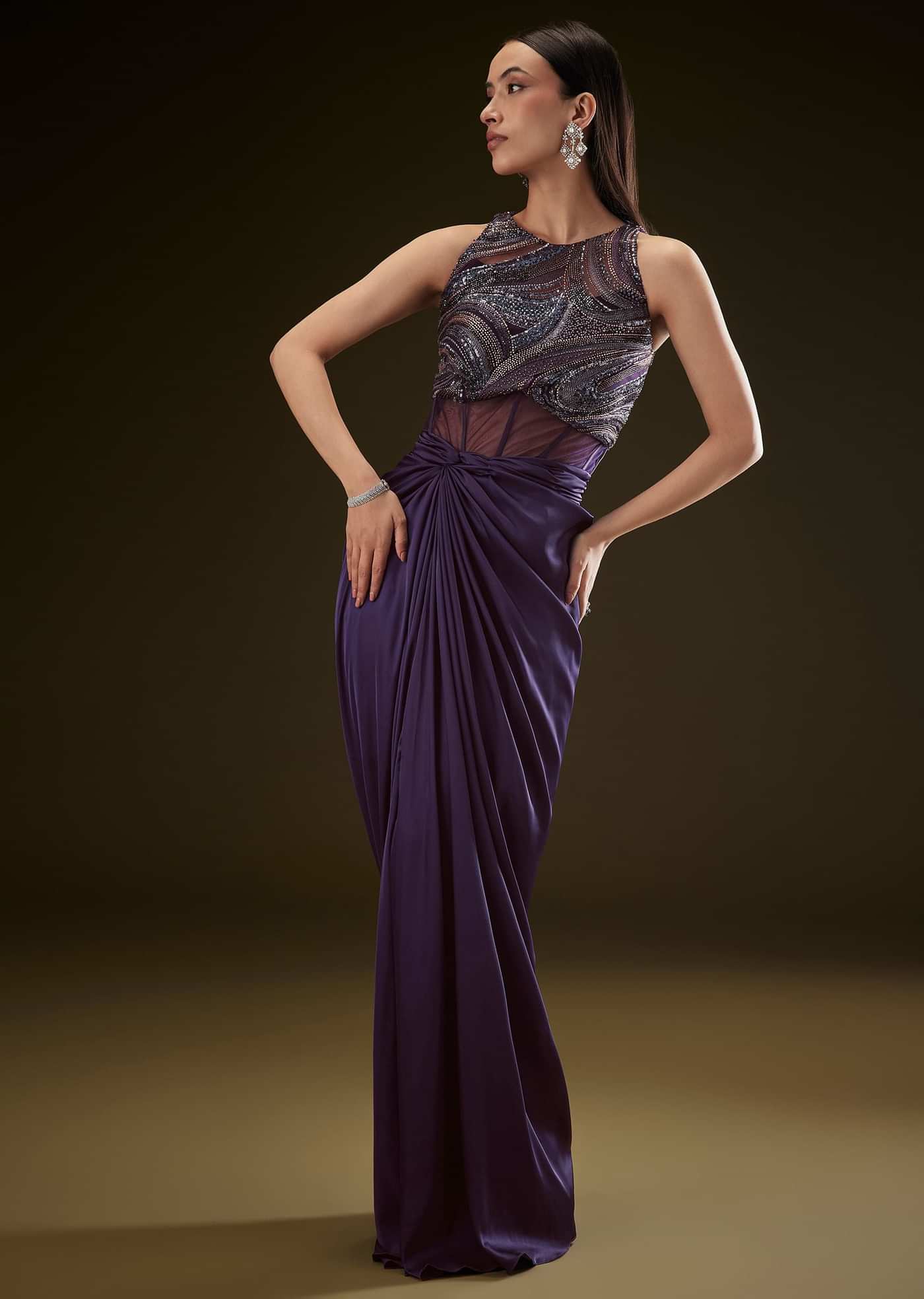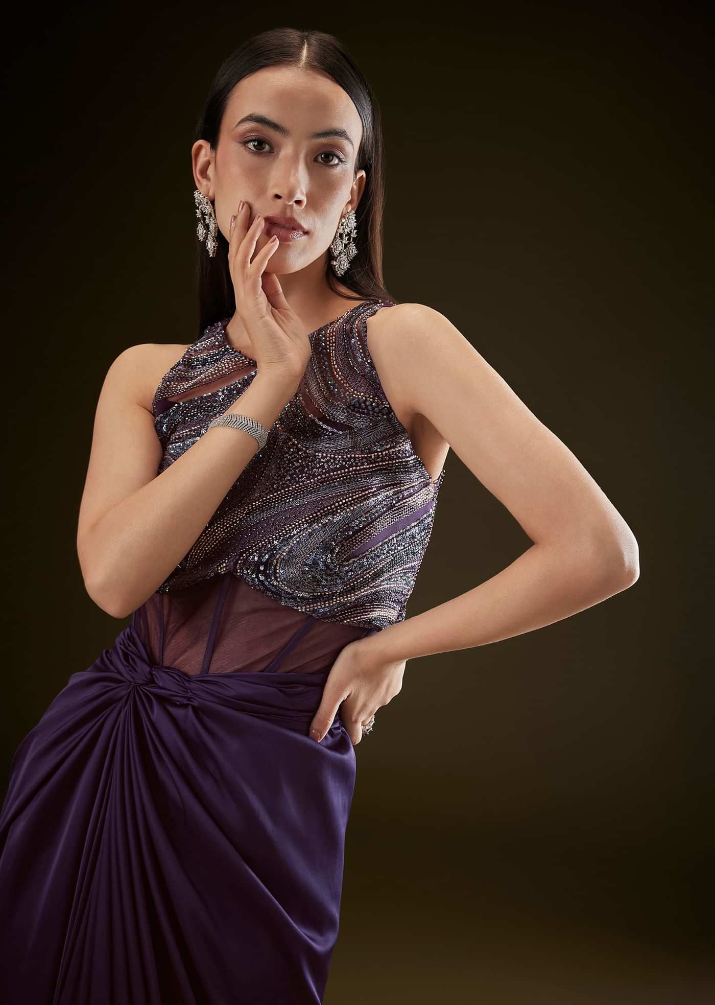 Violet High Neck Embroidered Corset Gown With Twisted Drape