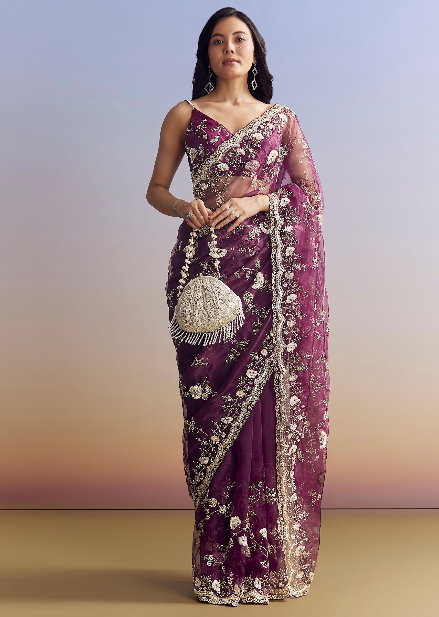 Violet Organza Saree With All Over Embroidered Floral Jaal