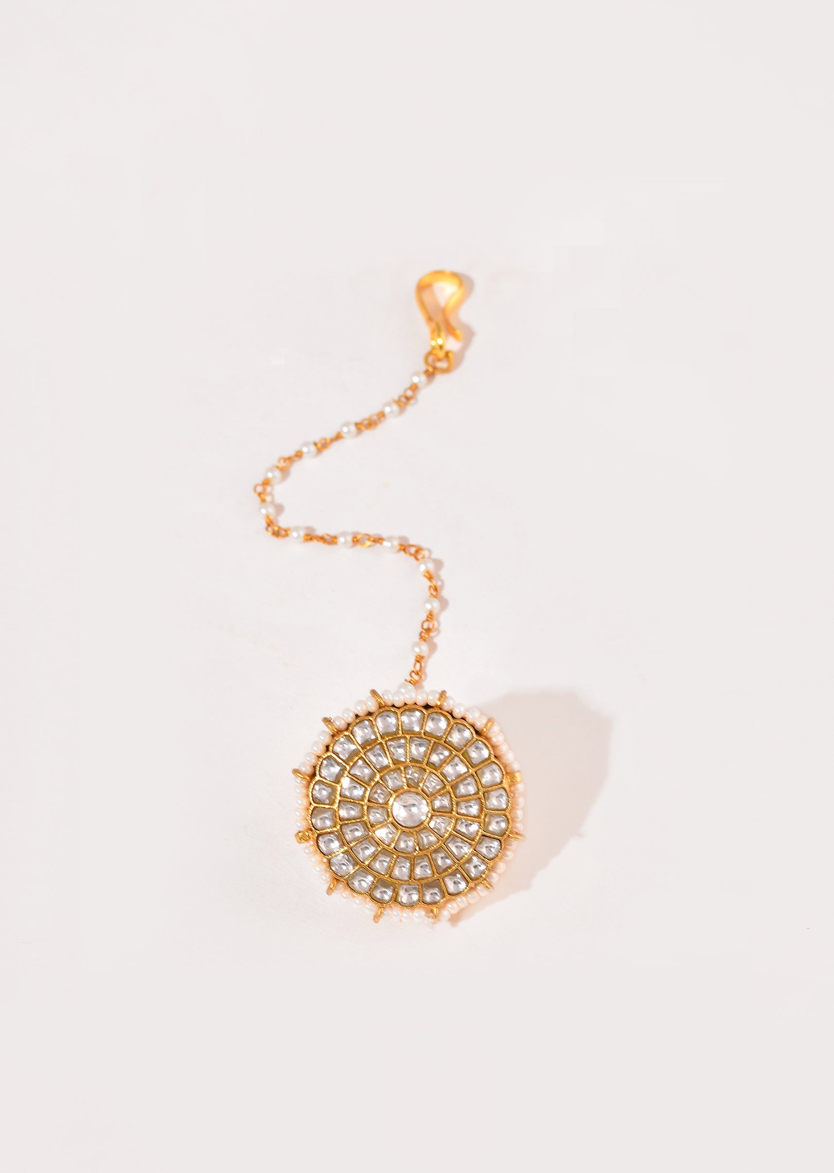 An elegant white and gold kundan maangtikka featuring finely set stones and traditional craftsmanship, designed to bring a touch of royal sophistication to your bridal or festive look. Awarded as... More Product Details