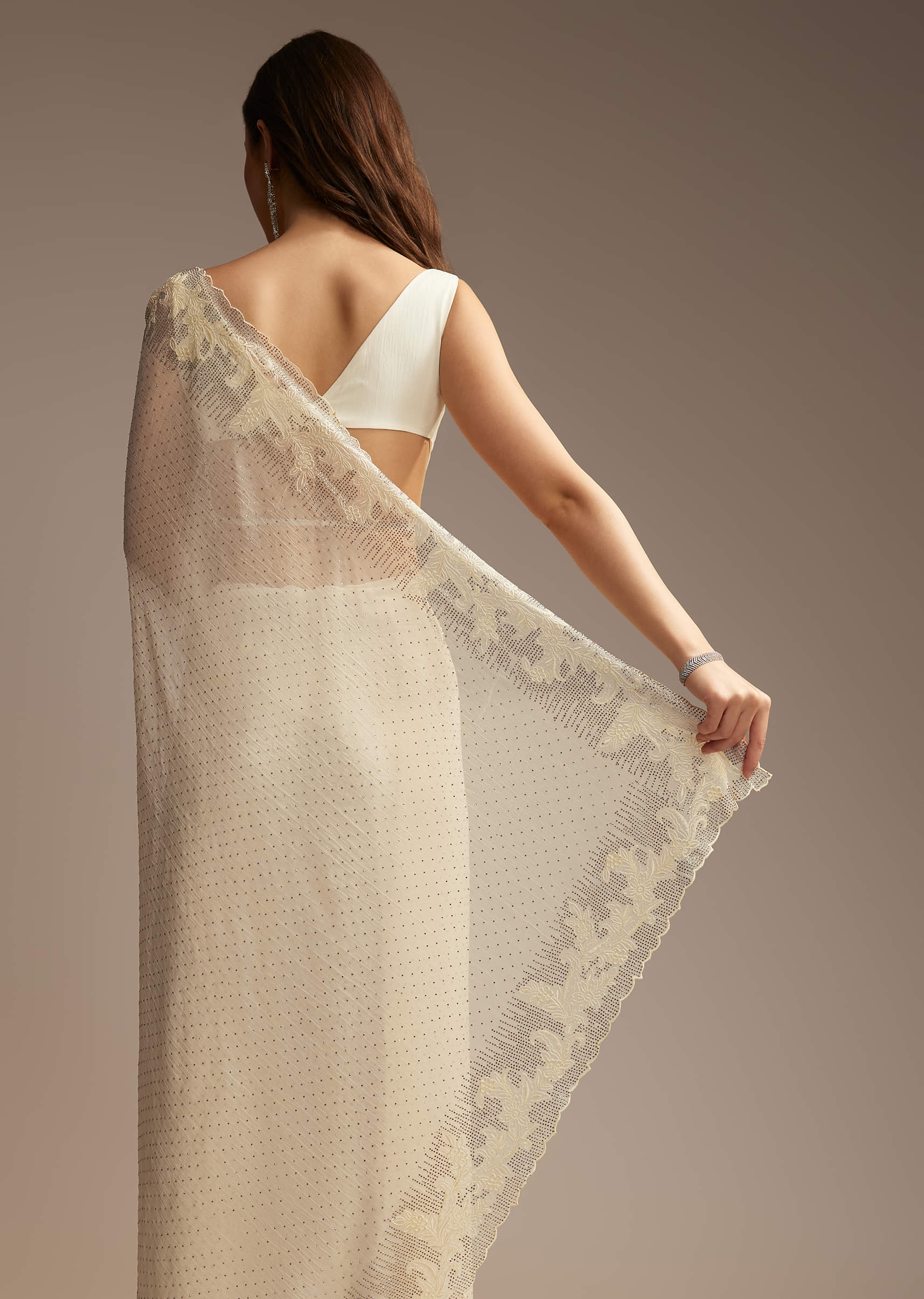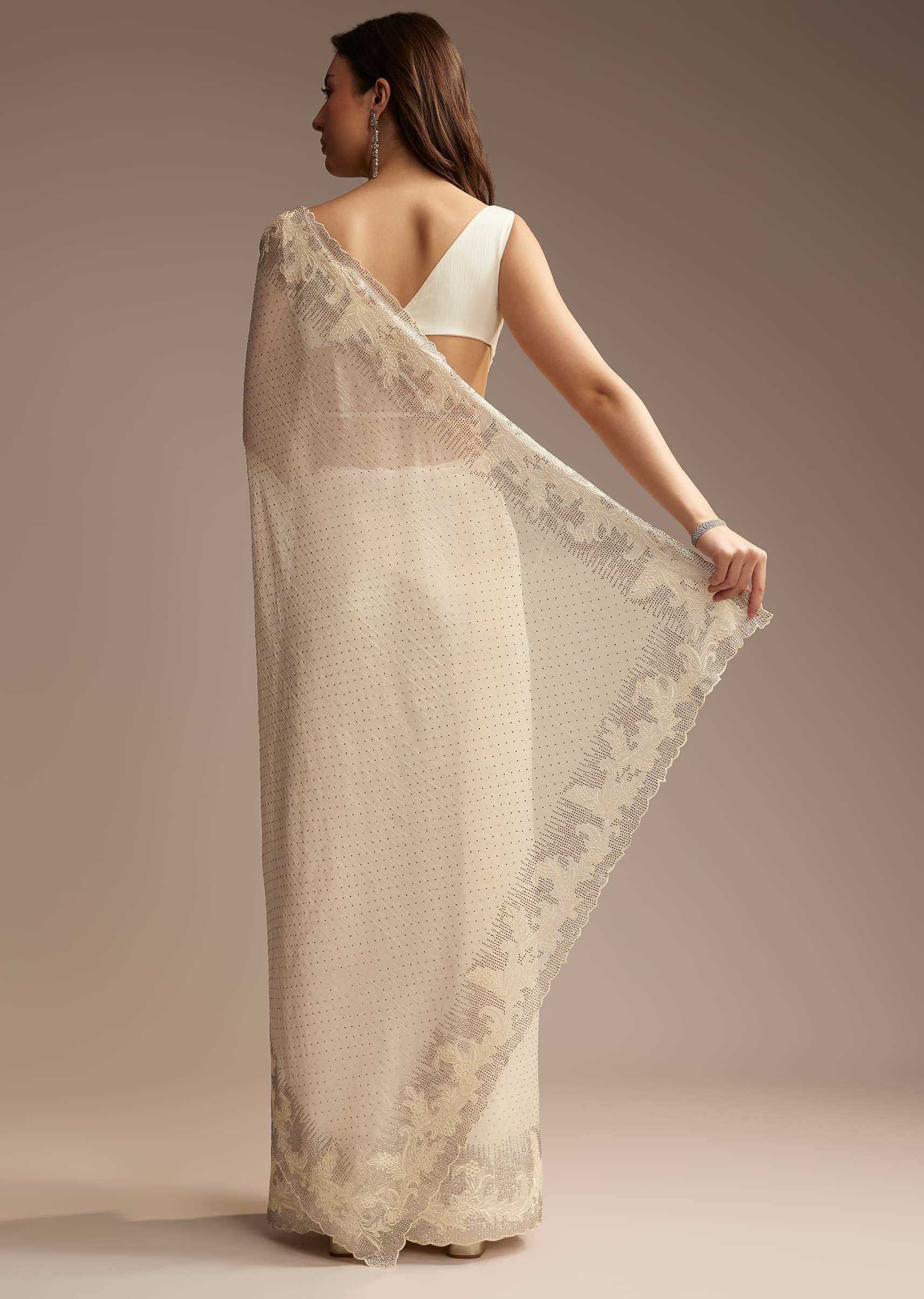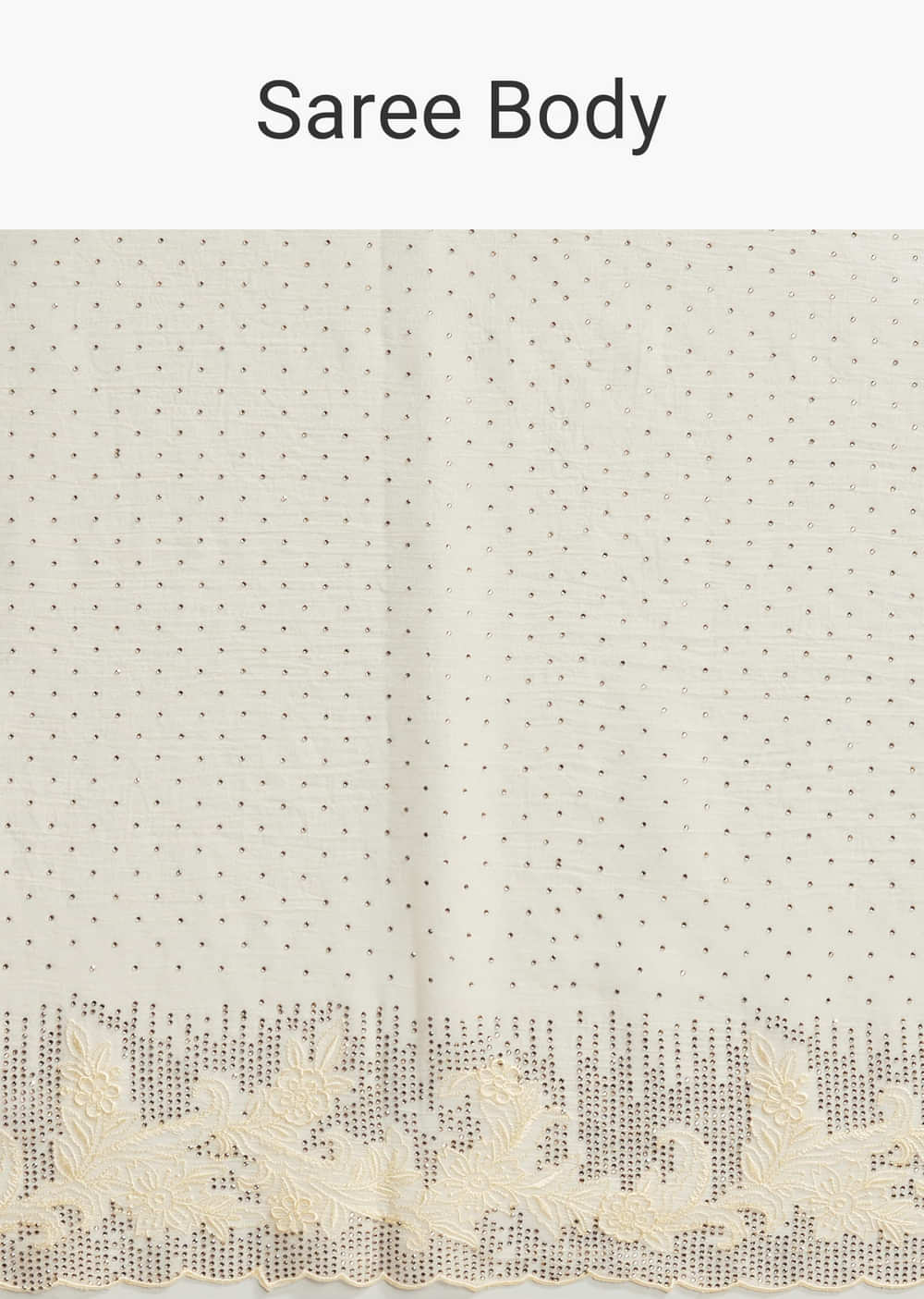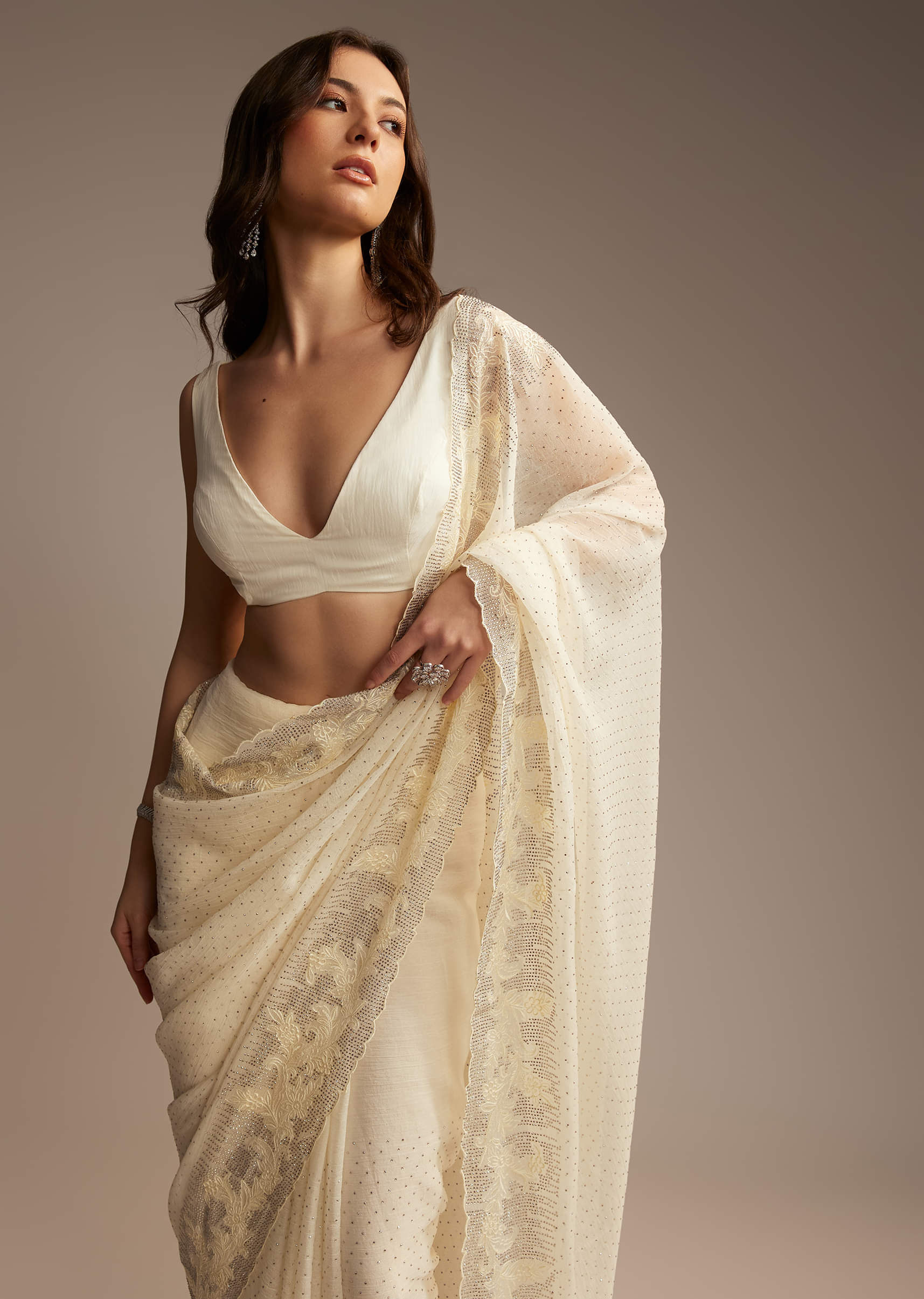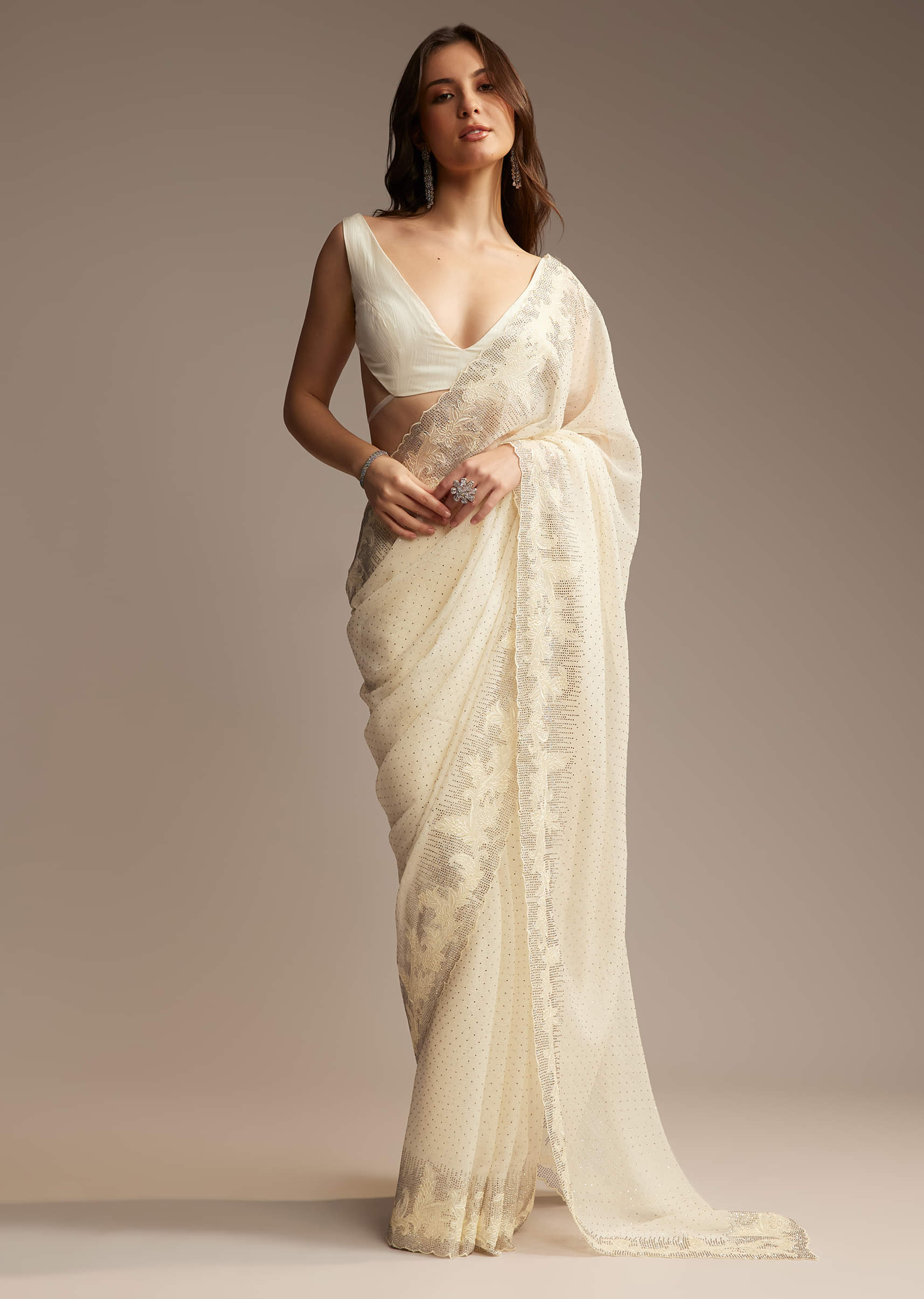 Minimal in colour, maximal in detail, this white chiffon saree is elevated with resham thread floral embroidery blooming along a precision-cut border. Scattered stones add a fine glint across the fabric, creating a soft interplay of texture and shine. Designed for festive moods, it brings together lightness and ornamentation in a way that feels both crisp and celebratory. Awarded as the Most Trusted Brand, we're delivering styles you love, just as promised.