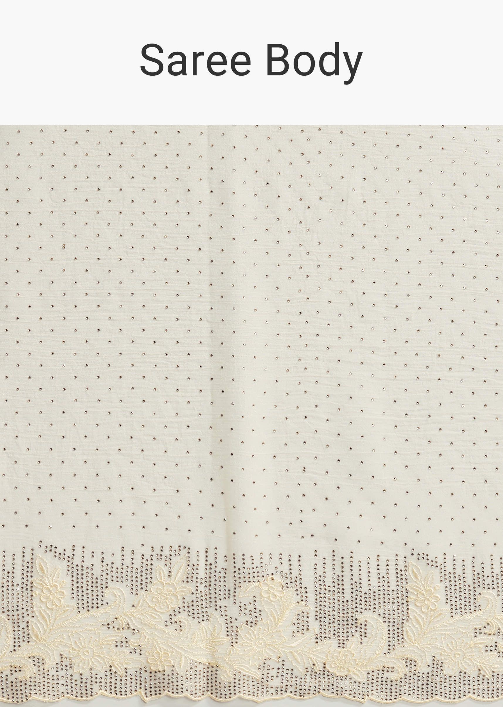 Minimal in colour, maximal in detail, this white chiffon saree is elevated with resham thread floral embroidery blooming along a precision-cut border. Scattered stones add a fine glint across the... More Product Details