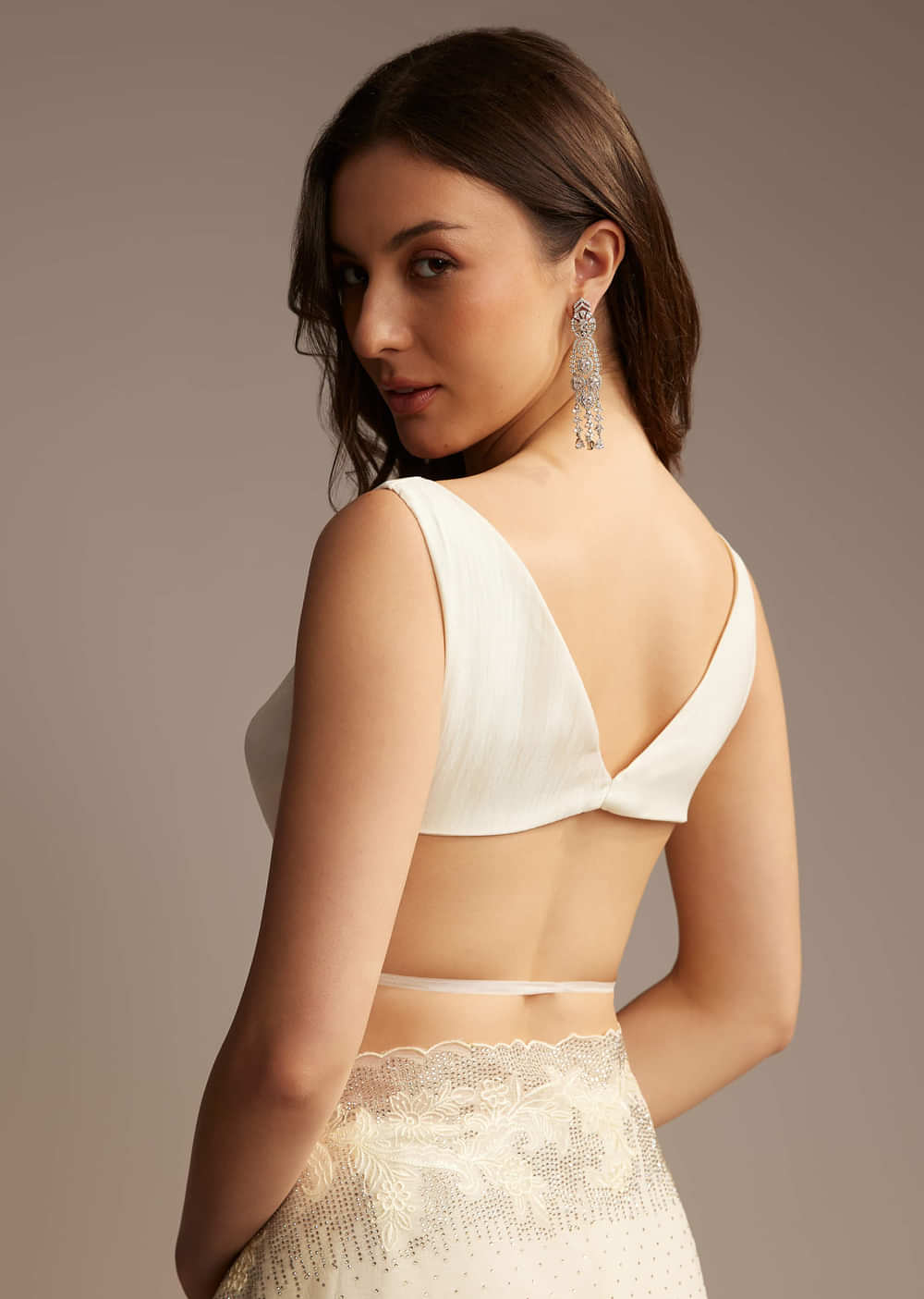 Fit Tips:Go for a matching sleeveless blouse with a plunging neckline to add contour and drama. Leave the pallu unpleated. It lets the embellishments catch the light with every move.
