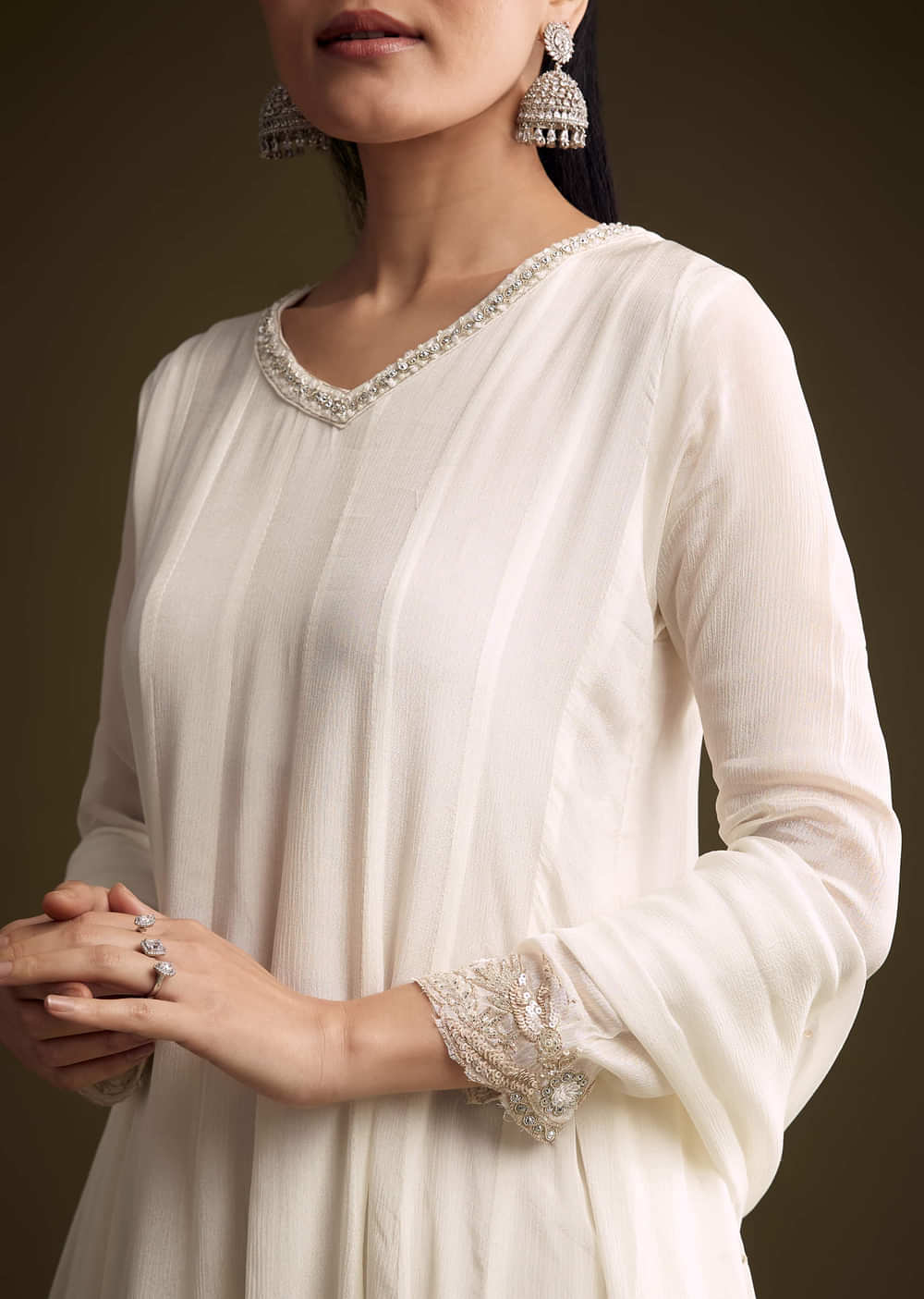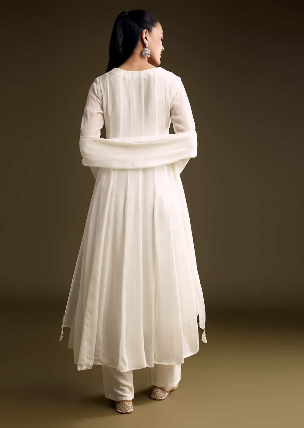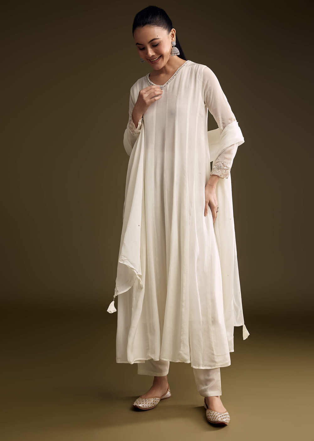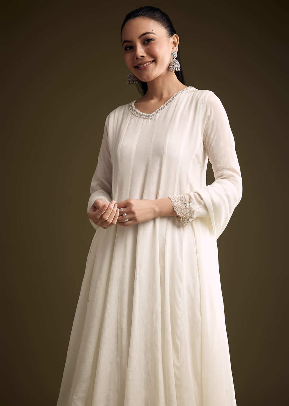 For minimal colour with clear sparkle, this white chinon anarkali suit keeps the silhouette clean and the shine intentional. Sequin embroidery accents the neckline and seams so the flare catches... More Product Details