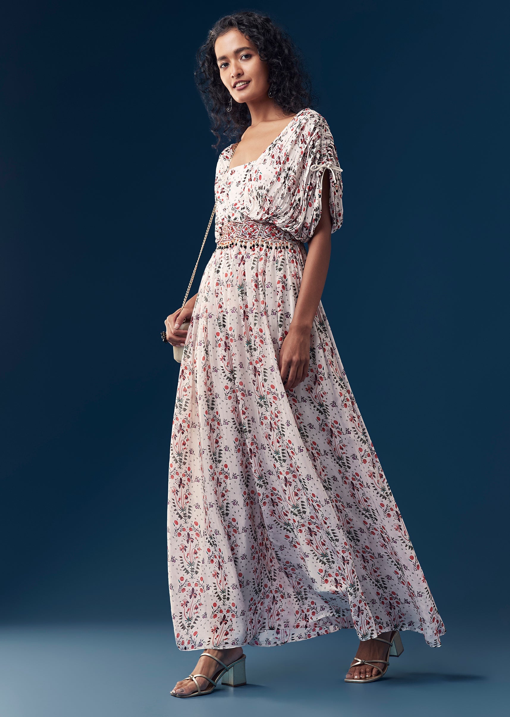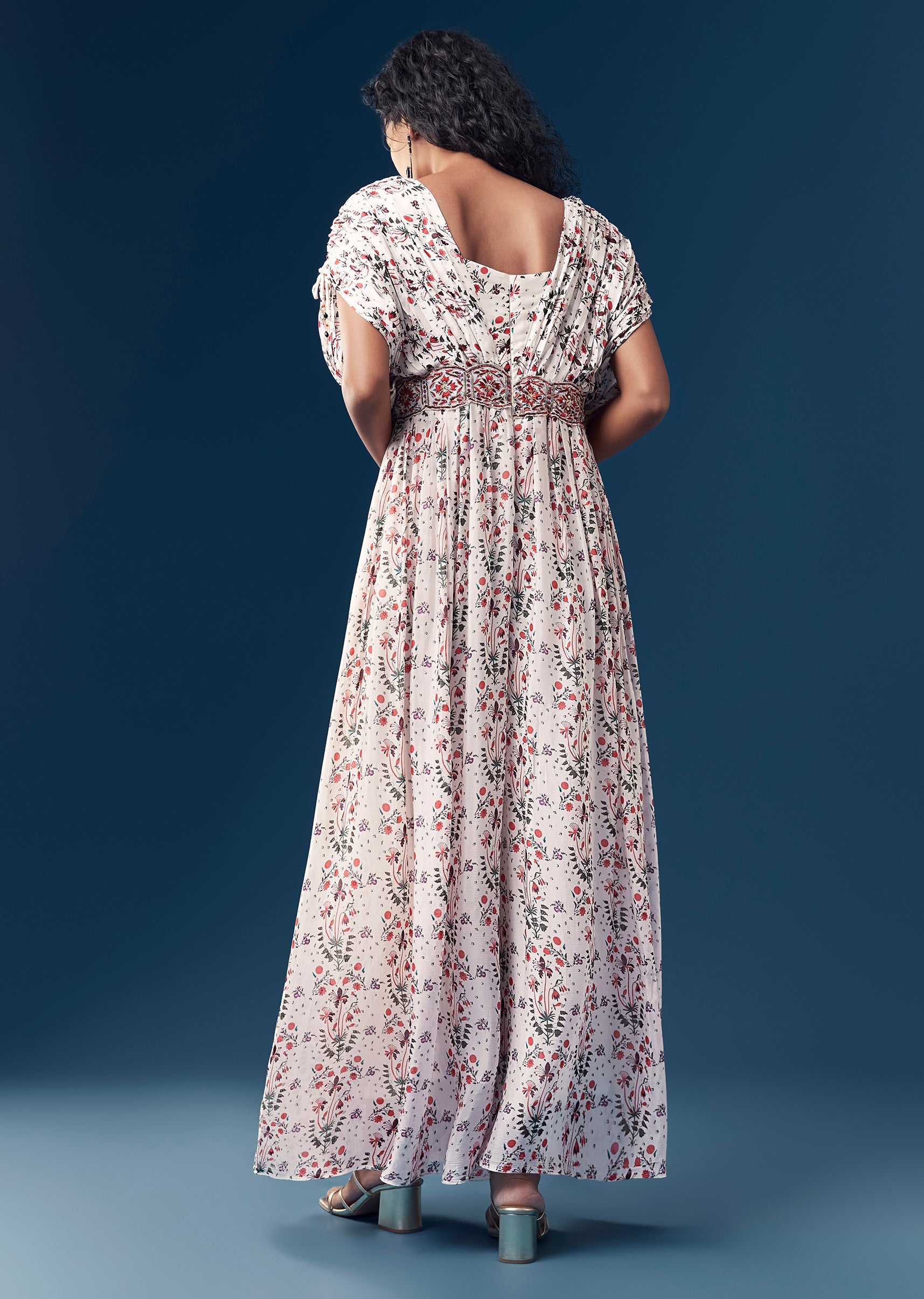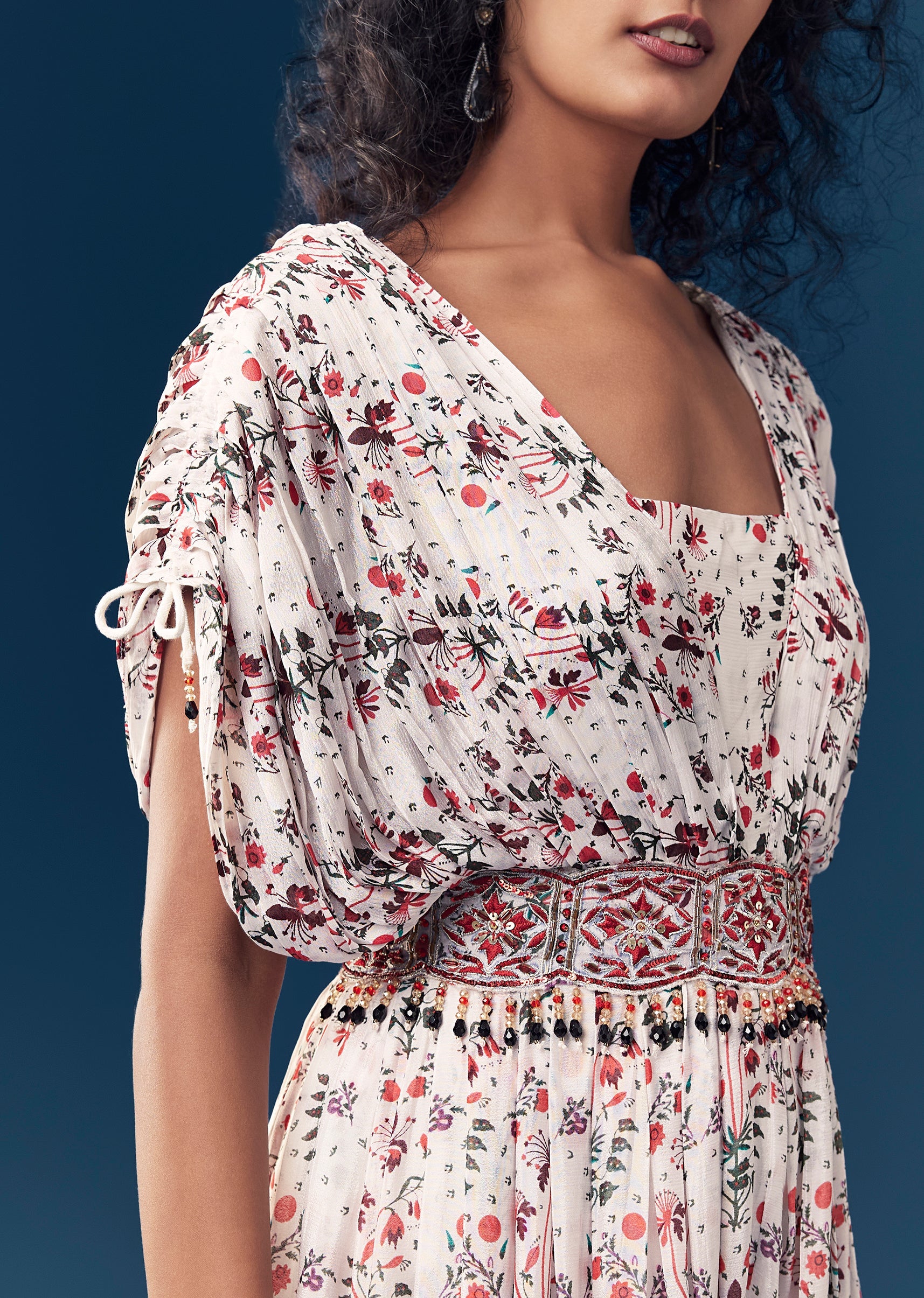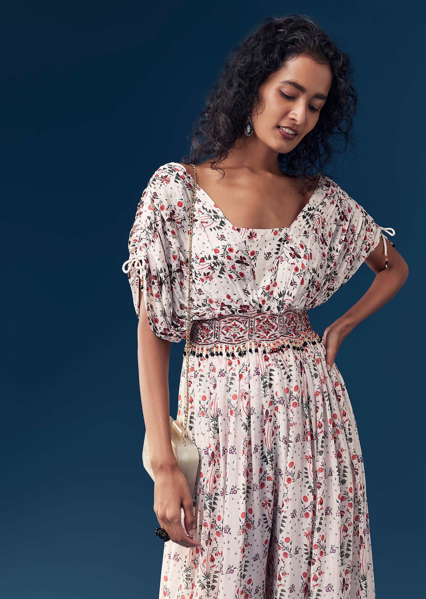 Effortlessly chic with a festive touch, this printed chinon jumpsuit is designed for modern statement dressing. The silhouette is elevated with delicate resham and sequin work on the waist belt,... More Product Details
