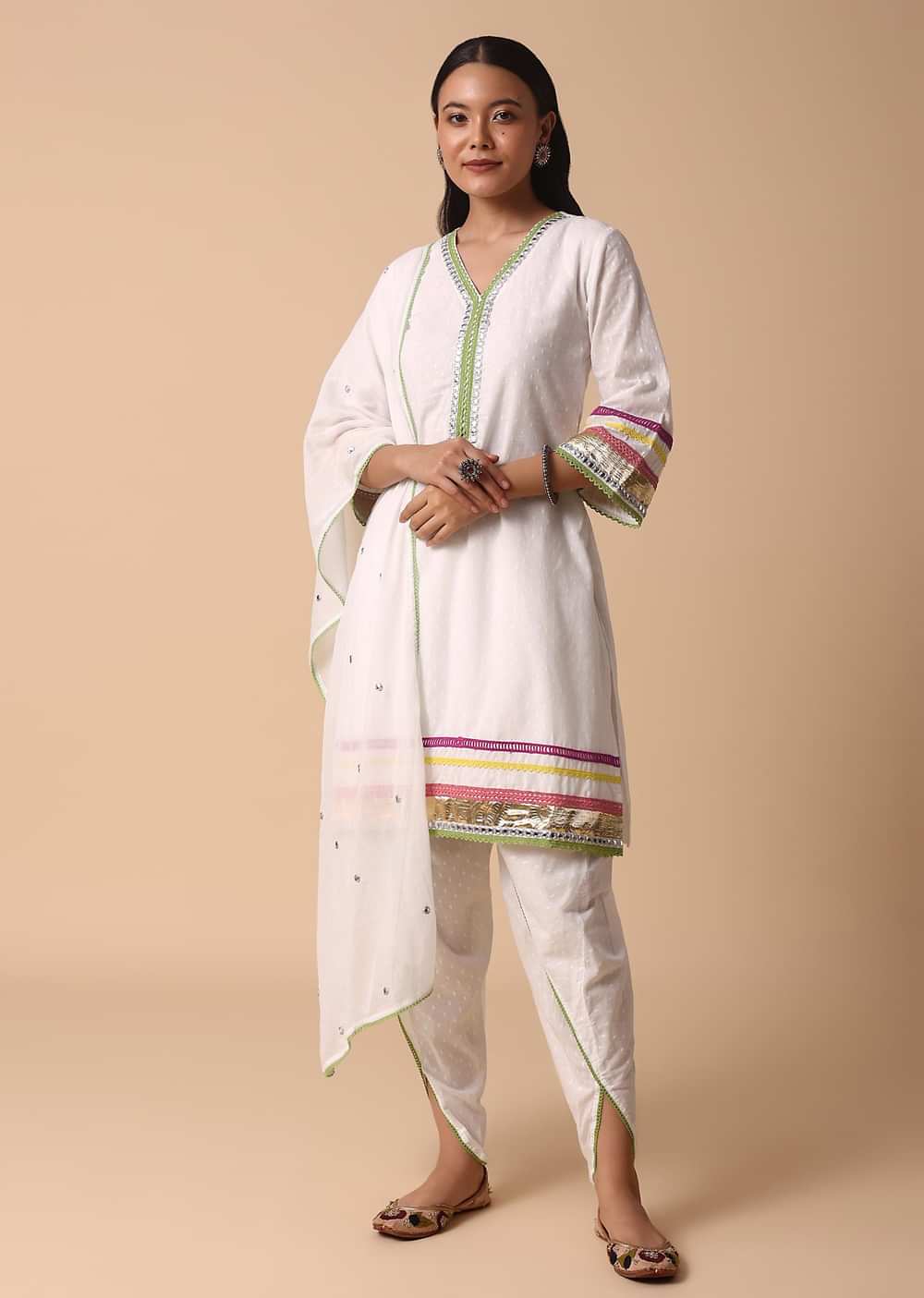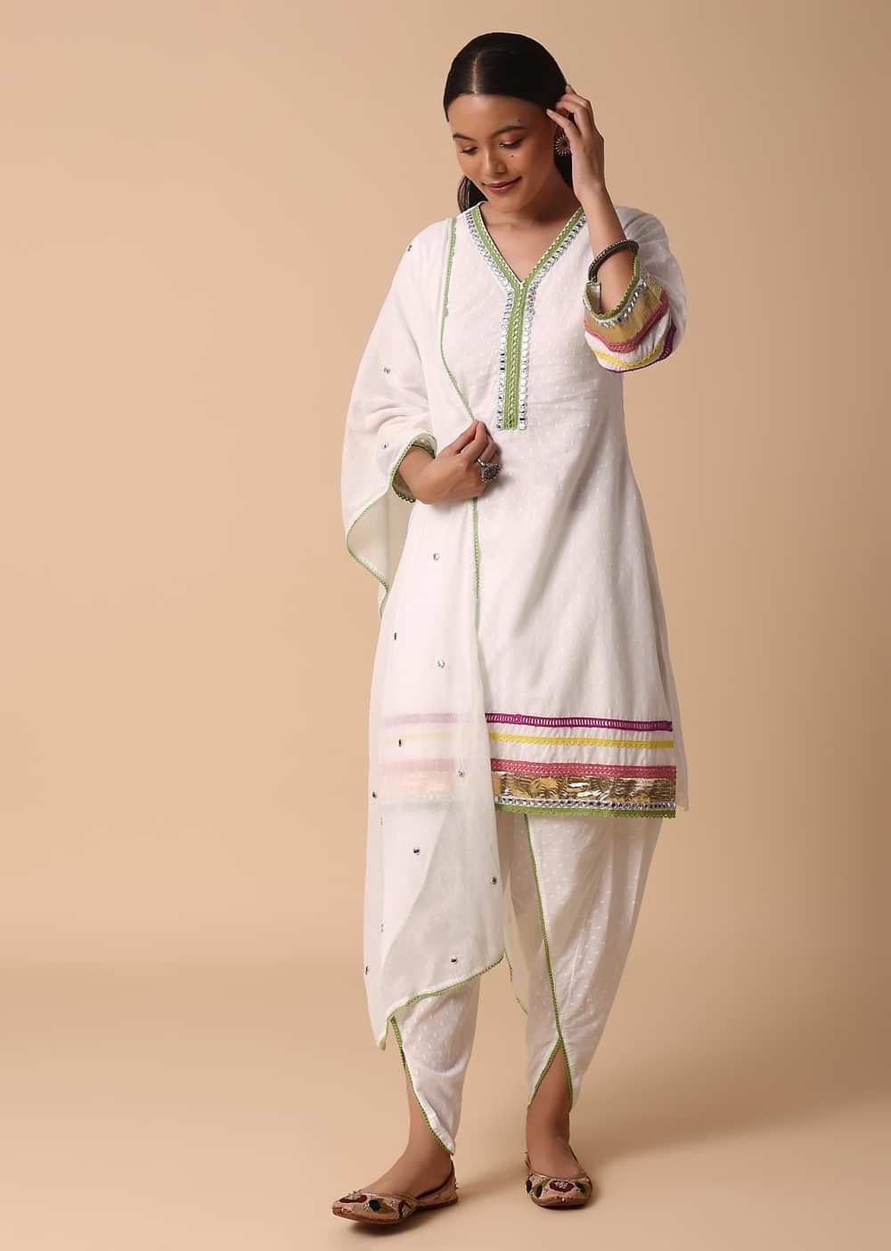 • White Cotton Kurta Dhoti SetThis outfit is made from cotton fabric and adorned with mirror embroidery work.