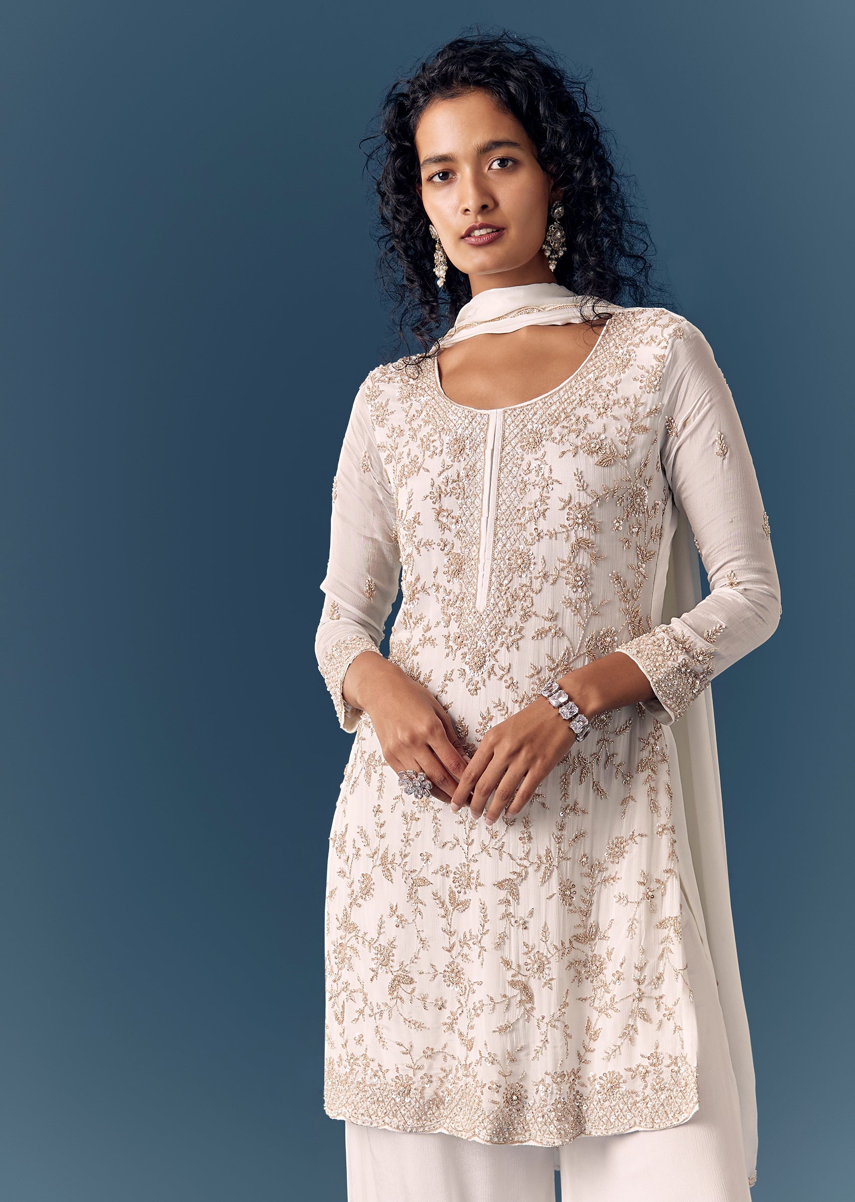 White Cut Dana Kurta Palazzo Set With Dupatta