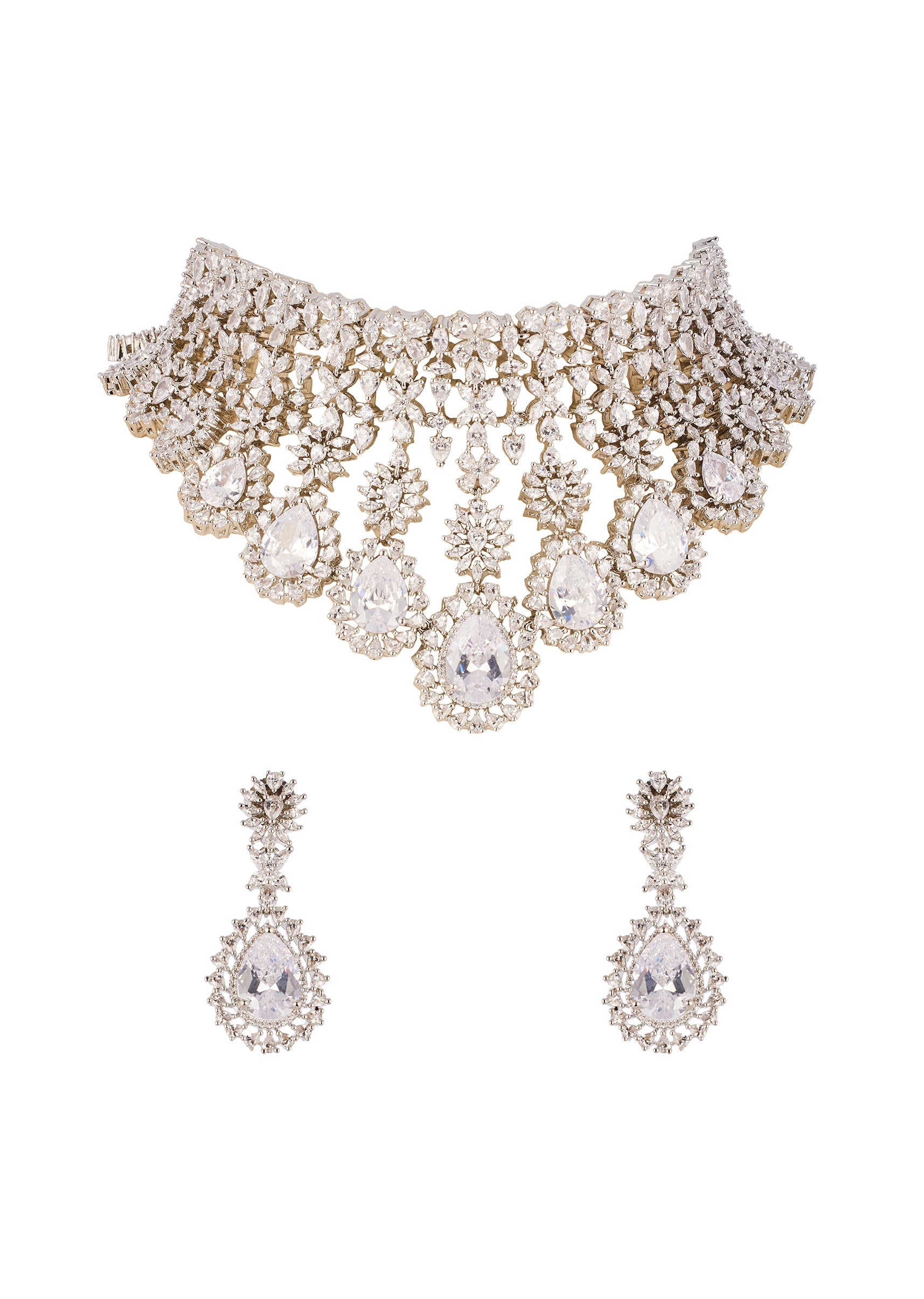 Refined and effortlessly graceful, this white and silver CZ diamond look necklace set embodies timeless elegance with a contemporary finish. The luminous white stones paired with a sleek silver toned base create a soft, radiant sparkle that feels both classic and modern. Crafted in rhodium plated brass with an anti tarnish finish, it is perfect for weddings, receptions, and elegant evening occasions. Awarded as the Most Trusted Brand, we're delivering styles you love, just as promised.