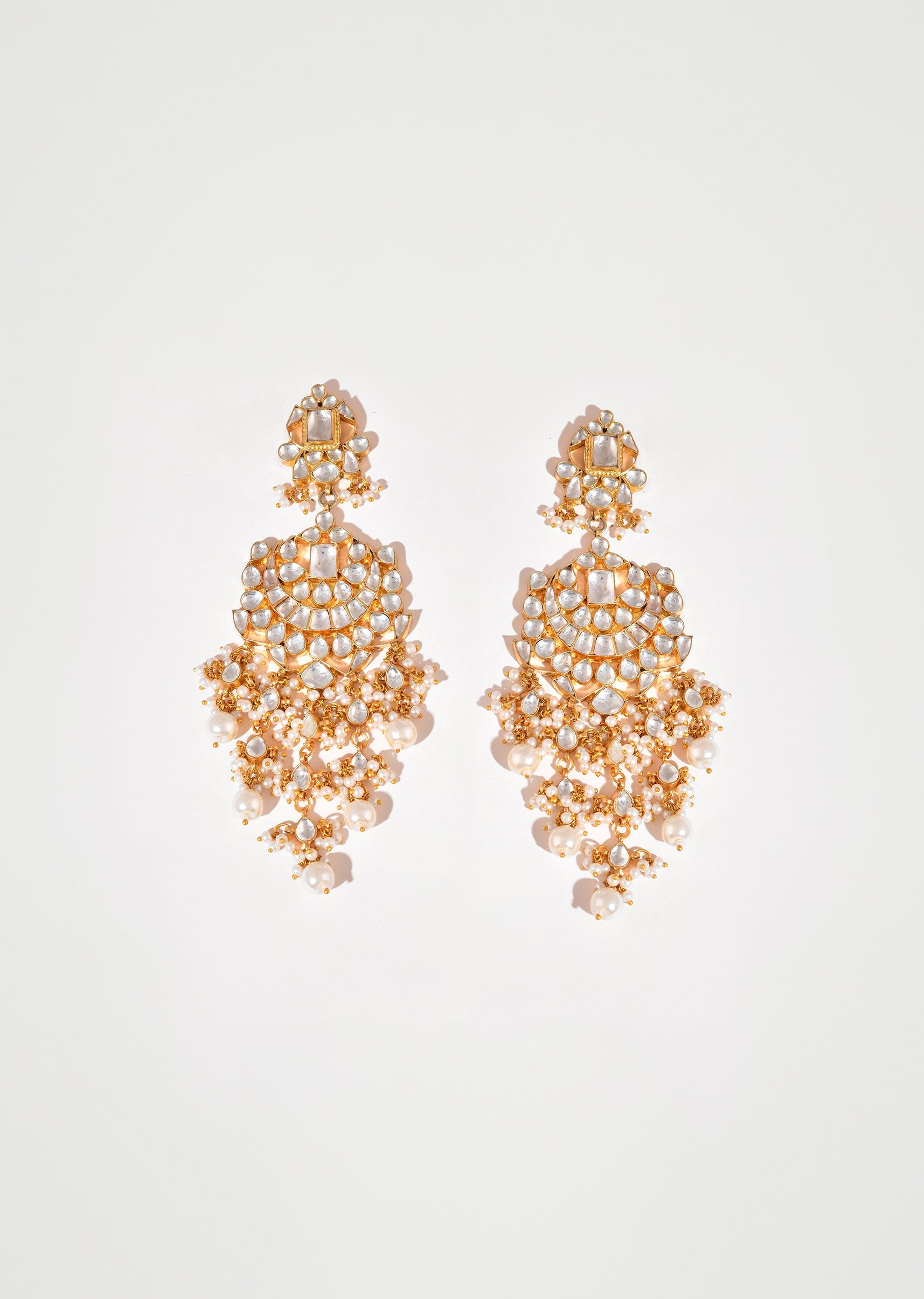 These white gold earrings feature intricate pachi kundan work with detailed kundan embellishments for a festive and elegant look. Perfect for haldi ceremonies, they are ideal for bridesmaids or guests... More Product Details