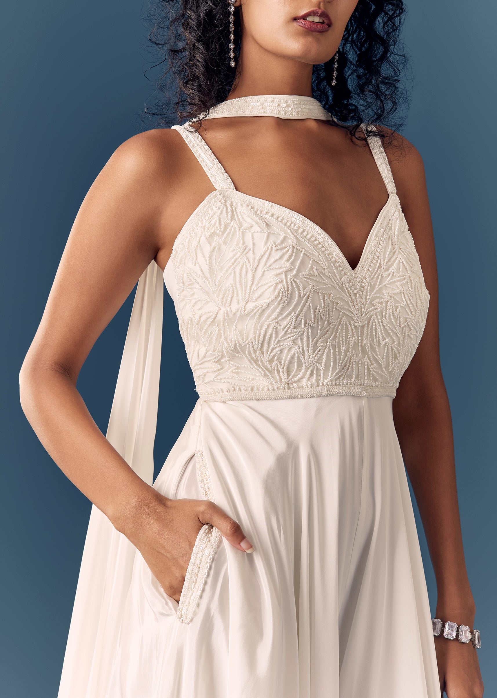 A modern festive white jumpsuit with moti and cut dana embellishment. Sleeveless with sweetheart neckline and a back zip closure, paired with a dupatta—perfect for reception and engagement events. Awarded... More Product Details